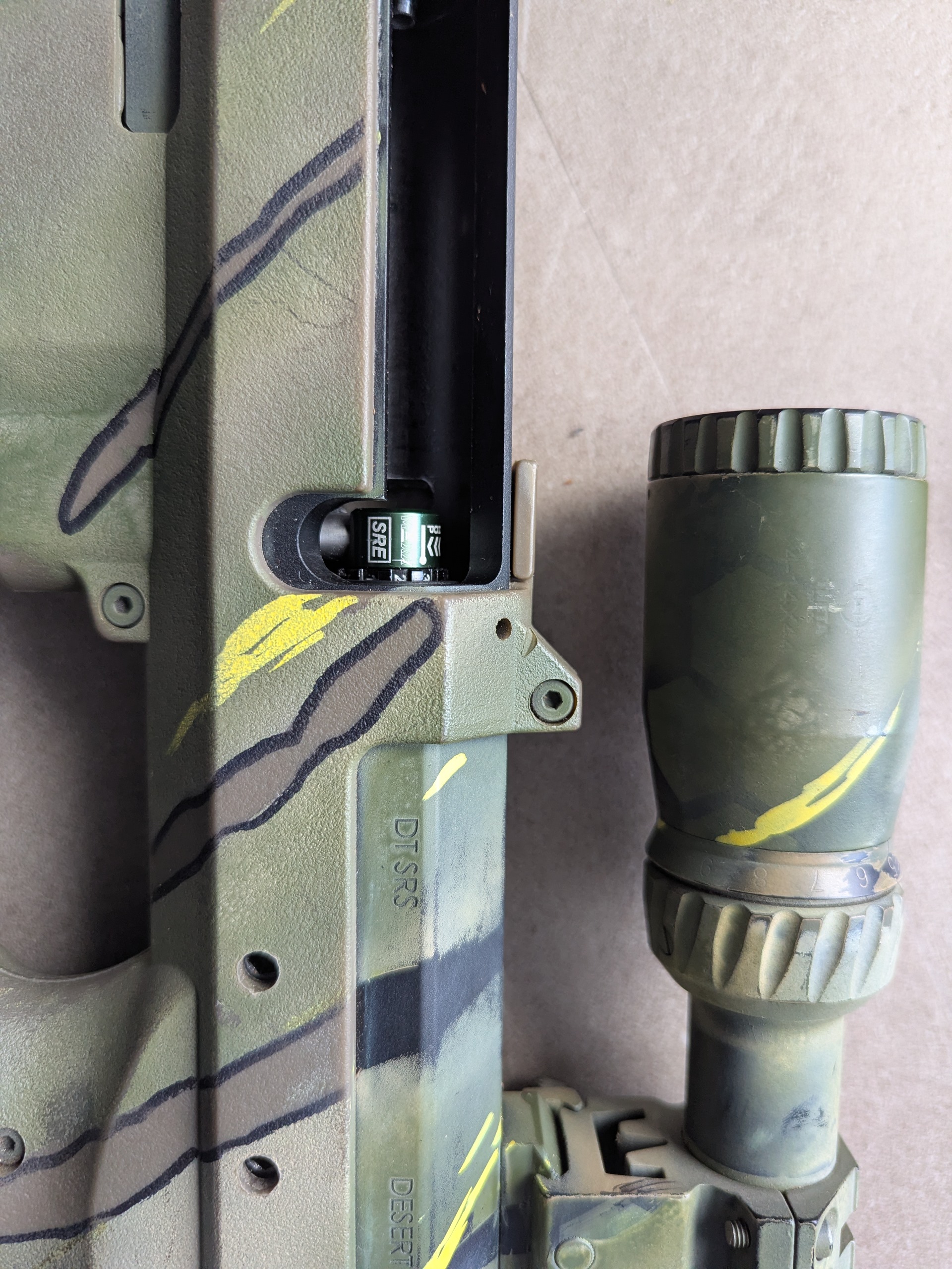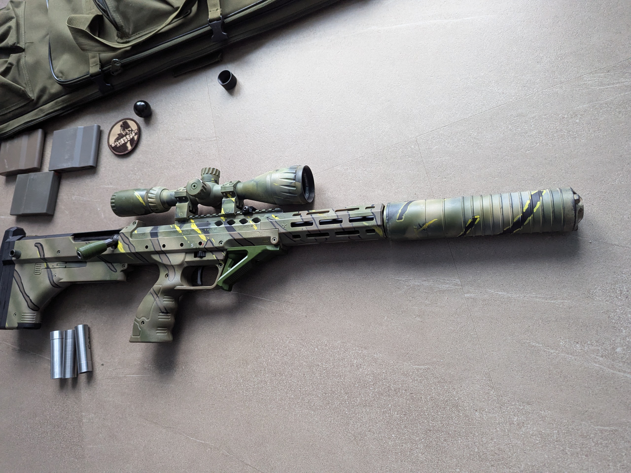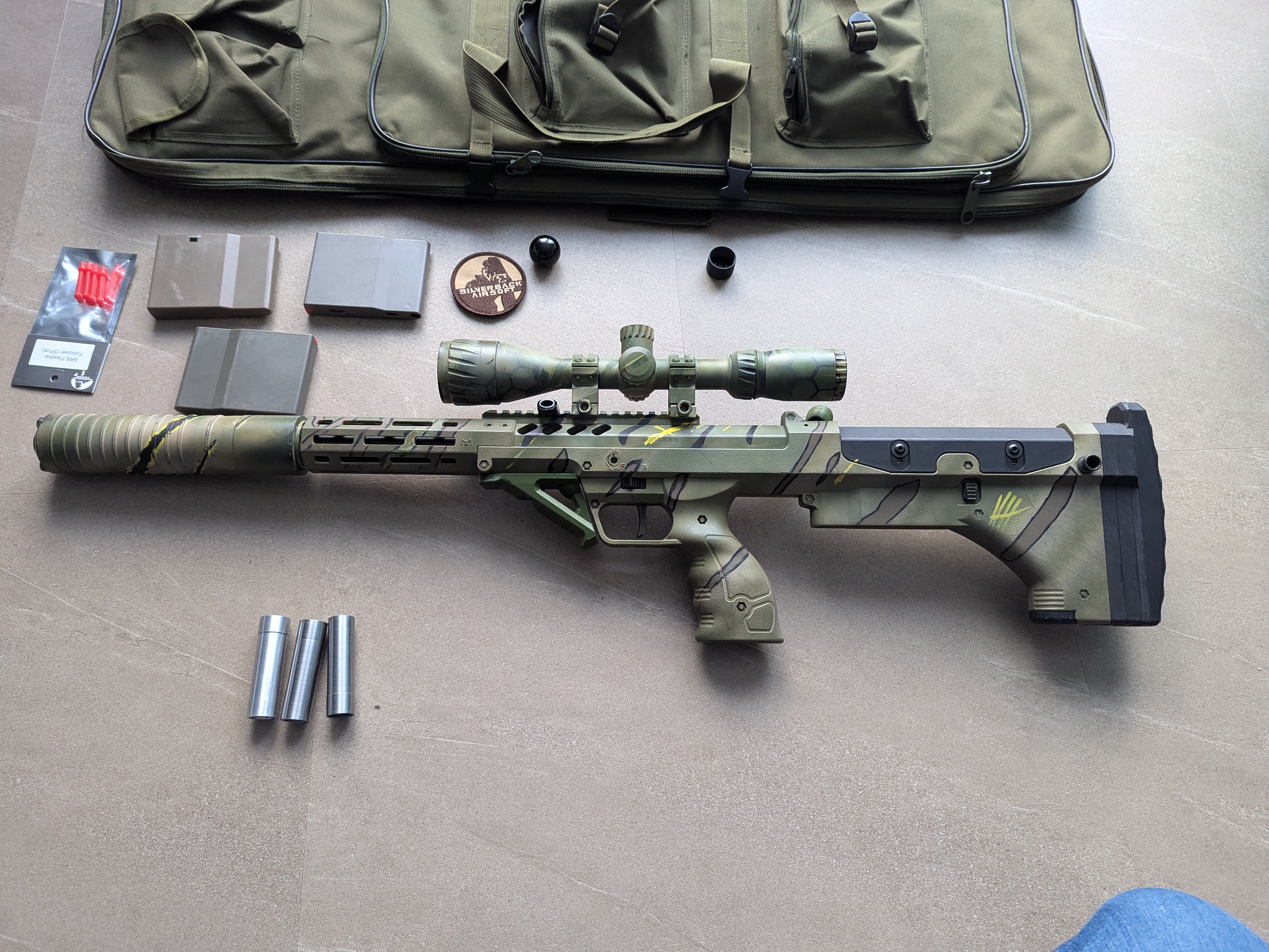 Na sprzedaż wystawiam karabin snajperski SRS A2 16 Sport od Silverback Karabin po tuningu: -zestaw od barta prowadnica oraz tłok z hamulcem oraz ciężary do zmiany wagi tłoka -komora hop up Maxx model ,gumka silverback 80 -Lufa LayLax Prometheus 550 mm, ø6,03 z powiększonym ręcznie oknem. -tłumik 5KU AK z przerobionym gwintem -druk 3d chwyt dolny oraz chwyt dźwigni przeładowania -sprezyna Rapax 4j -luneta 3-9x40 że zmienna paralaksą Dodatkowo 3 magi polimerowe, pokrowiec, popychacze do magazynków, orginalny chwyt przeładowania, zaślepka lufy oraz moralepatch. Zawieszenie na pas nie wchodzi w zestaw widoczny na zdjęciach. Karabin przestrzelany z zasięgiem 100 m+ ,dobrze wyciszony, lekki. Zapraszam do sprawdzenia osobistego.