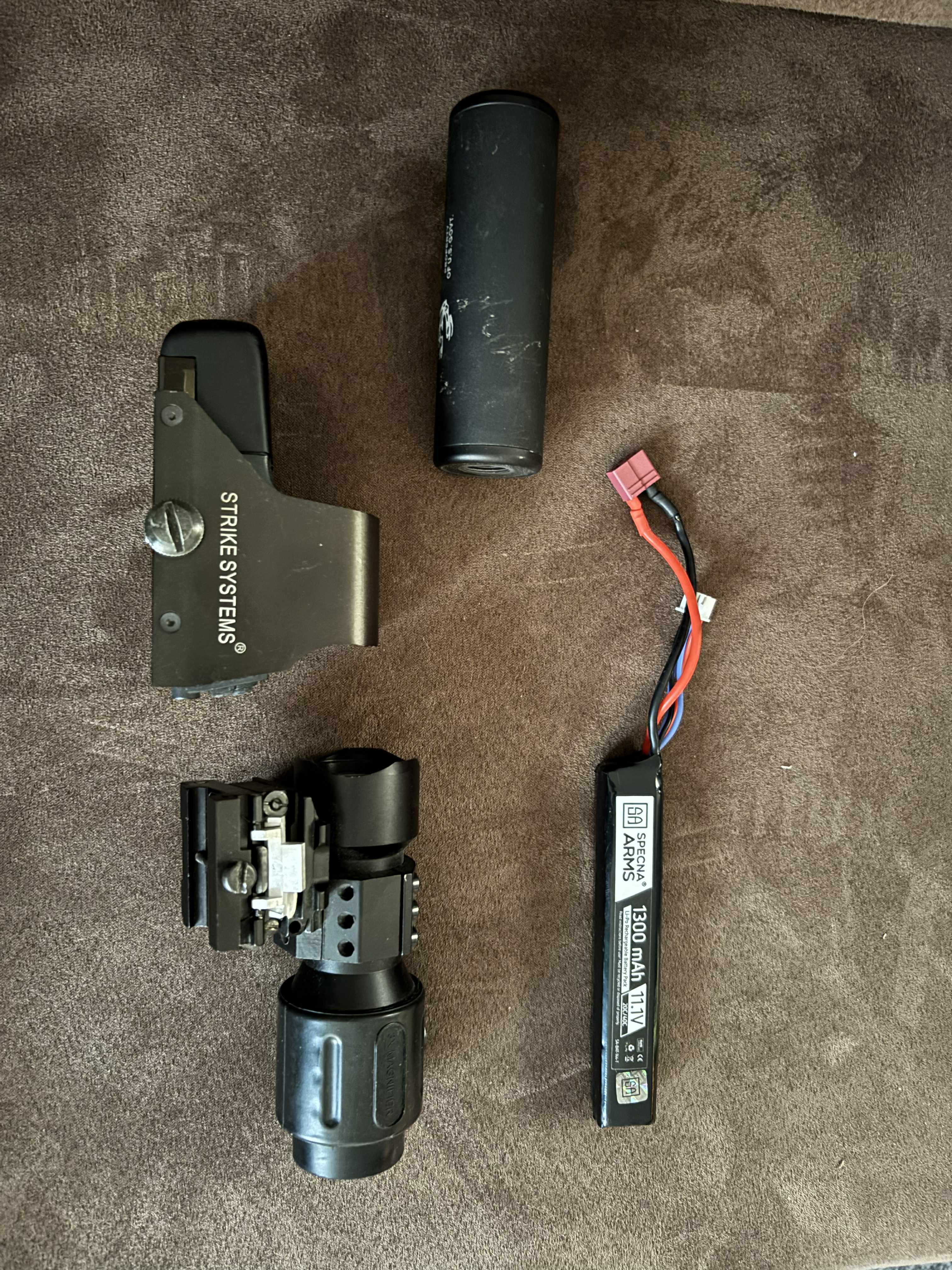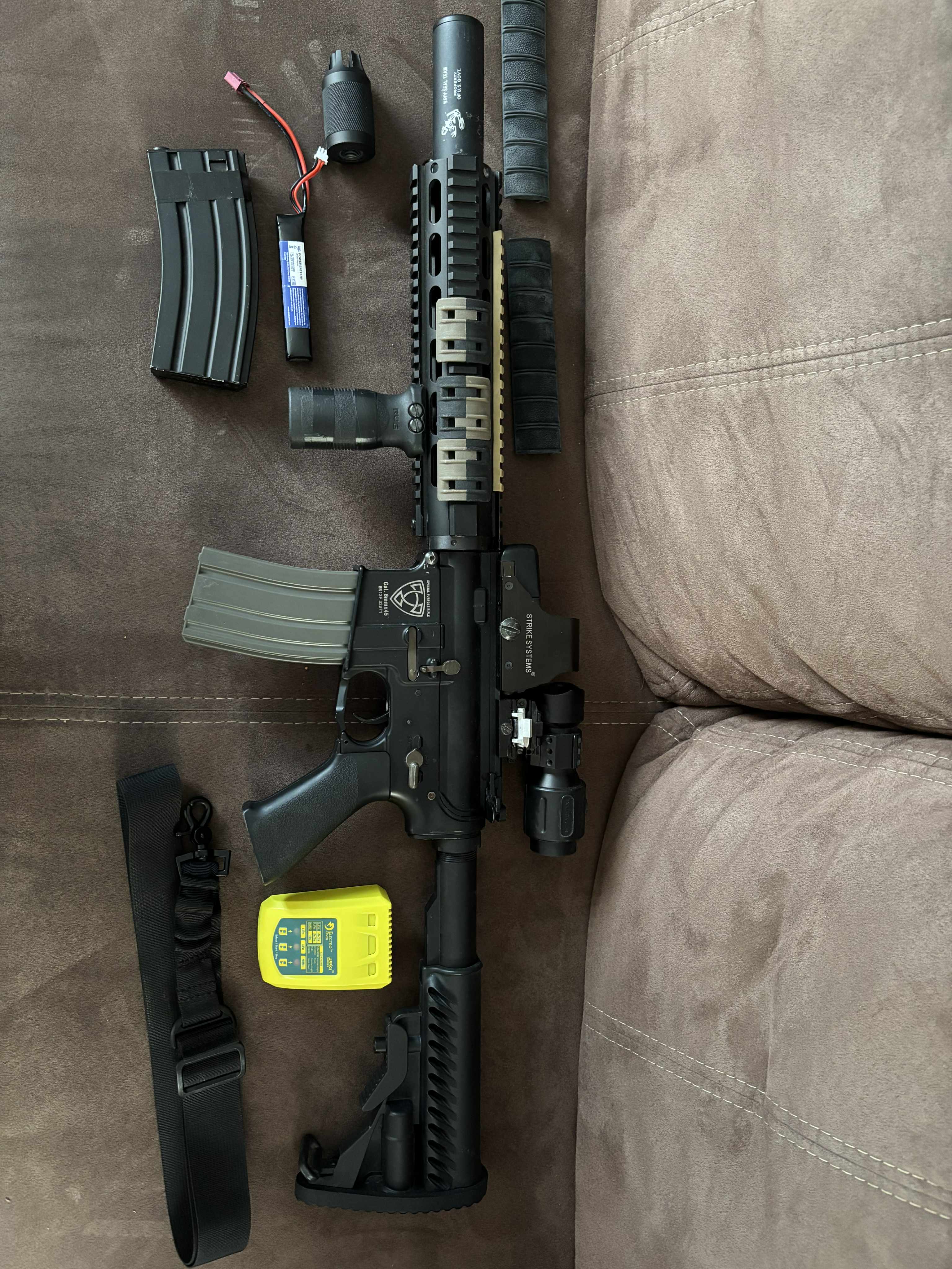 Witam, na sprzedaż replika karabinka M4 zrobiona i zmodyfikowana na specjalne zamówienie. Karabinek posiada następujące części: - szkielet GP Ultimate, - zębatki 16:1, - mosfet gate asr, - silnik guarder high speed, - lufa promyk 6.03, - perun v2 hybrid. Replikę posiadam już jakiś czas i zawsze byłem z niej zadowolony, na tych częściach strzela niesamowicie, skuteczny zasięg wynosi około 60-70m, a prędkość wylotowa na kulkach 0,25g wynosi około 410fps, posiada drobne ślady użytkowania. Sprzedaje ponieważ kończę swoją przygodę z ASG. W podstawowym zestawie dorzucam akcesoria do szyny przedniej, pas jednopunktowy, chwyt przedni, laser, ładowarkę, baterię li-po 1100mAh oraz dwa magazynki (high cap, low cap) - 1000zł, lub wszystko wymienione powyżej i dodatkowo kolimator, magnifer x3, tłumik i bateria 1300mAh - 1300zł. Cena do negocjacji. Odbiór osobisty lub kurier InPost.