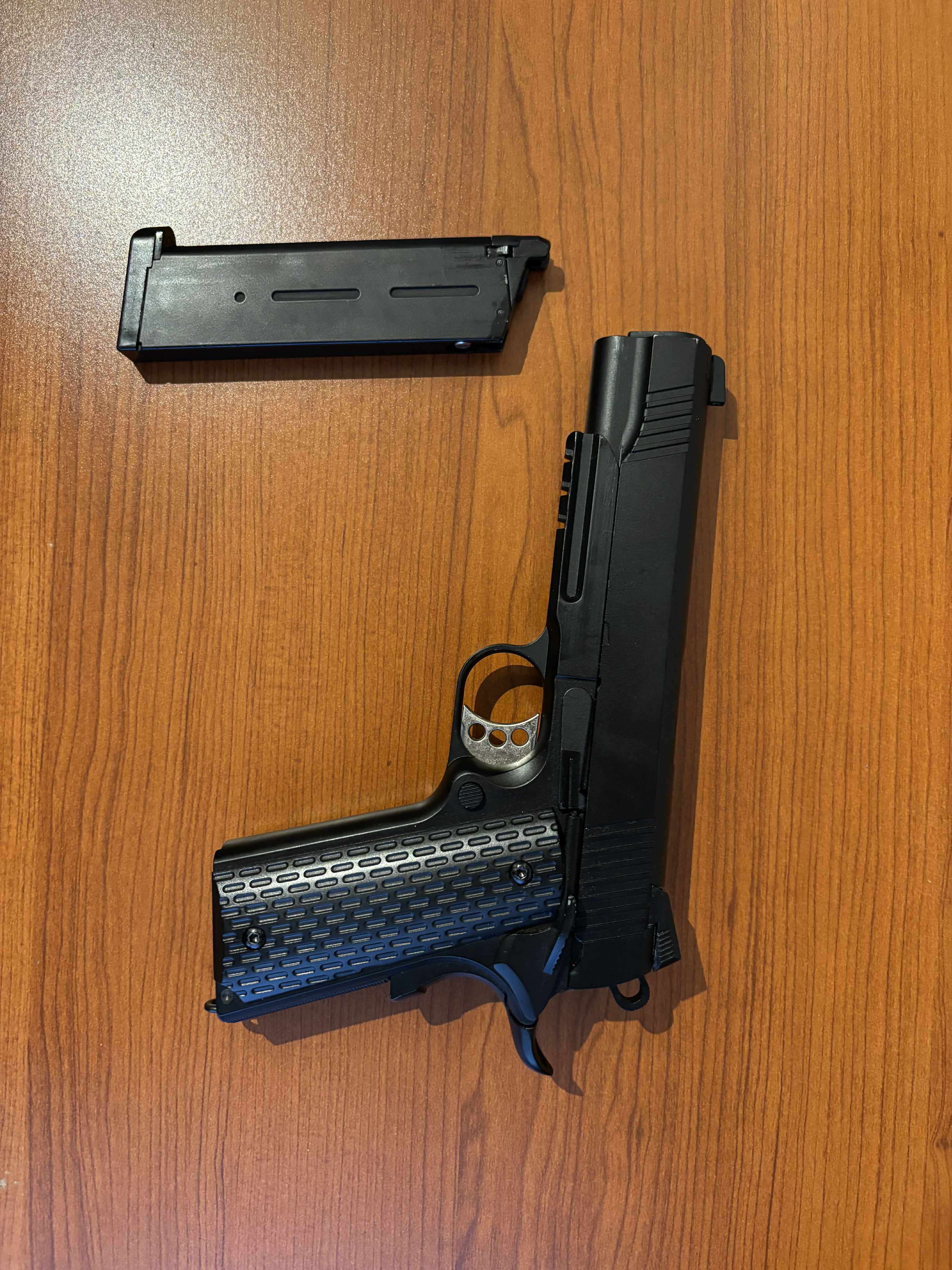 Replika pistoletu M1911 od firmy Army Armament, model R28 na green gas oraz systemem blowback. Pistolet ma lekkie ślady użytkowania lecz działa bez problemów. W zestawie z magazynkiem.