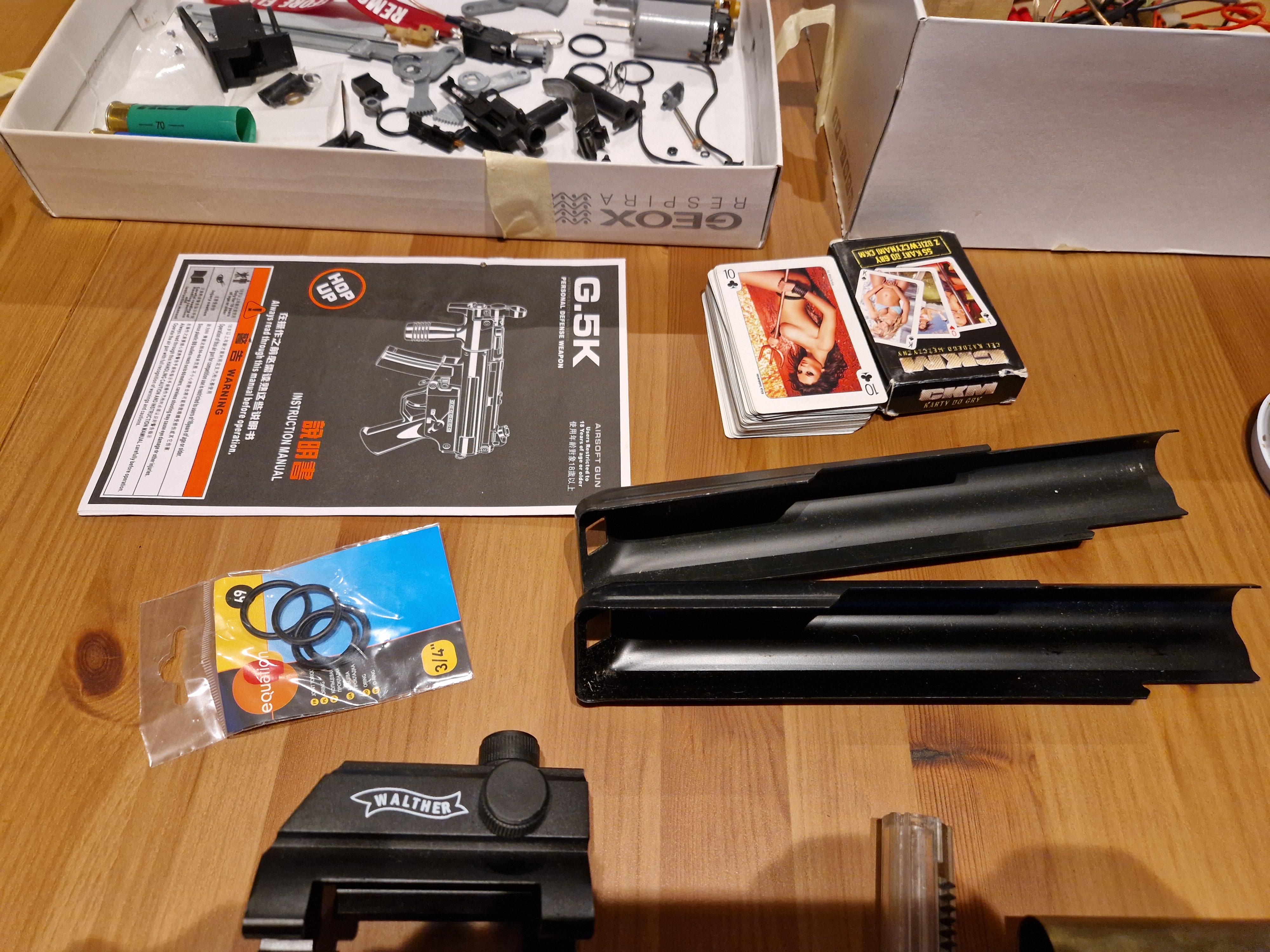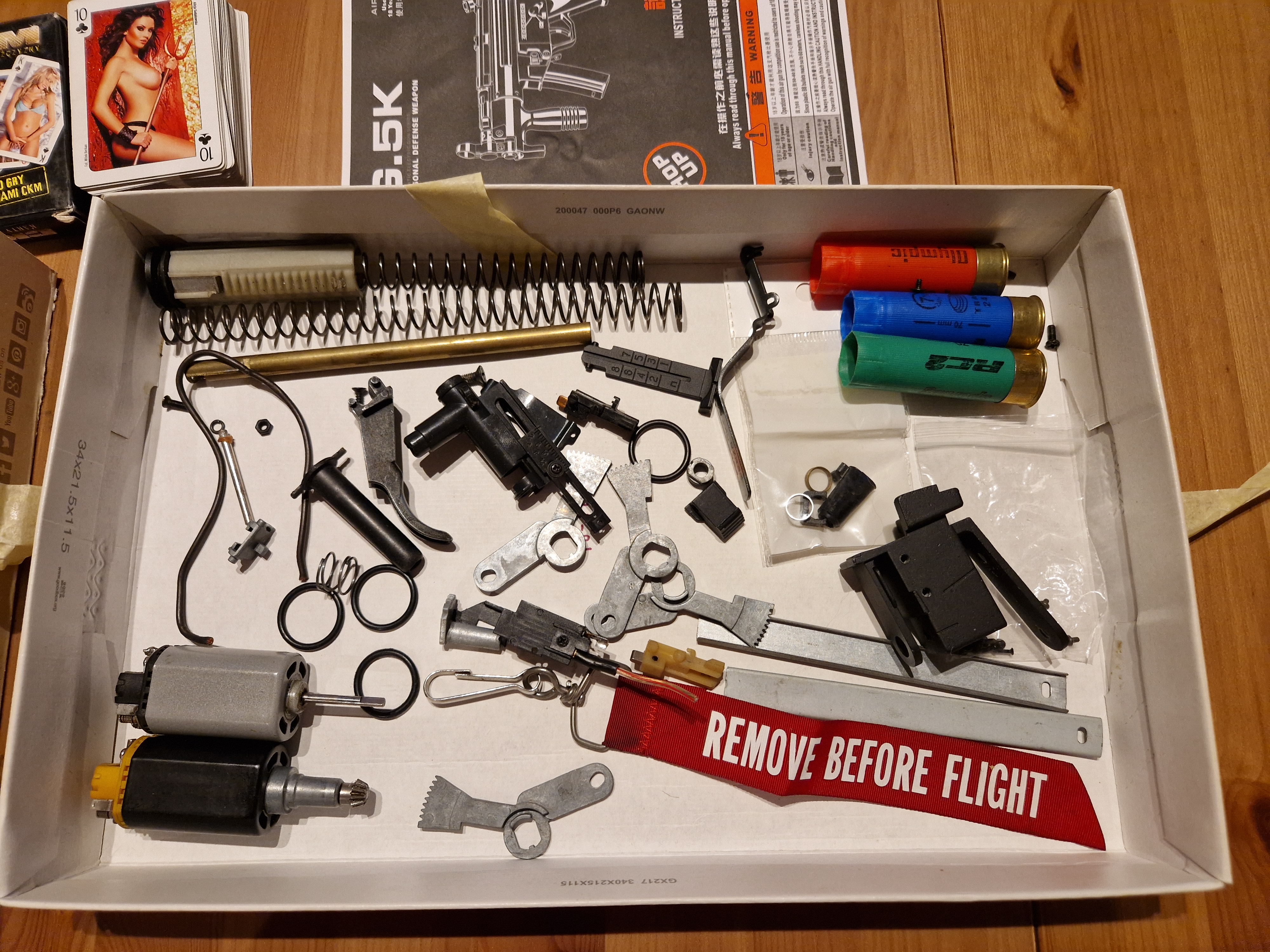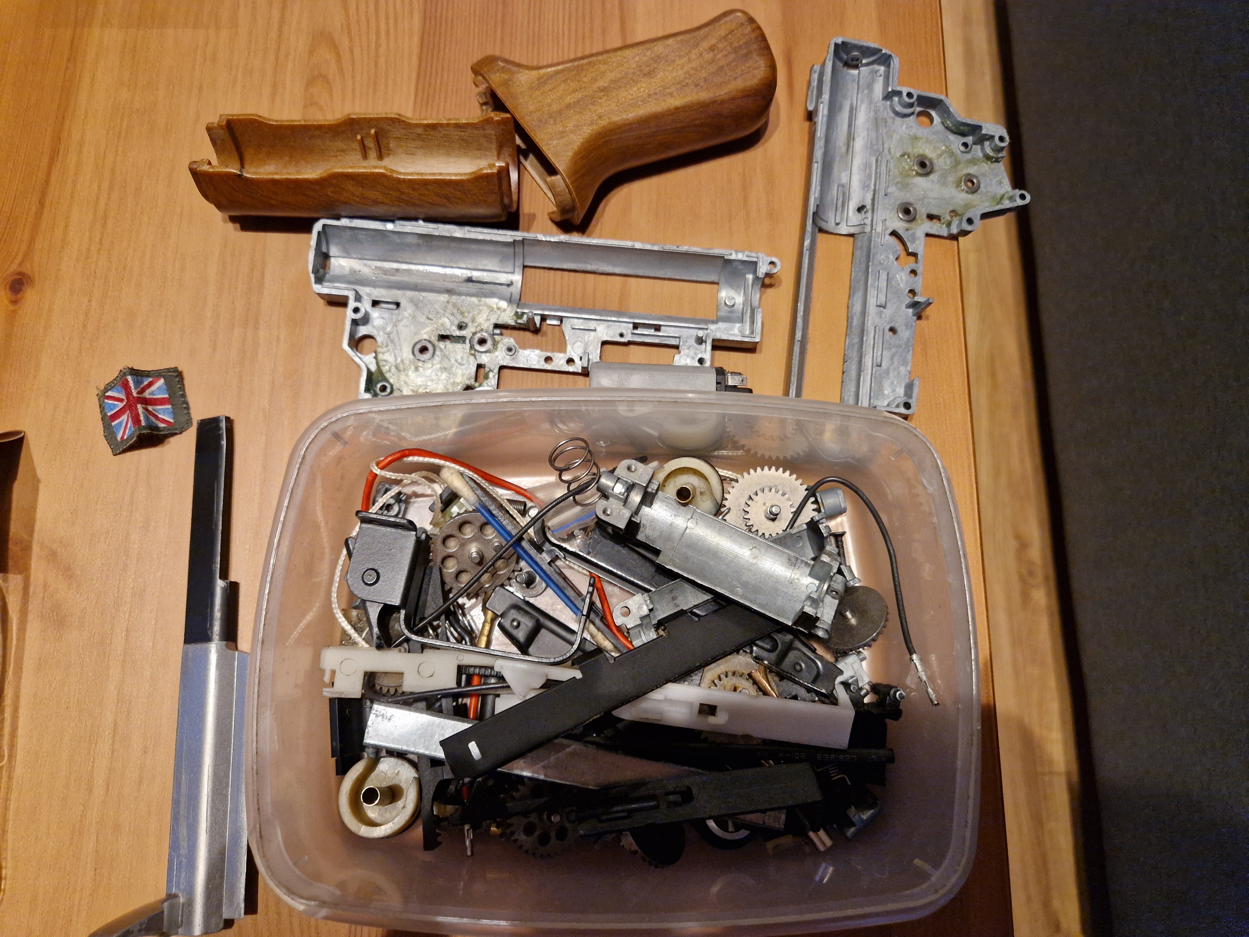Witam serdecznie! Na sprzedaż mam karton z różnymi "duperelakami" które mi zostały jak bawiłem się jeszcze w mini tuning replik asg kilka lat tenu. Znajdują się tu między innymi: - w 99% (a może w 100%) kompletny gearbox v3 chyba z mp5k galaxy (ale nie wiem) - sprawny kolimator zamknięty walther (świeci i czerwona i zielona kropka) - jakieś części od AK (pewnie od cm.028 lub coś podobnego) 2 x metalowa pokrywa zamka, magazynek hicap. Nowy magazynek mp5, kable niskooporowe plus kostka stykowa do aka (nowe) jakaś naszywka Wielkiej Brytanii, jakiś tłok z cylindrem (kilka metalowych zębów) - instrukcja do mp5k Galaxy- talia kart z gołymi dziewczynami z CKM (jednej karty chyba brakuje, ale zastępuję ją joker) - jakieś łuski (głownie ze strzelby, ale są też od AK) - jakaś paczka uszczelek - jakieś sprężyny, tłoki, części gearboxa v3 i aka (komora hop up ) - jakieś kabelki niskooporowe - mix śrubek wszelakich, podkładek, uszczelek itp. Wszystko widoczne na zdjęciach Wysyłam paczkomatem (w cenie) albo do 19.10 albo po 24.10. (20.10 wyjeżdżam służbowo na 5 dni) Nie przyjmuję zwrotów. Możliwy odbiór osobisty w Pile. Cena 299 zł do negocjacji. Sam kolimator wydaję mi się, że jest wart około 100 zł. Dla upartego mogę wystawić na olx.