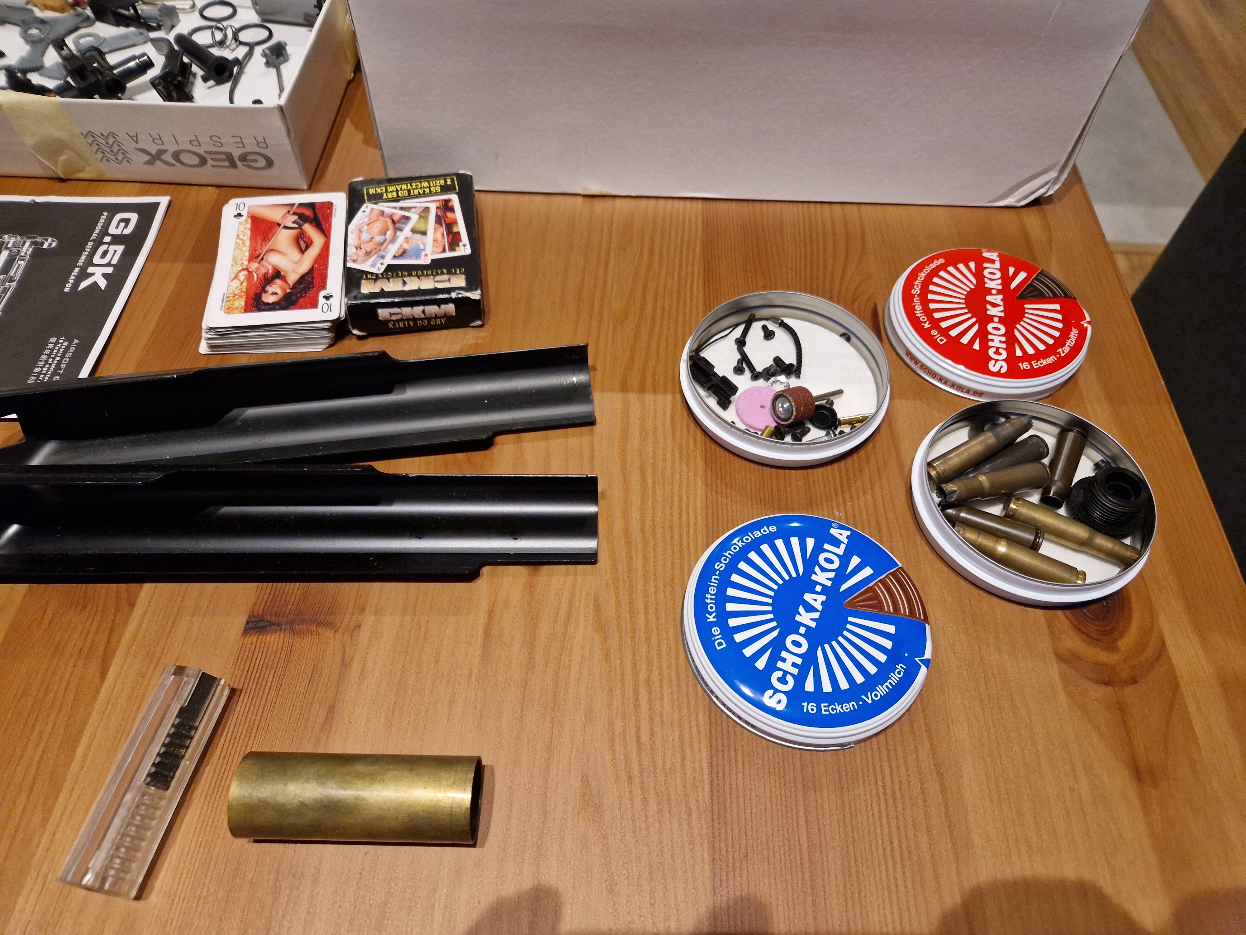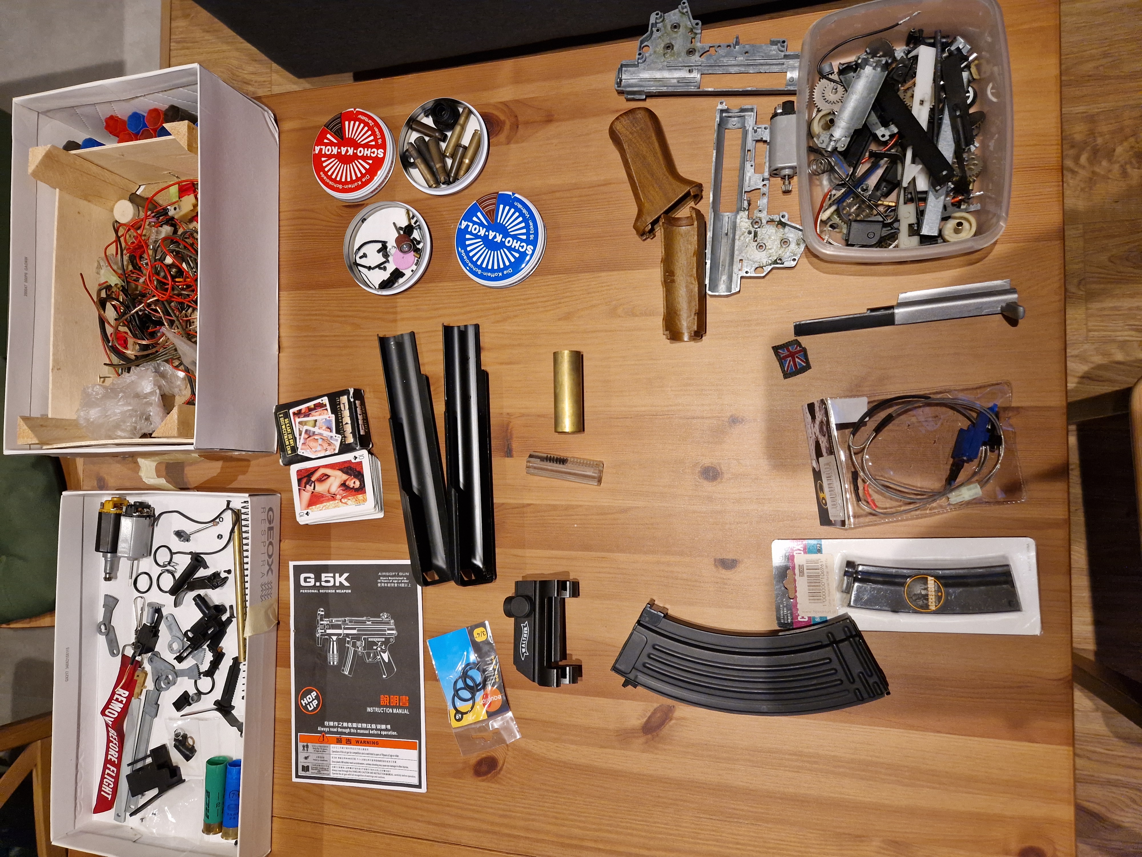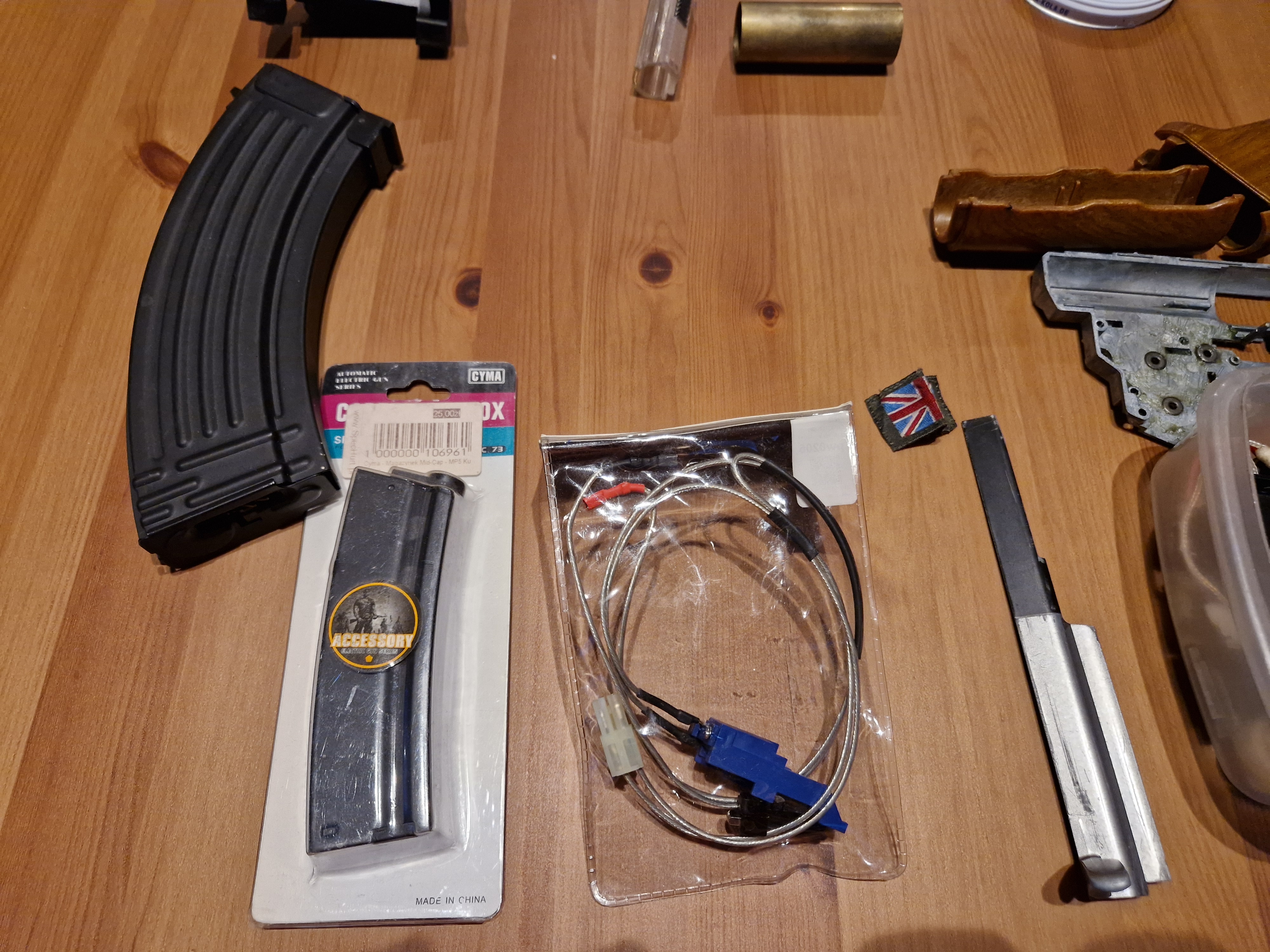 Witam serdecznie! Na sprzedaż mam karton z różnymi "duperelakami" które mi zostały jak bawiłem się jeszcze w mini tuning replik asg kilka lat tenu. Znajdują się tu między innymi: - w 99% (a może w 100%) kompletny gearbox v3 chyba z mp5k galaxy (ale nie wiem) - sprawny kolimator zamknięty walther (świeci i czerwona i zielona kropka) - jakieś części od AK (pewnie od cm.028 lub coś podobnego) 2 x metalowa pokrywa zamka, magazynek hicap. Nowy magazynek mp5, kable niskooporowe plus kostka stykowa do aka (nowe) jakaś naszywka Wielkiej Brytanii, jakiś tłok z cylindrem (kilka metalowych zębów) - instrukcja do mp5k Galaxy- talia kart z gołymi dziewczynami z CKM (jednej karty chyba brakuje, ale zastępuję ją joker) - jakieś łuski (głownie ze strzelby, ale są też od AK) - jakaś paczka uszczelek - jakieś sprężyny, tłoki, części gearboxa v3 i aka (komora hop up ) - jakieś kabelki niskooporowe - mix śrubek wszelakich, podkładek, uszczelek itp. Wszystko widoczne na zdjęciach Wysyłam paczkomatem (w cenie) albo do 19.10 albo po 24.10. (20.10 wyjeżdżam służbowo na 5 dni) Nie przyjmuję zwrotów. Możliwy odbiór osobisty w Pile. Cena 299 zł do negocjacji. Sam kolimator wydaję mi się, że jest wart około 100 zł. Dla upartego mogę wystawić na olx.