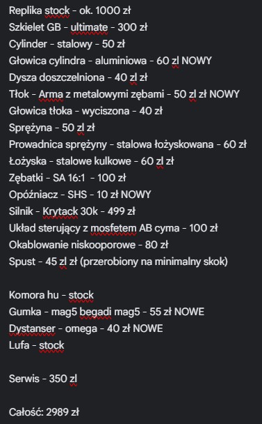 Do końca 10.2025 promocja. W cenie dwa przeglądy konserwacyjne o łącznej wartości 350 zł GRATIS Sprzedam replikę M4 SA w pełni z metalu. Nie pamiętam dokładnej nazwy, jednak nie jest to core. Posiada metalowy i bardzo sztywny korpus. Replika została w pełni zmodyfikowana m.in. Podkładkowanie, doszcelnienie, okablowanie, skrócony skok spustu itp. Aktualnie świeżo po serwisie konserwacyjnym (wyczyszczona, wymienione smary na nowe, sprawdzenie całości). Posiada moc ok. 1.2J. W replice znajdują się nowe lub o małym przebiegu części. Lista części na zdjęciu Projekt zrobiony na własny użytek. Sprzedaje, ponieważ replika mi się znudziła i od dłuższego czasu, przez zdrowie, nie uczęszczam na strzelanie. W zestawie Replika Magazynek Dla zdecydowanego kupca Gratis. Cena: 1500 zł (do negocjacji - w granicach rozsądku) Do końca 10.2025 promocja. W cenie dwa przeglądy konserwacyjne o łącznej wartości 350 zł GRATIS Sprzęt przetestowany w boju. Możliwość obejrzenia, przetestowania i odbioru na terenie Poznania i okolic. Przesyłkę pokrywa kupujący.