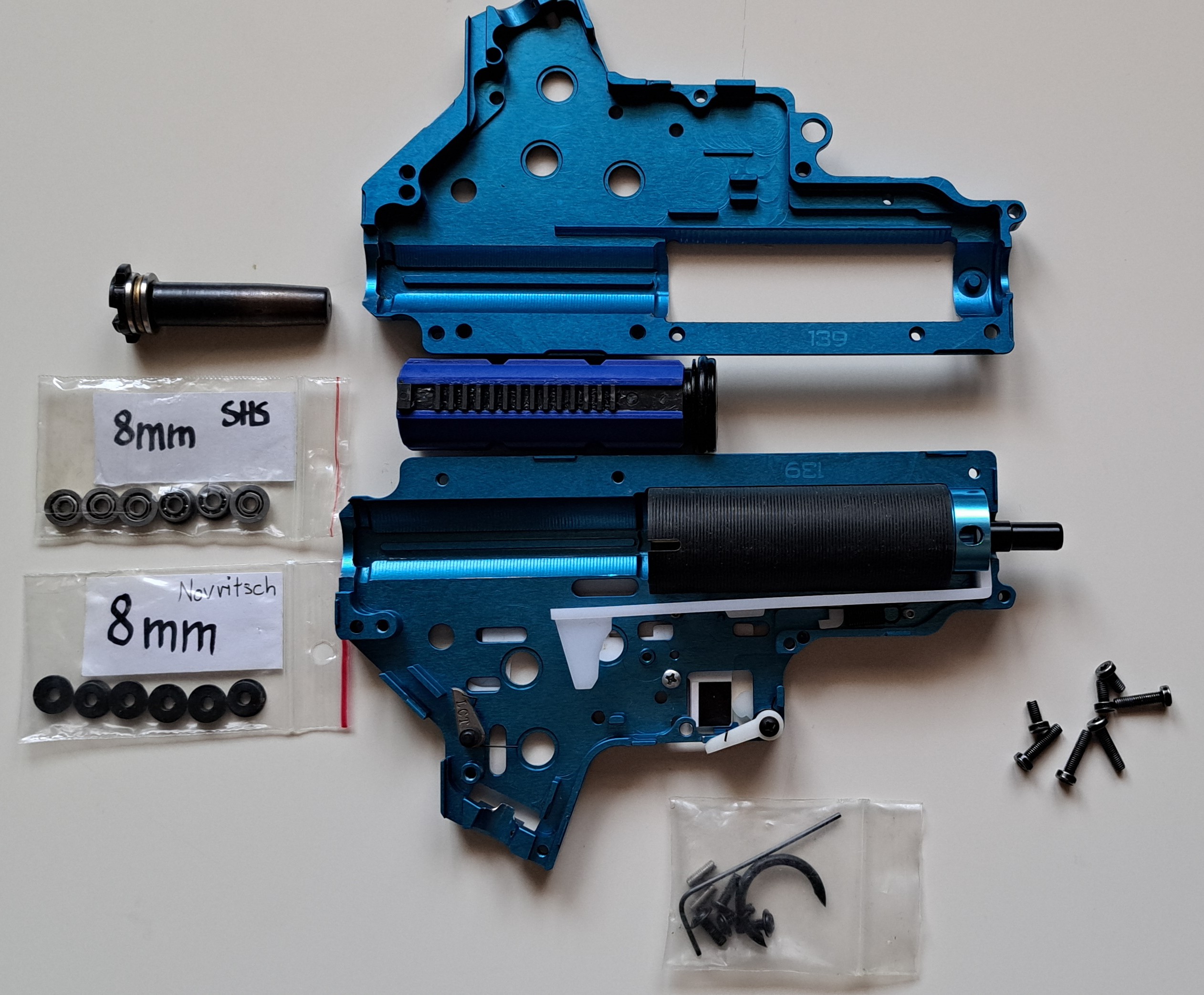 Pytania proszę w sms na nr. 787-614-881 Wysyłka w cenie Gearbox CNC Mancraft x SpecnaArms prowadnica sprężyny lożyskowana [Mancraft] listwa selektora [RetroArms listwa dosylacza [LCT] mechaniczna blokada spustu [LCT] anti reversal [LCT] tlok 14 stal zębów [SHS] gl.tloka lożyskowana [LONEX] cylinder TIP HOLE [LONEX] gl.cylindra [LONEX] dysza alu. 21.40 dwa oringi [ACM] elementy centrujące oraz śrubki do chywtu pistoletowego wraz z zestawem Pobranie tylko z kwotą zabezpieczającą 70zl Możliwy odbiór w Iławie