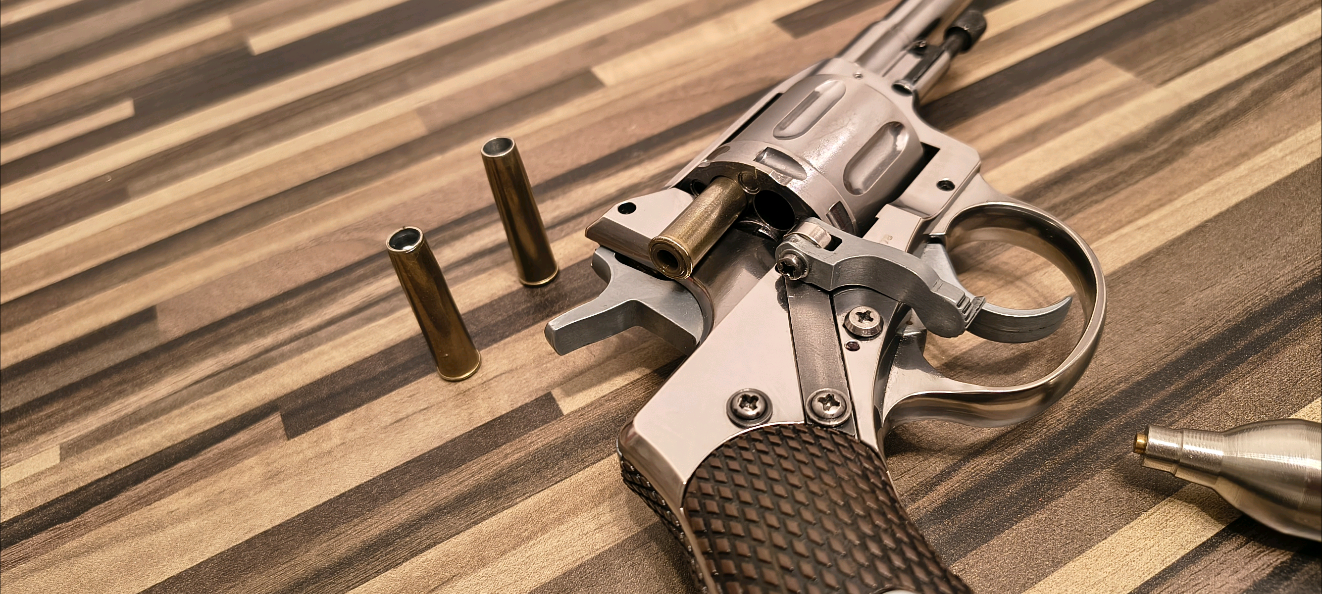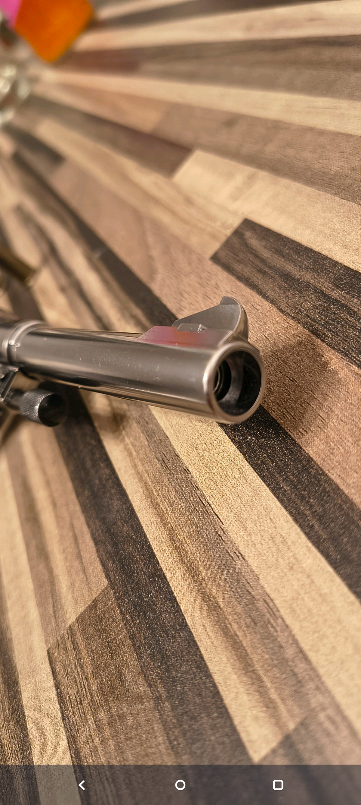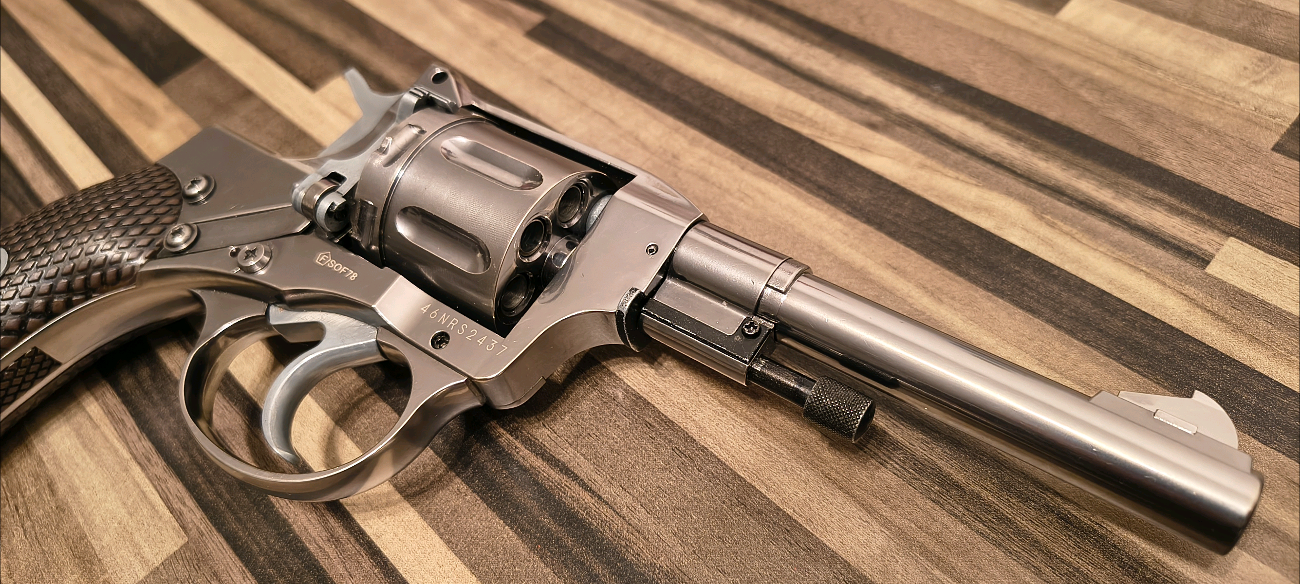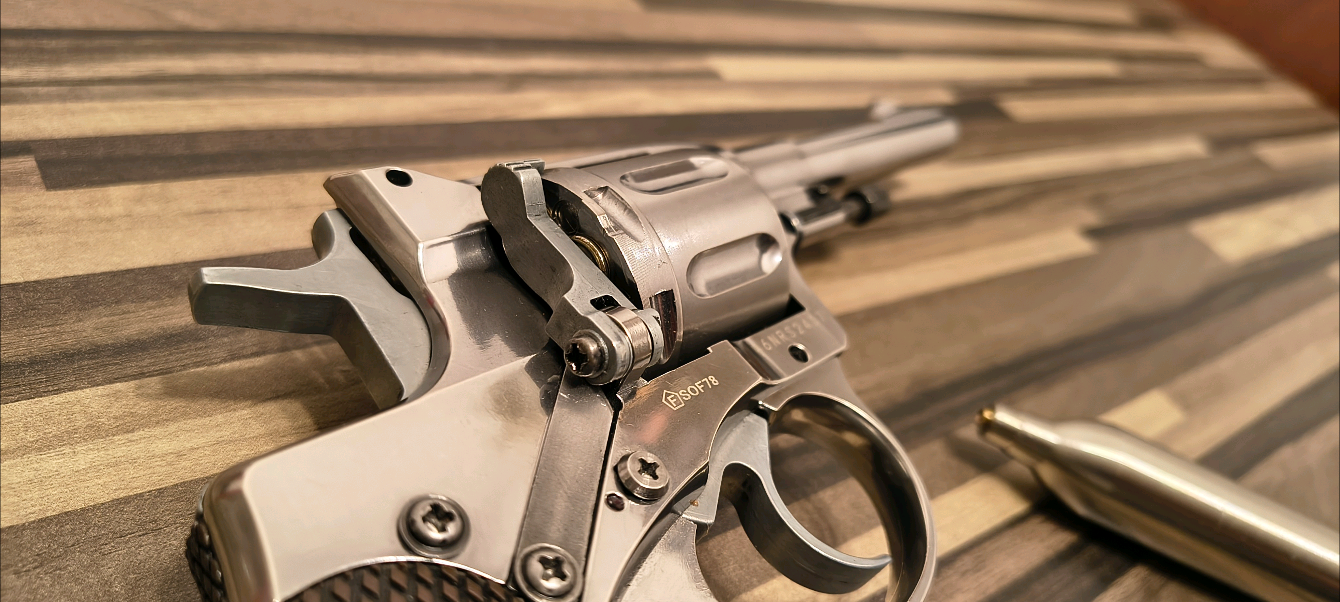 Rewolwer w bardzo dobrym stanie Jedyny taki na polskim rynku. Może strzelać nabojami Co2 oraz nabijem nabijanym Green Gasem który dodaje do zestawu. 7 metalowych łusek, które można ładować przez okno załadunkowe jak w prawdziwym nagancie. Ale jeżeli nie chcemy ich wyjmować to kluki można nabić od frontu bębna. Przez to nie ma ryzyka ich pogrubienia Do rewolweru dodaję ok 35 łusek wydrukowanych na drukarce 3D. Nie szkoda ich zgubić np. w czasie strzelanki jakby ktoś chciał go zabrać Co2 ma ok 450fps. Green gas ok 300fps. Sam rewolwer bardzo dobrzym stanie. Jedna z najbardziej solidnych replik ASG jakie miałem w rękach. W pełni metalowa. Oczywiście stop cynku-alu. Ale dośc solidny. Niklowany z zewnątrz. Replika produkcji Gletchera wersja na 6mm. Już nie dostępna na świecie. A Polska nawet nie miała dystrybucji. (Tylko śrutówki 4,5mm)