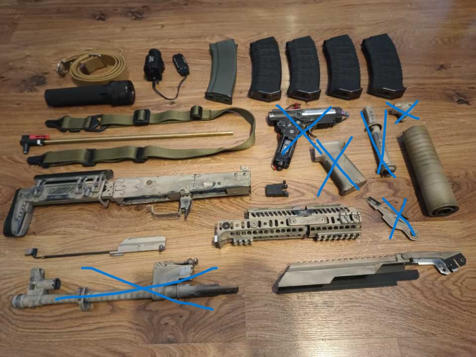 Pas AK orgo ZSRR musztarda 30 zł Pas Magpul MS3 kopia z oznaczeniami 60 zł Tłumik PBS-1 5KU 70 zł Latarka Klesh 2P SOTAC 200 zł 4 nowe midcap AK12 E&L 150 zł Magazynek midcap AK74 E&L 20 zł Lufa 455mm FLASH + Komora E&L gen.2 + gumka ML 100 zł Korpus AK + przyspawana kolba PT-1 5KU 500 zł Kompletne suwadło AK 80 zł Magwell Spencer E&L 30 zł Tłumik DTKP 24mm 80 zł Front Sport-1 5KU 400 zł Pokrywa B33 5KU 250 zł Kontakt PW.