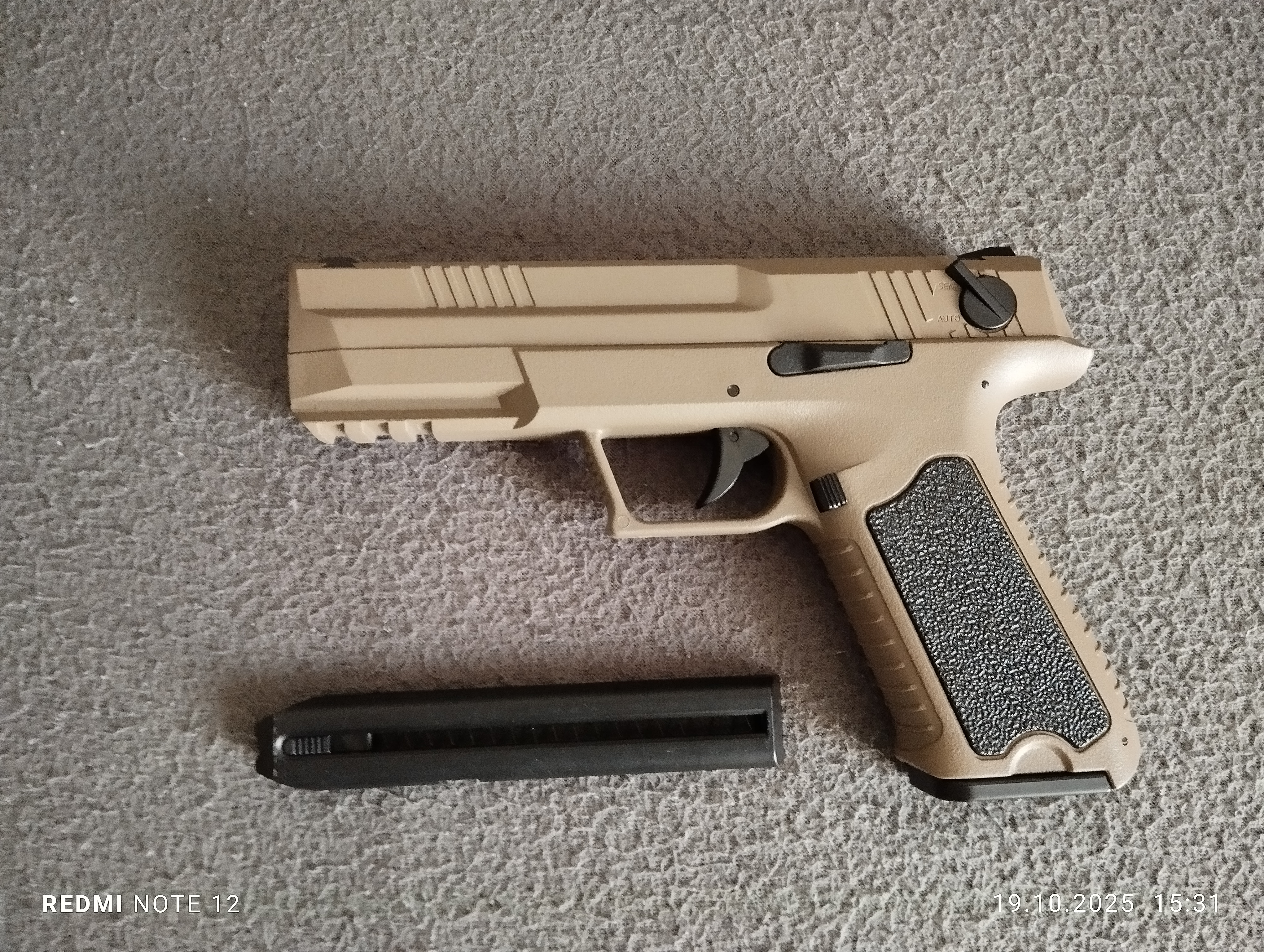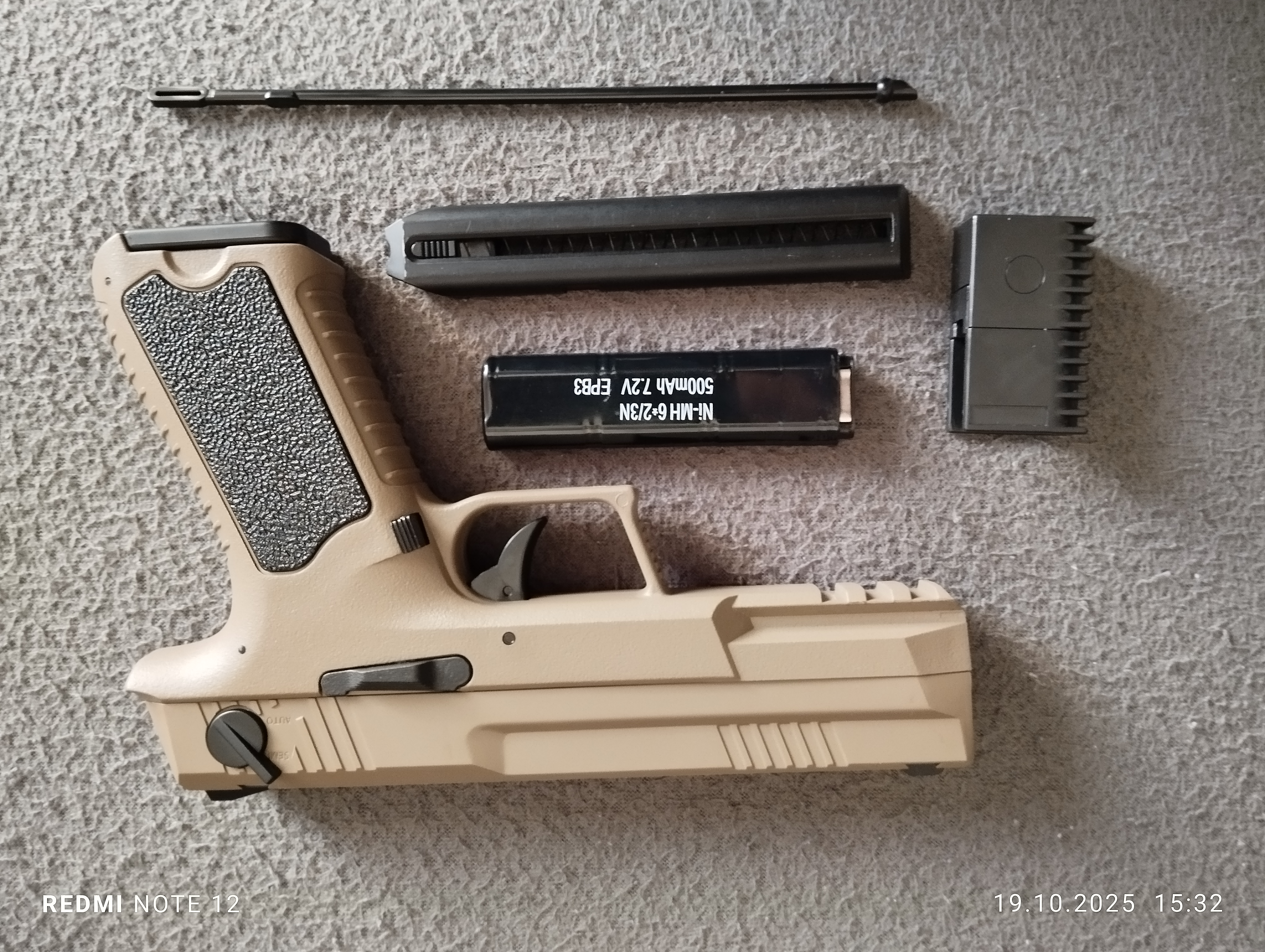 W zestawie jest - pistolet - ładowarka - bateria - magazynek - Przepychacz do lufy