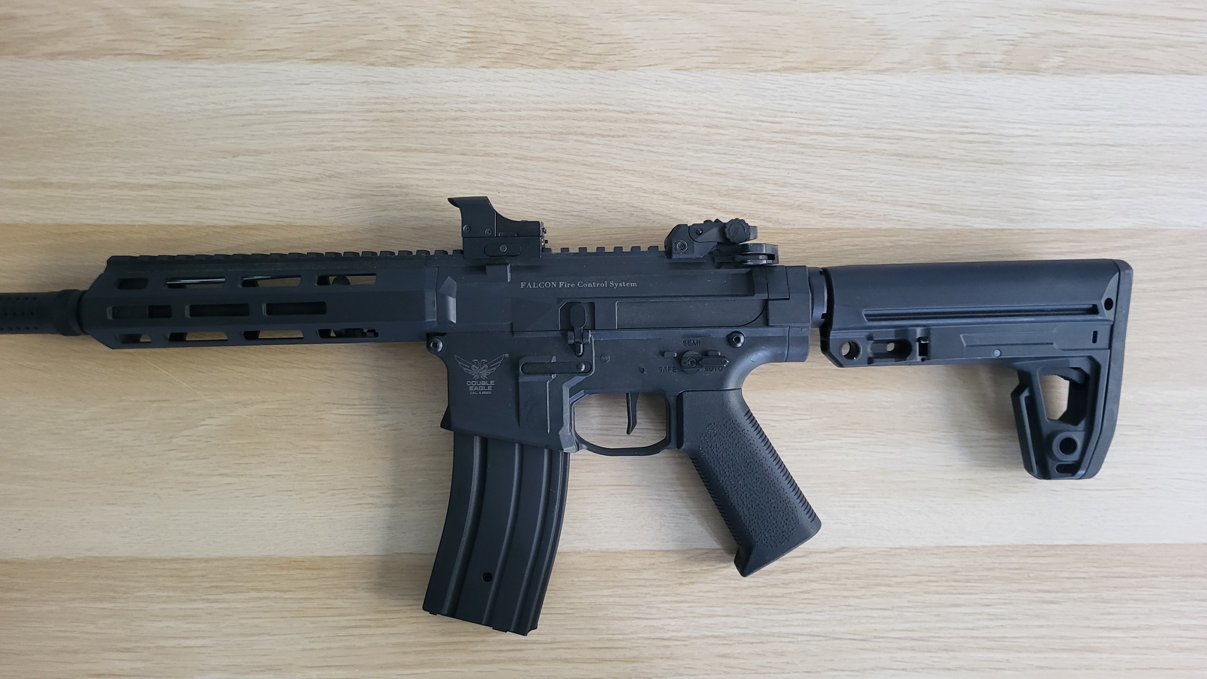 EReplika karabinka ASG od firmy DE [Double Eagle]. Model M904E Fire Control System. Napęd elektryczny. Kolba teleskopowa z miejscem na akumulator i z uchwytem QD. Front w systemie M-lock. Mało używana, max. 2k kul. W pełni sprawna, nietuningowana. Sprzedaje, bo na CQB nie jeżdżę i szkoda by się marnowała. W zestawie: - replika - magazynek - kolimator, uszkodzony,ale może uda się go naprawić. tel. 601-285-091