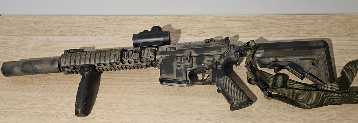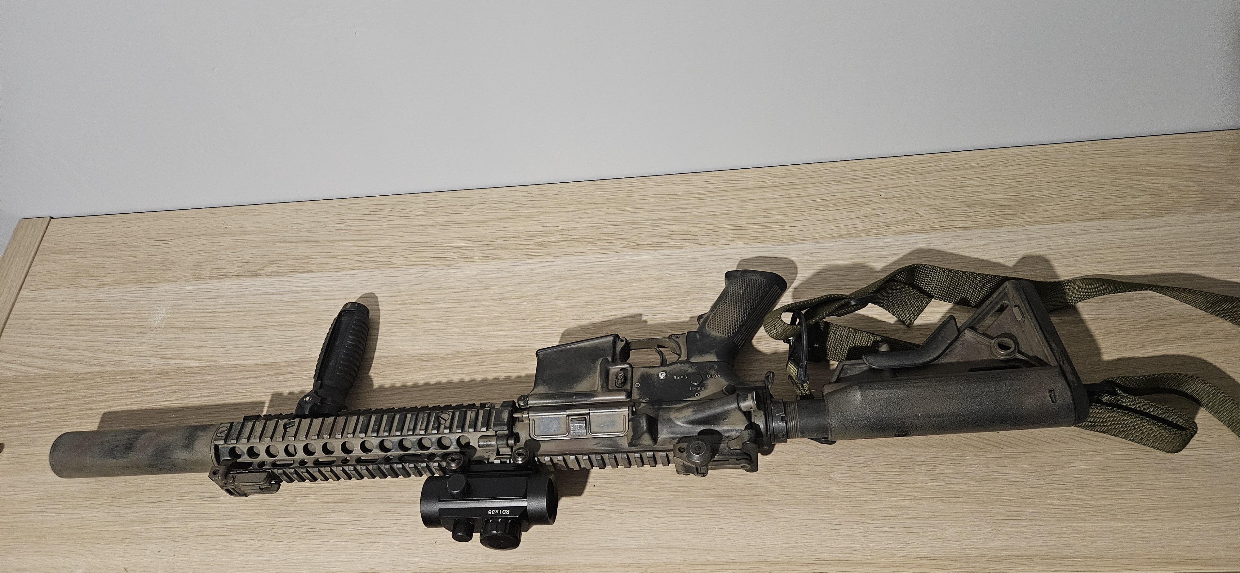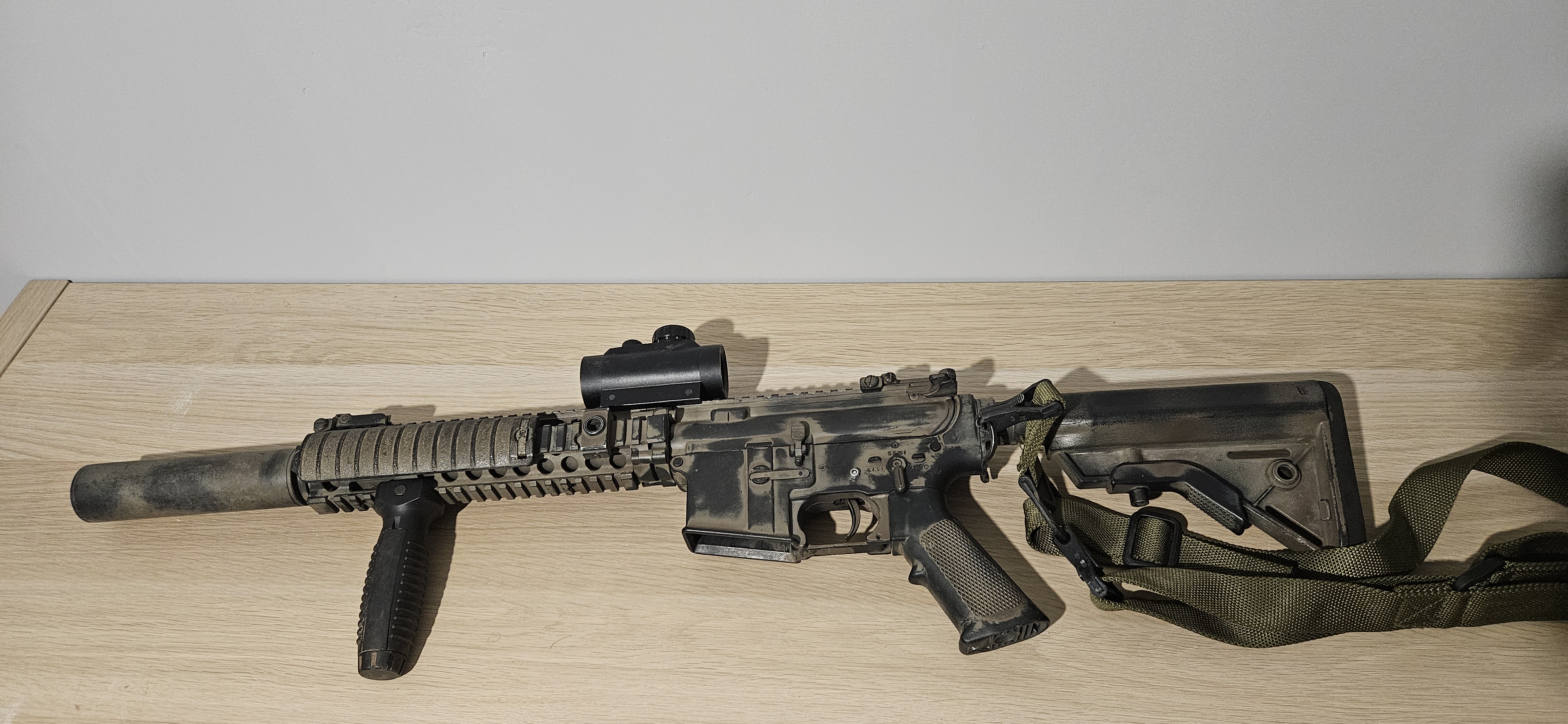 E&L MK418 + koli + chwyt pionowy + 3 magi - 1300: sprawdzona, porządna i pożądana marka. Mimo iż słyną z AK-47 to i M4 trzyma ten sam wysoki poziom. Metalowy, wytrzymały korpus świetnie się sprawdza w ciężkich, jesiennych warunkach a także bardzo dobrze odzwierciedla realny model gumka begadi fly5 mosfet i przewody silikonowe Cavia Tech Dystanser begadi pro 70 hopup 3mm-5mm Głowica tłoka FPS Softair CNC double o-ring XPAE Cylinder typ 0 aluminiowy Airsoft Pro System szybkiej wymiany sprężyny Na kulkach 0,25 - 1,46J i 350FPS. Pluje celnie i powtarzalnie.