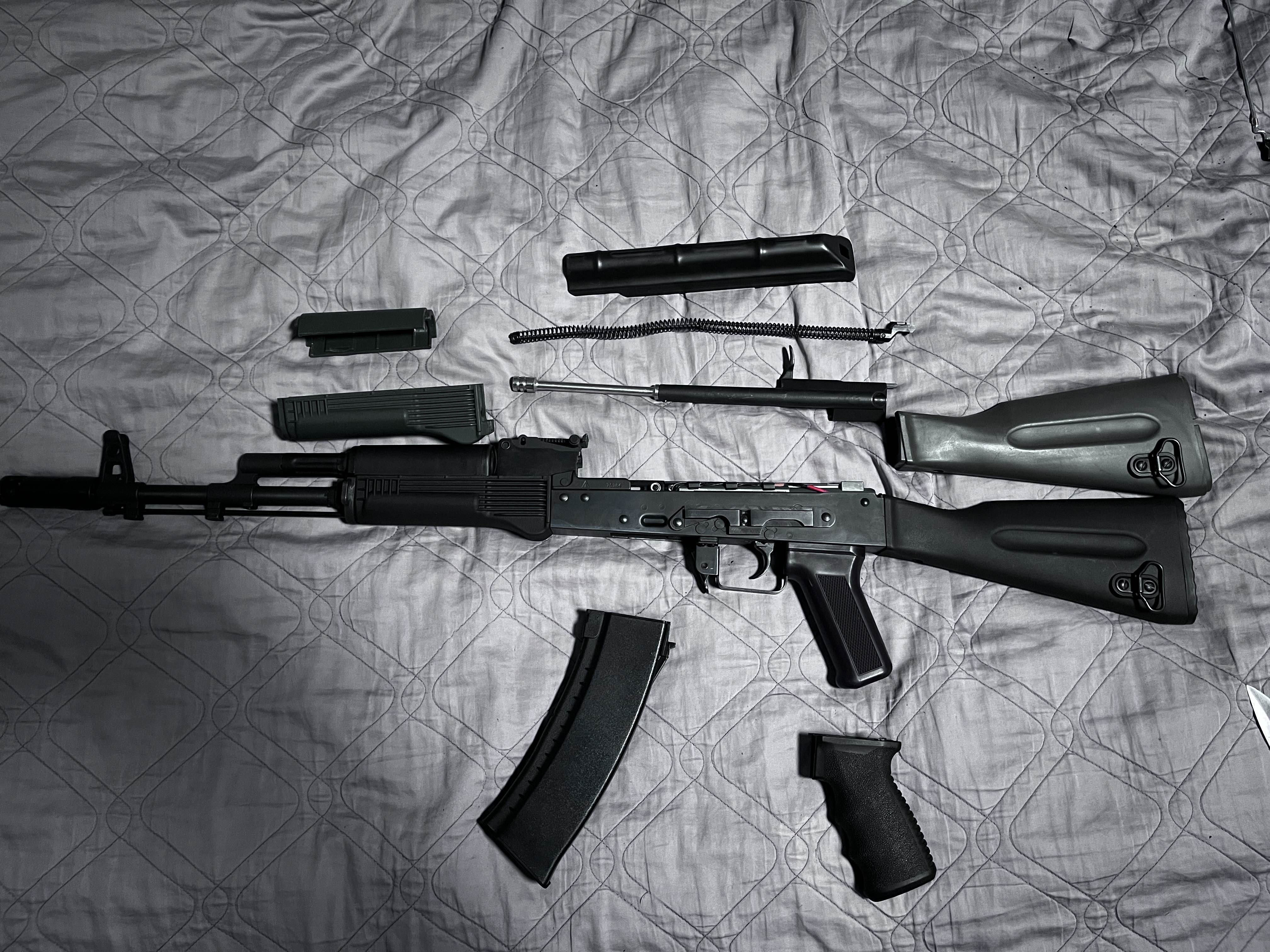 Na stole taki o ak w takiej kompletacji, z minusów: Drobny luz przednich okładzin Kable są bardzo cienkie, nie wiem co z nimi zrobił poprzedni właściciel Odbiór wrocław , cene uważam za uczciwą jak na to że dorzucam dodkaowe okładziny, na życzenię mogę dołożyć 5 magazynków za 80 Możliwa wymiana na platforme AR, oraz możliwe obejrzenie repliki we wrocławiu