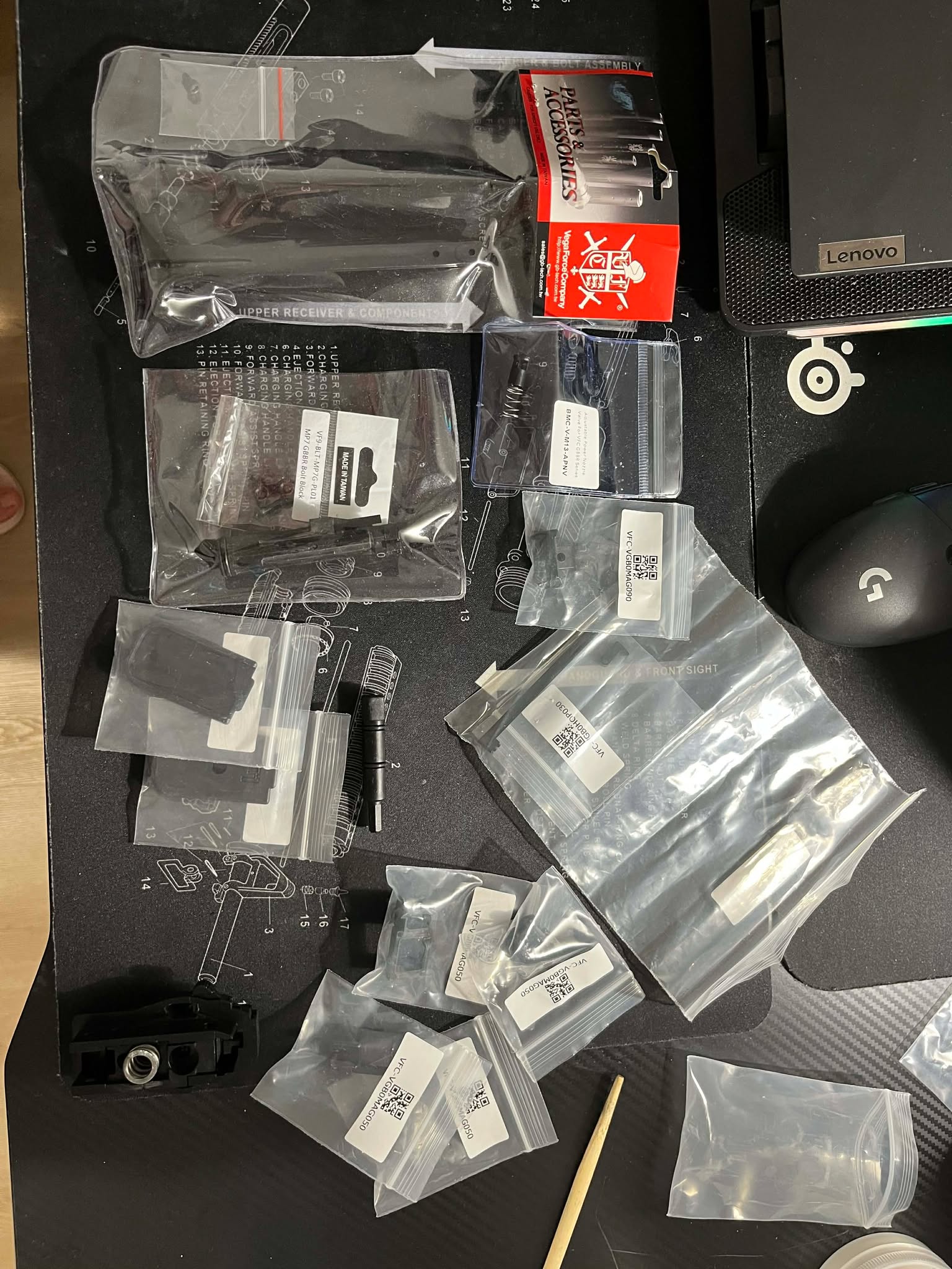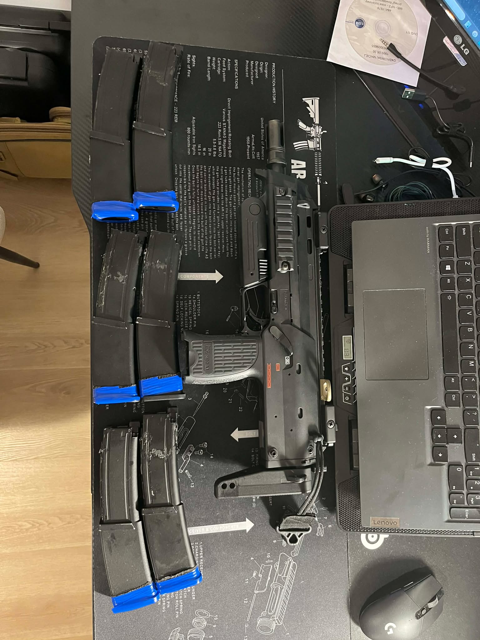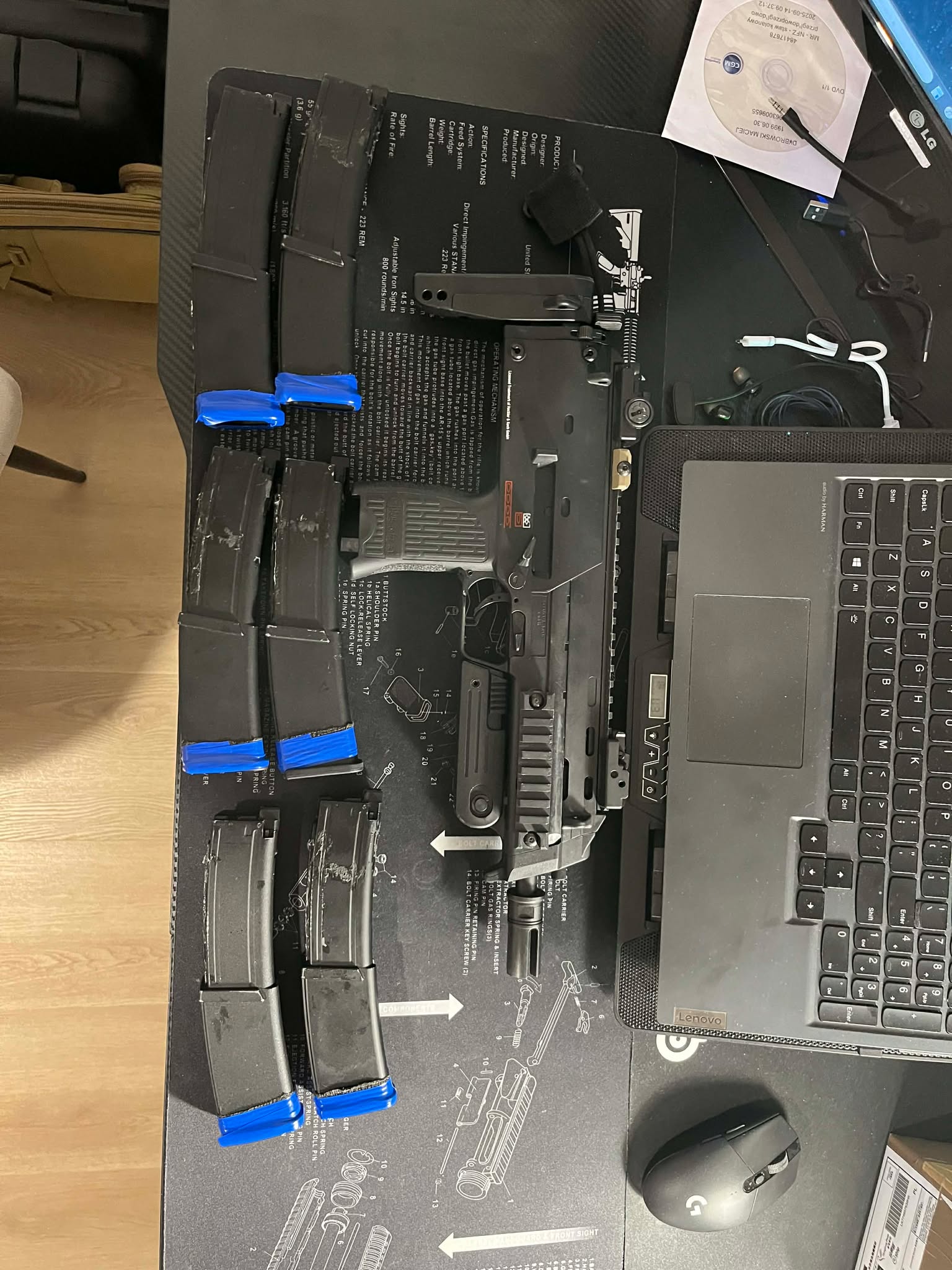 Wprowadzone zmiany: - Dysza Bow Master APNV z regulacją mocy - Lufa Unicorn 180mm - Aluminiowy backplate firmy Clutch Precision - Boczne szyny montażowe - Tłumik płomienia pod montaż replik tłumika ussocom W zestawie 6 magazynków, każdy z nich w pełni sprawny po niedawnym serwisie (wyglądają na zmęczone życiem ze względu na podklejenie tylnej powierzchni aby stabilniej siedziały w rękojeści. Oprócz tego dorzucam zapasowe części, które kupiłem do repliki: - dźwignia przeładowania - dźwignia zrzutu magazynka - dysza - blokadę dyszy - 2 podstawy magazynka - 4 szczęki magazynka - kluczyk do ustawiania hopka oraz ramie dociskowe - stockowy backplate Replika posiada niewielkie ślady używania. Jej przebieg wynosi niecałe 1k kulek.