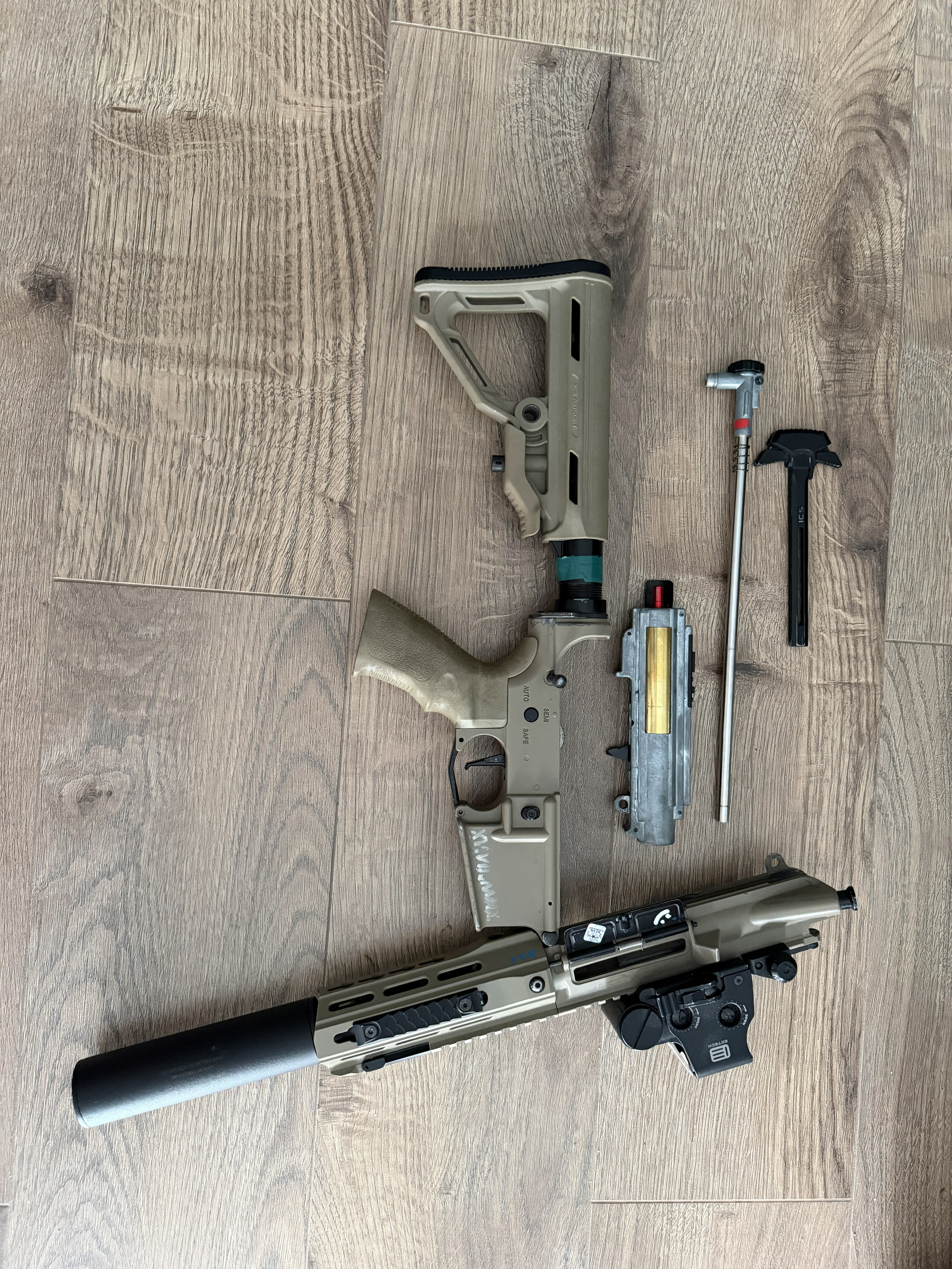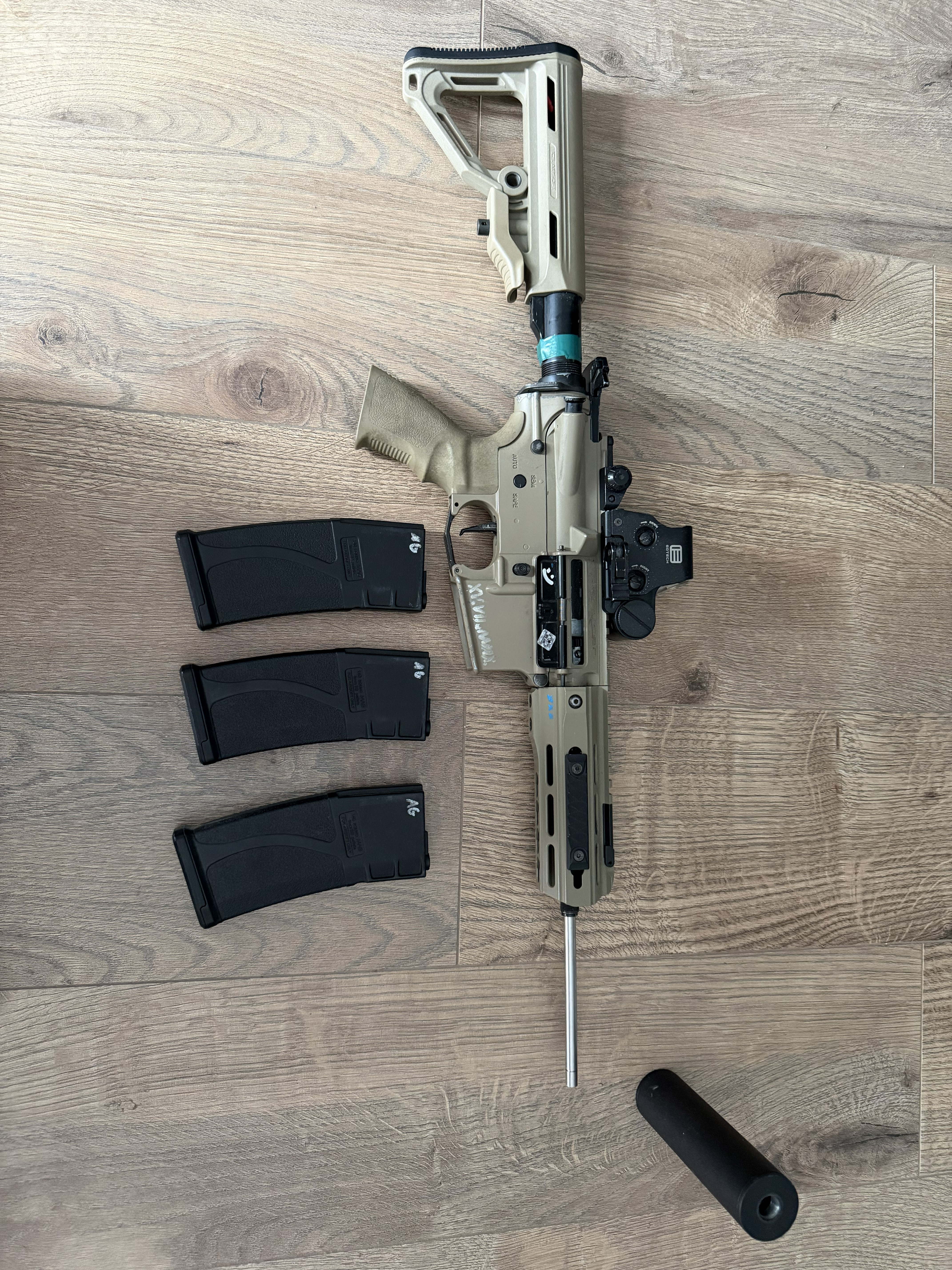 Karabinek ASG ICS Airsoft CXP-UK1 CAPITAN Replika celownika holograficznego eotech Osłony key-mod na froncie Replika tłumika - 15 cm długości Lufa wewnętrzna - precyzyjna 6,01 303mm - da Vinci Airsoft Komora hop-up - stock Mosfet - Titan V2 Basic set - Gate Silnik - Ultimate INFINITY CNC U-30000 - długi - Action Sport Games (ASG) Język spustowy - CNC - Maxx Model Dysza - Maxx Model Głowica - wymieniona (nie pamiętam jaka) Płytka - wymieniona (nie pamiętam jaka) Gumka - silikonowa Hop-Up MrHop - Maple Leaf sprężyna -120M (nie pamiętam jaka) Dodatki 3x mid-cap Guarder bateria 11.1 2300 mAh (45c) - Tattu bateria 11.1 1000 mAh (25c/45c) - Nimrod pokrowiec na baterie sprężyna 90M (nie pamiętam jaka) Sprzedaje, ponieważ już się nie strzelam i replika od pół roku się kurzy. Więcej zdjęć w prywatnej wiadomości.