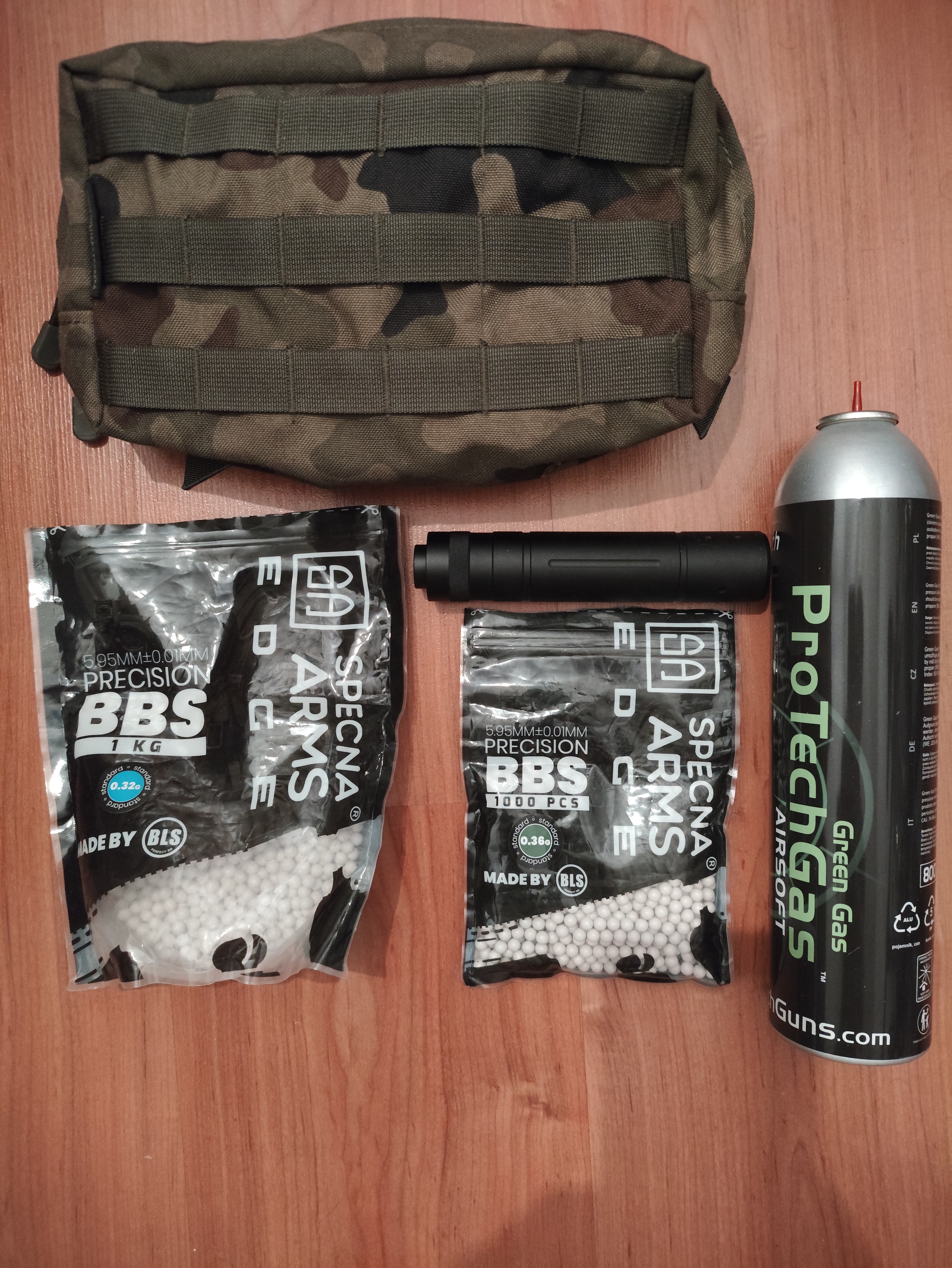 Sprzedam: - cargo poziome średnie Miwo Praszka, cordura wz.93; - praktycznie pełną butlę green gasu Protech 800 ml (nabity jeden magazynek); - tłumik dźwięku 150x30 mm, gwint 14 mm lewoskrętny, piankowe wypełnienie; - ponad 0,5 kg kulek 0,32 g BLS, - paczka kulek 0,36 g BLS. Cena za całość 150 zł + przesyłka.