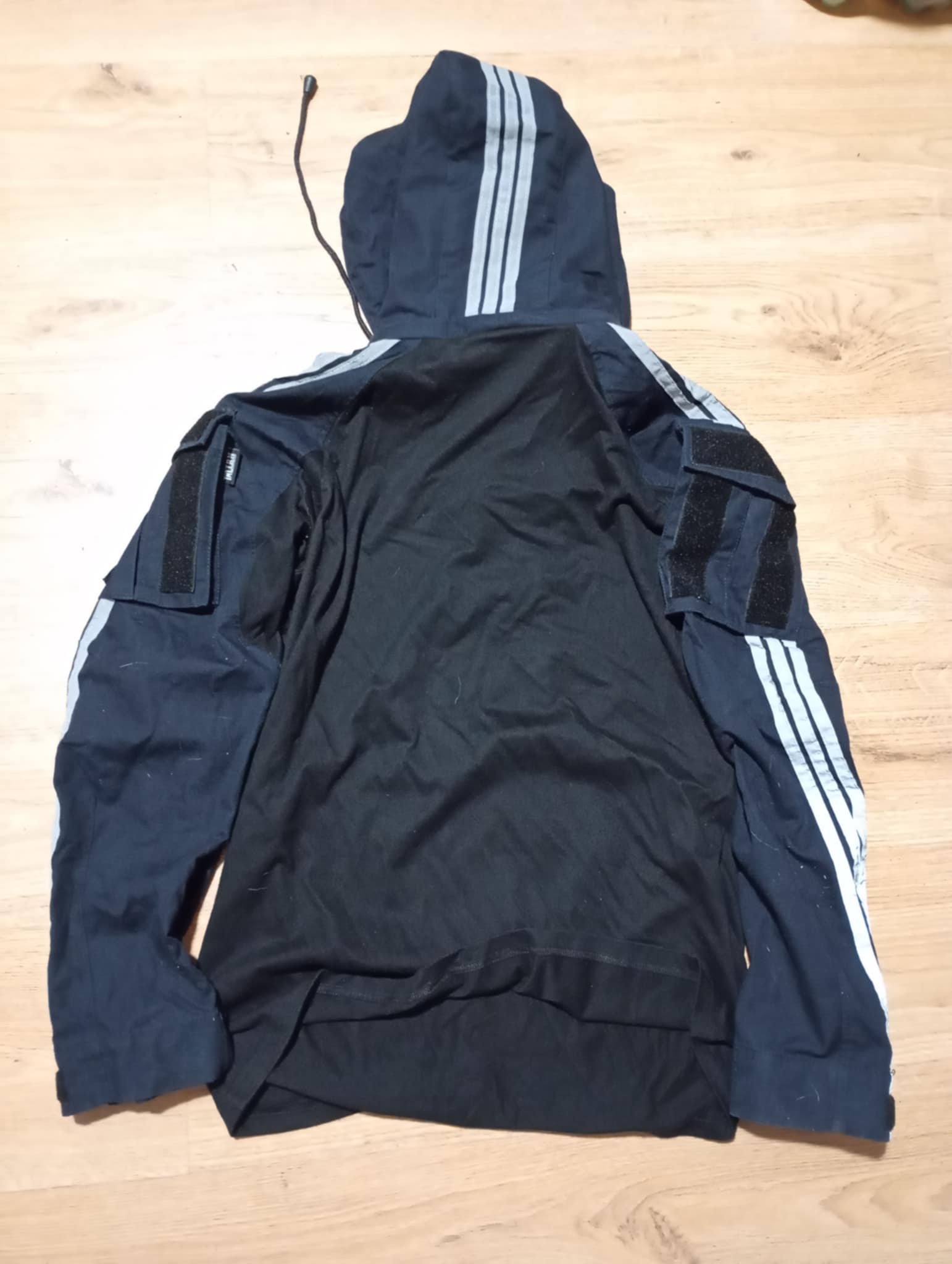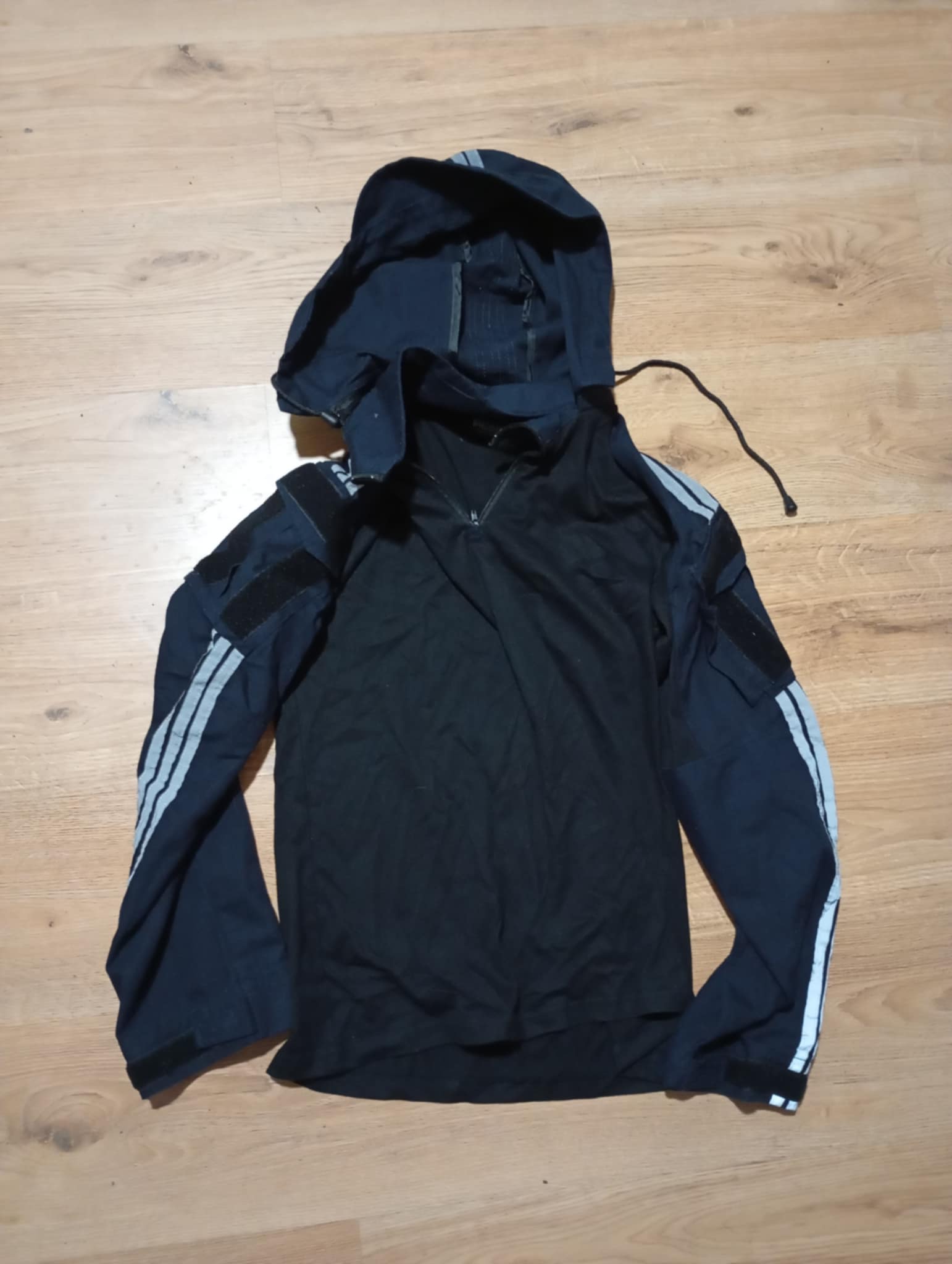 Nieużywany od dłuższego czasu przeze mnie chiński combat shirt w 3-stripie Rozmiar M, kaptur odpinany na zamek błyskawiczny, pasy z materiału odblaskowego. Czarne body i granatowe rękawy/kaptur