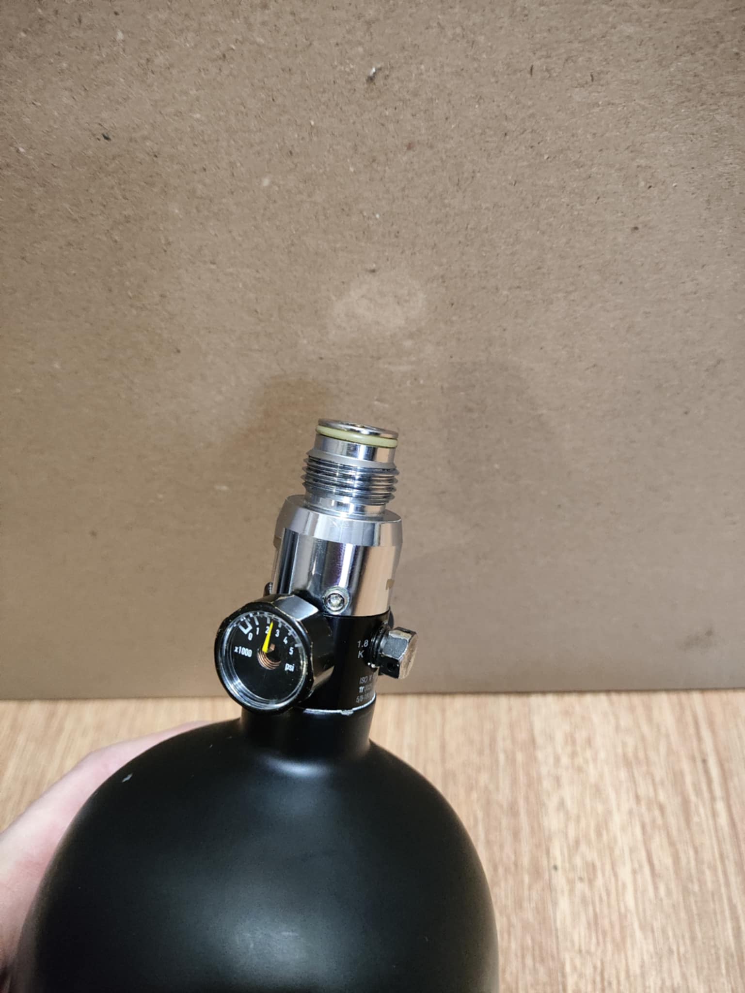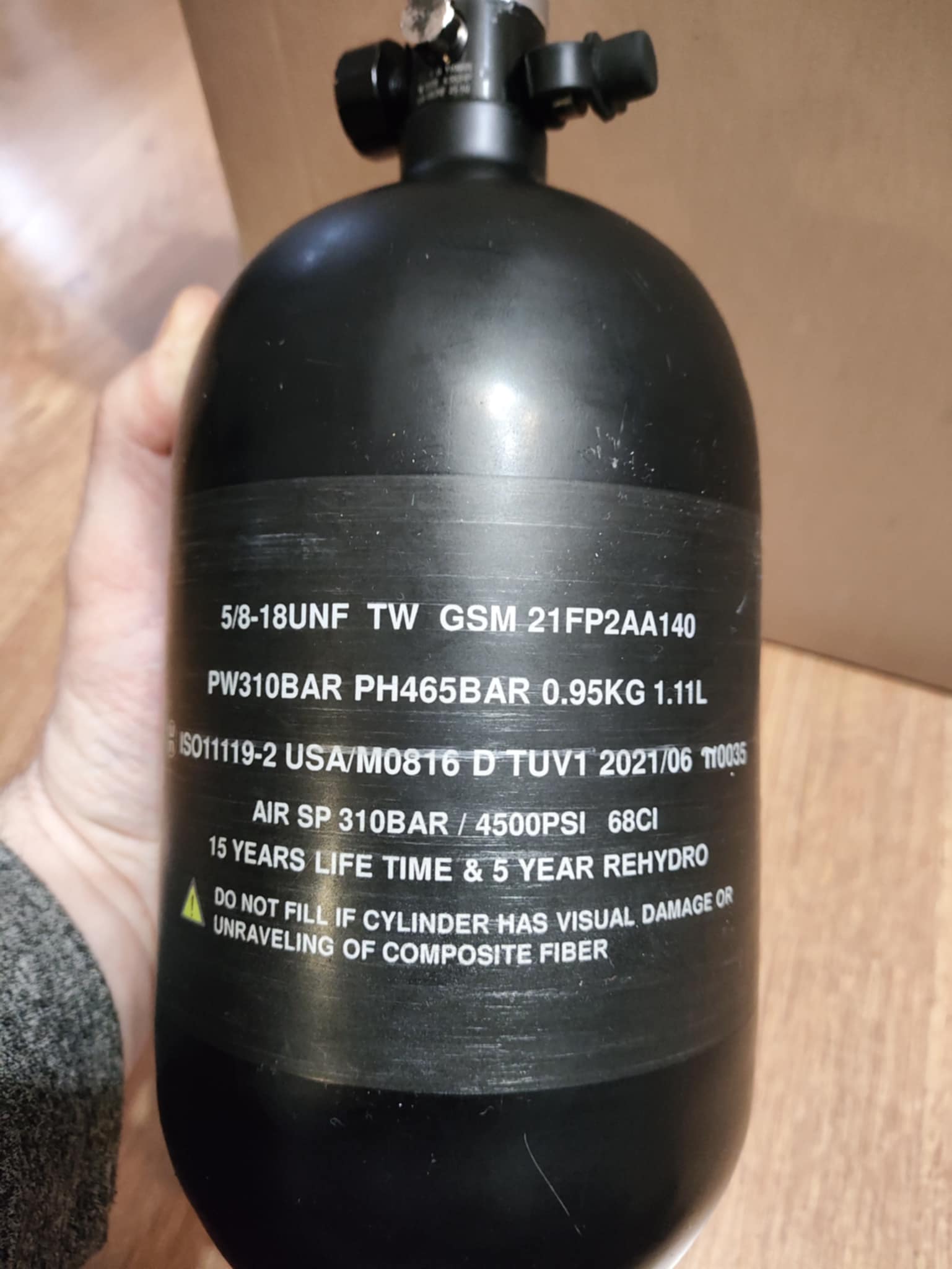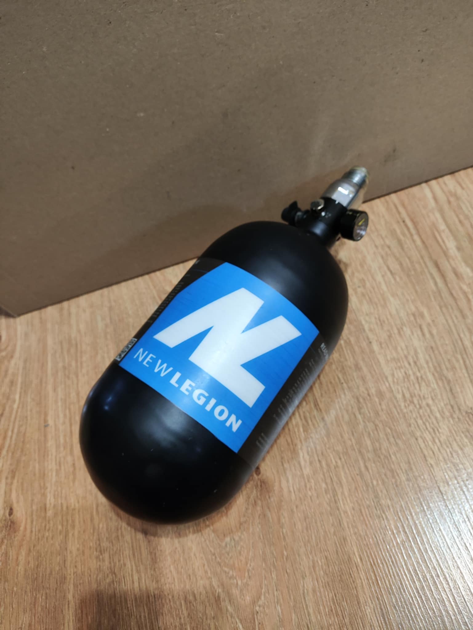 Butla hpa New Legion Kevlar 1,1l 4500PSI 300bar NL. Butla hpa New Legion Kevlar/kompozyt 1,1l 4500PSI 300bar. Butla HP kompozytowa o pojemności 68 ci / 1,1l / i ciśnieniu roboczym 300 bar / 4500 PSI / wraz z regulatorem wysokociśnieniowym. Średnica 110 mm, długość 225 mm, kolor czarny mat. Butla sprawna, nabita powietrzem, używana - w pełni działająca.