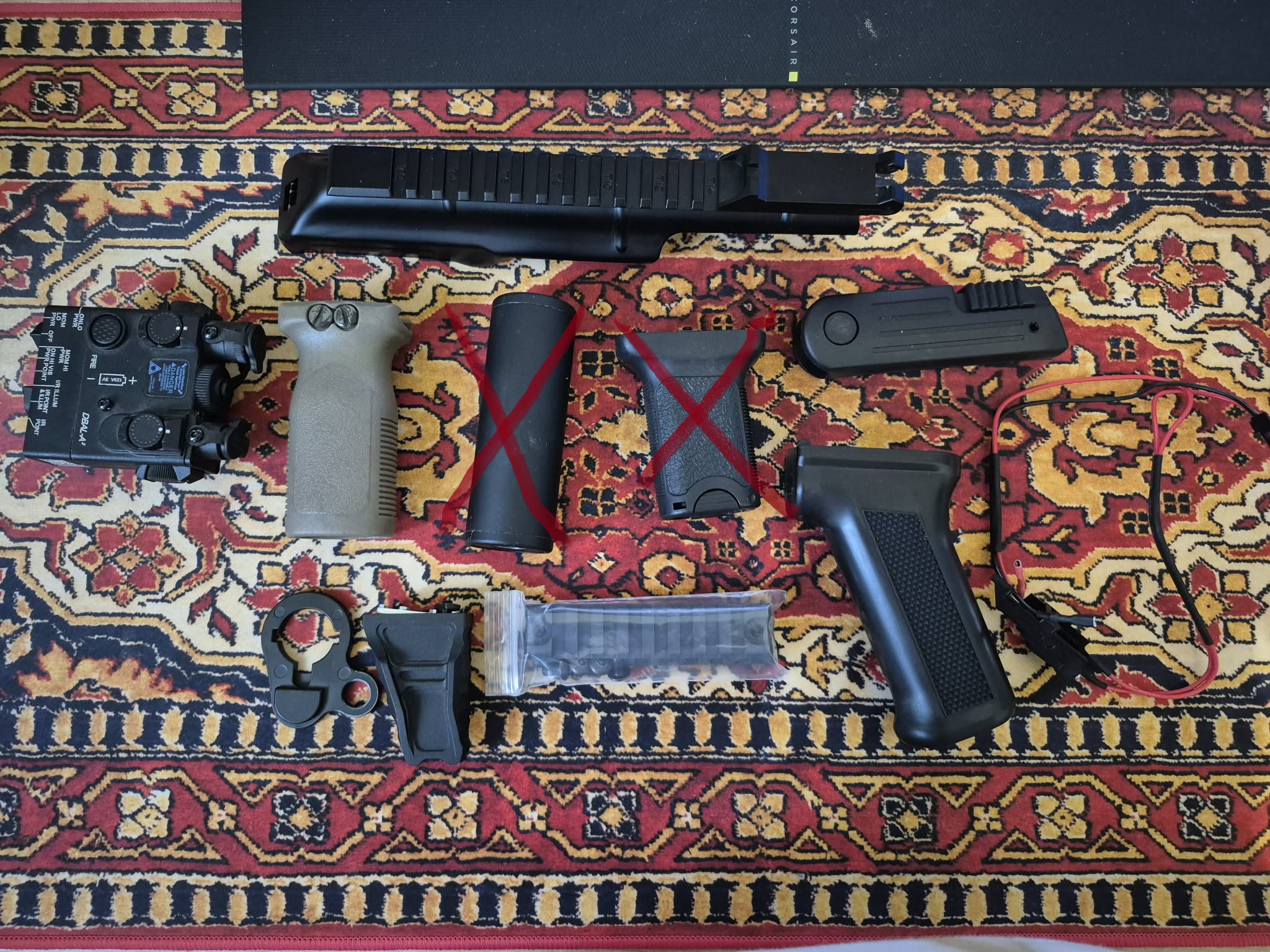 Witam, posiadam na sprzedaż kilka akcesoriów: 1. dekiel/dust cover z szyną do aksu cyma stan nowy widoczne wytarcie farby na jednej częsci wewnętrznej podczas próby montażu na aksu lct. 45 zł 2. Dbal a2 plastik kopia dummy box bez żadnych funkcji oprócz dekoracyjnej. 30zł 3. Kopia chwytu prostego ala magpul na ris tan 30zł 4. tłumik SPRZEDANY 5. chwyt czarny mlok ala magpul SPRZEDANY 6. Chwyt przedni składany mp7 vfc 30 zł 7. Back plate z montażem zawieszenia m4 aeg stalowy masywny 25zł 8. chwyt przedni kopia strike industries 50zł 9. Szyny boczne druk 3d mp7 vfc kupione na evike 25zł 10. Chwyt pistoletowy lct nowy 30zł 11. kable z kostką stykową lct aksu 20zł wysyłka najlepiej paczkomatem im więcej chcesz tym taniej masz :)