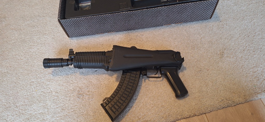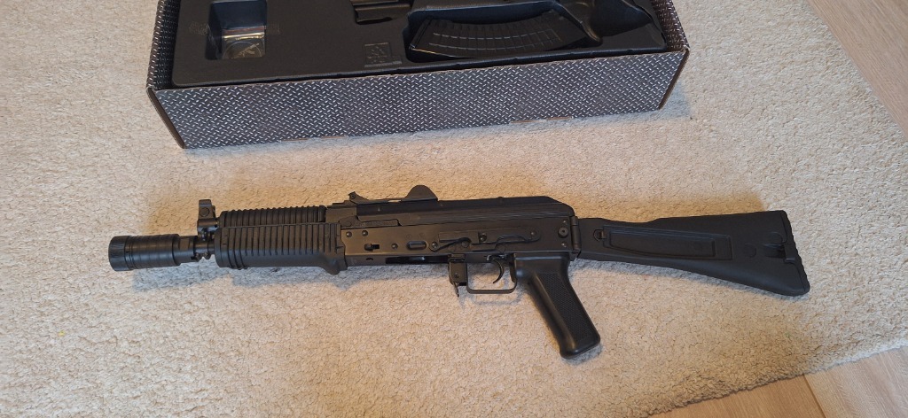 Nówka, nigdy nie śmigany. Wygrany w konkursie na MARSH. Opis szczegółowy poniżej: Zewnętrznie replika zbudowana jest z mieszanki elementów ze stali tłoczonej oraz polimeru. Łoże, składana kolba i chwyt pistoletowy są wykonane z wytrzymałego, a jednocześnie lekkiego polimeru, z tłoczoną stalową komorą, która wygląda dokładnie tak, jak w rzeczywistości. Dzięki tem u, że proces produkcji jest identyczny z prawdziwym, replika ma te same rodzaje skaz, co prawdziwy pistolet, a także ten sam zapach dzięki zastosowanym środkom antyadhezyjnym i olejom konserwującym: pistolet ma ten nowy zapach AK i jest piękny! Wewnątrz replika posiada wszystko, czego można by oczekiwać od LCT jeśli chodzi o jakość. Karabin zawiera najnowszą wersję gearboxa LCT w wersji 3, która ma łożyska 9 mm, silnik 22000 obr./min, a także obrabianą CNC głowicę cylindra i głowicę tłoka ze stalowym łożyskiem kulkowym. Wysokiej jakości replika firmy LCT Airsoft Oparty na SLR-106UR SBR, 5,56mm AK Realistyczny proces produkcyjny Lekkie, antypoślizgowe, prążkowane polimerowe łoże Kolba składana Magazynek o pojemności 130 kulek Wybór ognia w stylu AK (bezpieczny / pełny automatyczny / semi) Boczna płyta montażowa AK do mocowania celowników i lunet Zintegrowany przedni i tylny celownik Gearobx V3 Łożyska 9mm Silnik 22000 obr./min Mosiężna lufa wewnętrzna 270 mm Okablowanie 18AWG Mosiężny, chromowany cylinder Obrabiana CNC głowica cylindra i głowica tłoka ze stopu aluminium Prowadnica sprężyny na stalowych łożyskach kulkowych Hop-Up: regulowany Tryb ognia: półautomatyczny i w pełni automatyczny Długość: 900 mm Długość lufy wewnętrznej: 435 mm Silnik: krótki Kaliber: 6mm MOSFET: Nie Waga: 3,6 kg Prędkość wylotowa (0,20 g): ok. 335 fps (1,04 Joule)