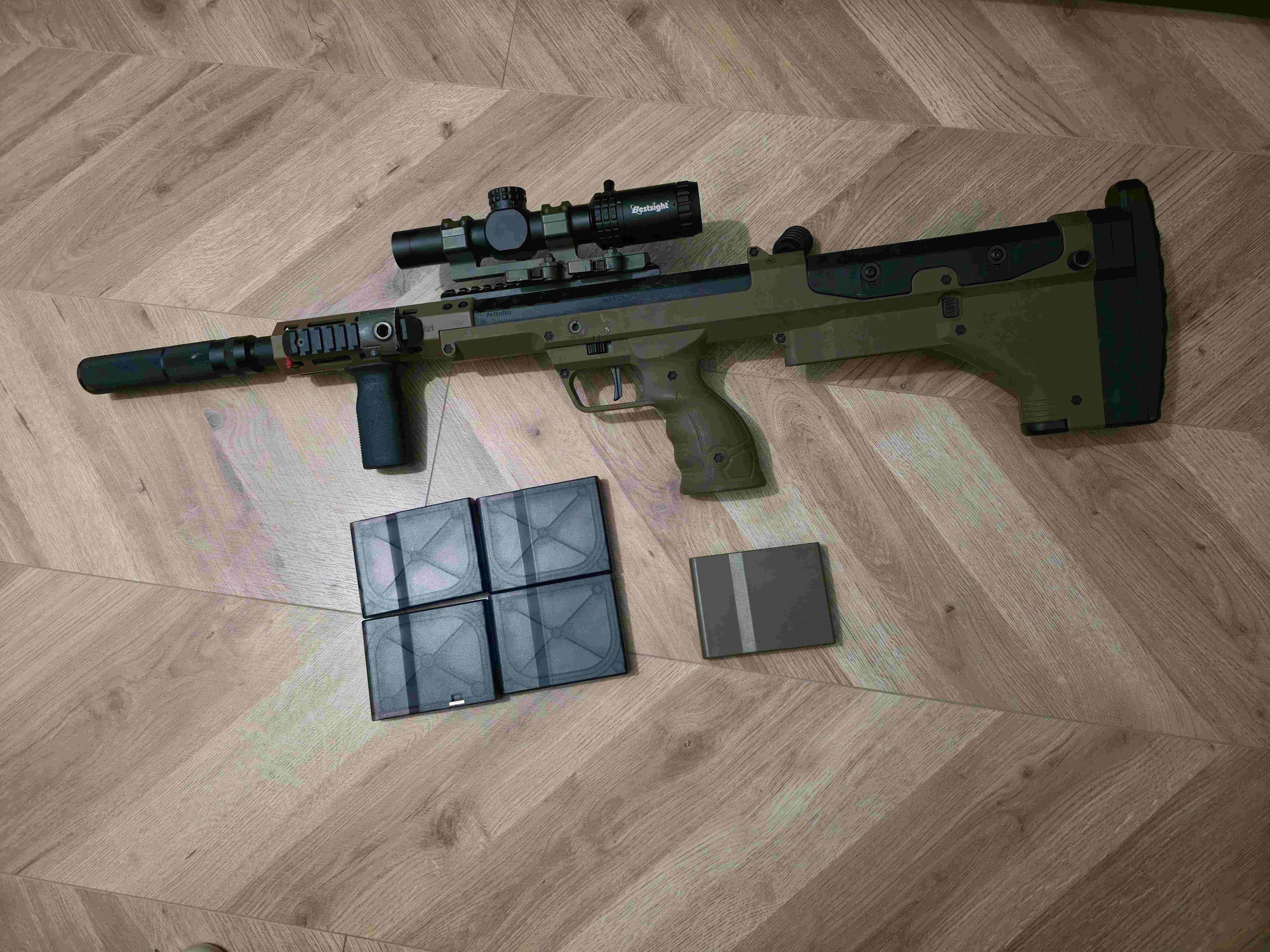 Witam, Na sprzedaż replika sprężynowa Silberback Airsoft Desert Tech SRS-A2/M2 sport 16". Wykonanie w wersji praworęcznej. Replikę posiadam 4 lata. Używana sporadycznie - przebieg około 2000 kulek. W replice wymieniono: 1. Komorę HOP-UP na Maxx model SRE wraz z gumką silverback (nie pamiętam jaki kolor) 2. Sprężynę stock na rapax- jak dobrze pamieam 3+ J. Replika generuje ok. 3J na kulkach 0,48g. Do zestawu dołączam: 5 oryginalnych magazynków Tłumik dźwięku Chwyt przedni. Nie posiadam oryginalnego pudełka po replice. Za dopłatą (150zł) lunetę widoczną na zdjęciu - Bestsight 1-5x. Po zdjęcia w pełnym rozmiarze zapraszam na PW. Możliwe spotkanie i przetestowanie repliki. W razie pytań zapraszam do kontaktu mailowego: dudamateu@gmail.com