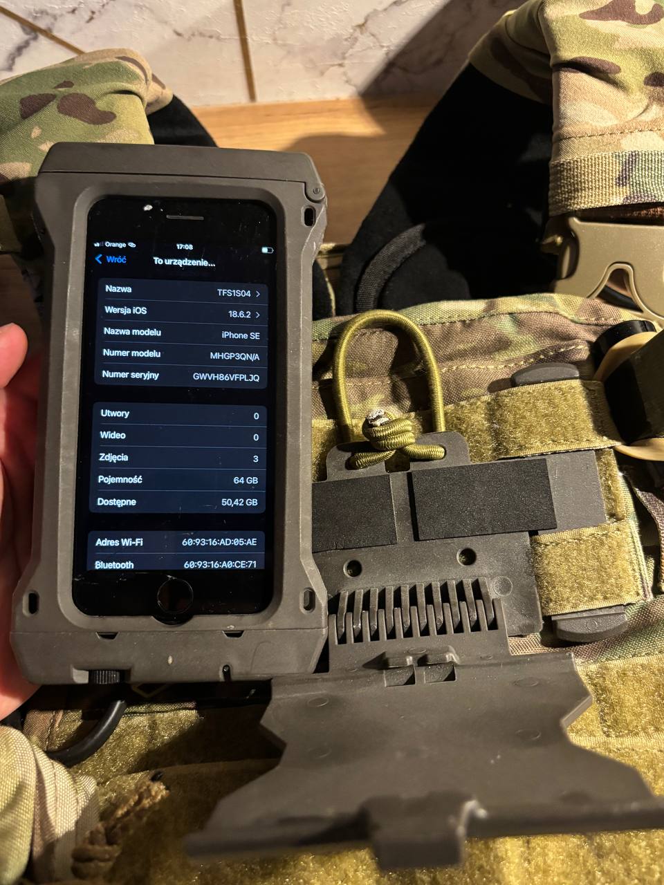Na sprzedaż amatorski panel ATAK/TAK na bazie FMA Juggernaut iPhone 8/SE Case RG, do tego widocznie styrany iPhone SE 2020 64GB, bez blokad, poniszczony jak na zdjęciach ale działa w 100%, nawet aparat. W kejsie jest turbo bezpieczny, to pancerna kopia z mocnego ABSu typu plastik od PMAGów Magpula. W zestawie case, montaz molle i telefon. Brak ładowarki. Case ma otwierany port na ładowarke wiec telefon moze byc zasilany z panela solarnego lub powerbanka w ruchu.