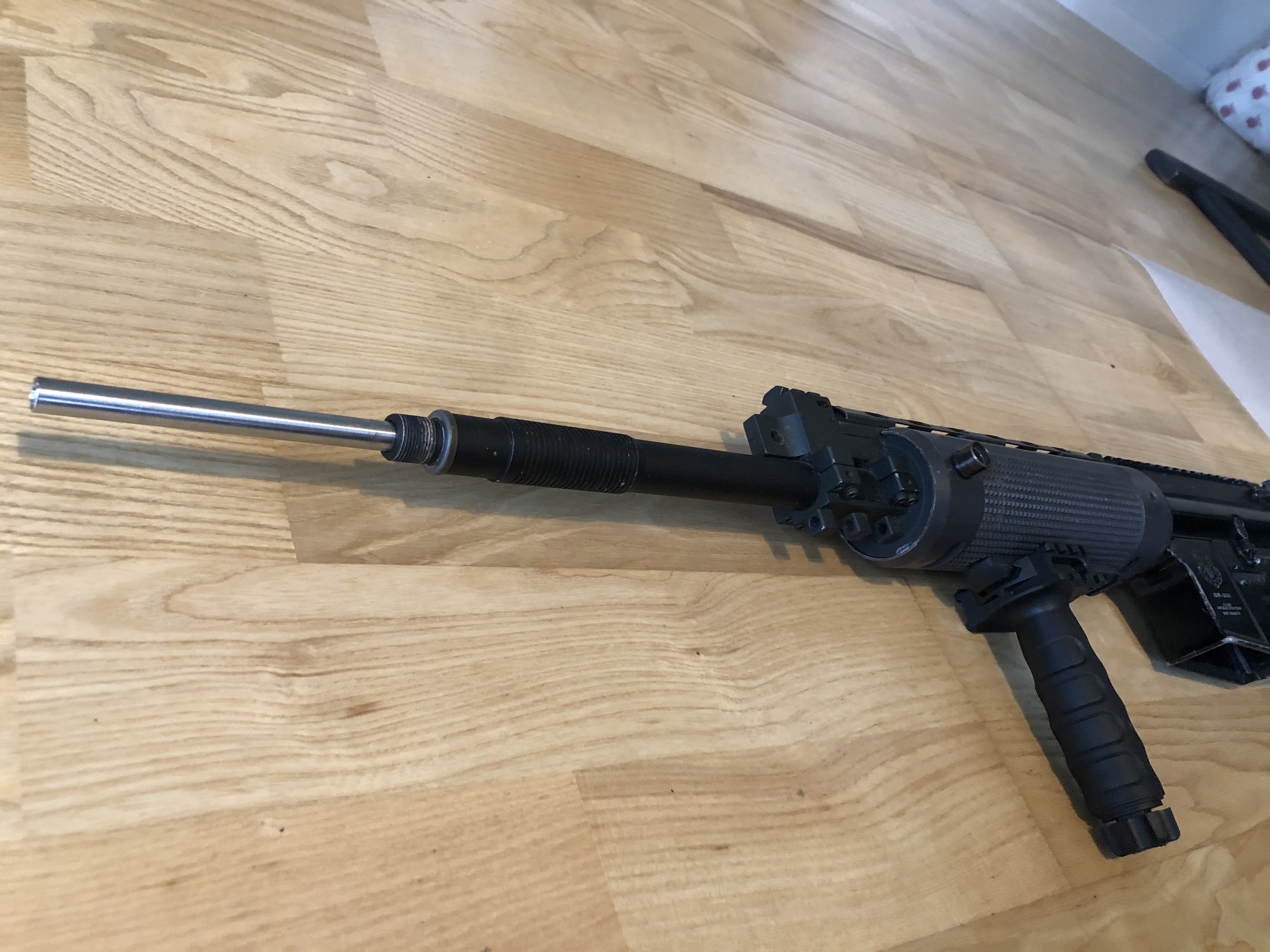 Na sprzedaż replika ASG G&G GR300. Replika kupiona przeze mnie używana, sprzedaję z powodu braku czasu na ASG. Poprzedni właściciel przerabiał ją pod para-snajperkę / DMR: zamontowana przedłużona lufa wewnętrzna, lufa ukryta w imitacji tłumika, mocniejsza sprężyna. Replika była chronowana – wynik około 450 FPS (pomiar sprzed czasu, bez gwarancji aktualnej wartości). Hop-up seryjny G&G, niewymieniany. Replika strzela i działa, sprzedaję ją jako używaną, bez gwarancji i bez pełnej wiedzy o wnętrzu gearboxa (nie była przeze mnie rozbierana). Dobra baza do dalszego tuningu. Stan: wizualnie: normalne ślady użytkowania, mechanicznie: sprawna. W zestawie: replika G&G GR300 oryginalny grip G&G imitacja tłumika (osłaniająca przedłużoną lufę) Gratis dorzucam pas nośny. Brak magazynków.