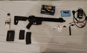 Przedmiotem licytacji jest (TYLKO) używana replika karabinka AR-15 asg. Sprzęt jest sprawny i generuje ~ 1J Zainstalowano moduł sterujący ASTER II bluetooth od GATE, silnik neodymowy 25 rpm, rotacyjną polimerową komorę SHS Na aktualnych częściach replika ma przebieg ~ 2000 kulek Wtyk akumulatora to t-connect. Replika posiada aktualnie inną kolbę w typie SF która zostanie do niej dołączona. Nie jestem w stanie wskazać producenta. https://allegrolokalnie.pl/oferta/ar15-aeg-warsport-lvoa-aster-ii-bluetooth-mbb