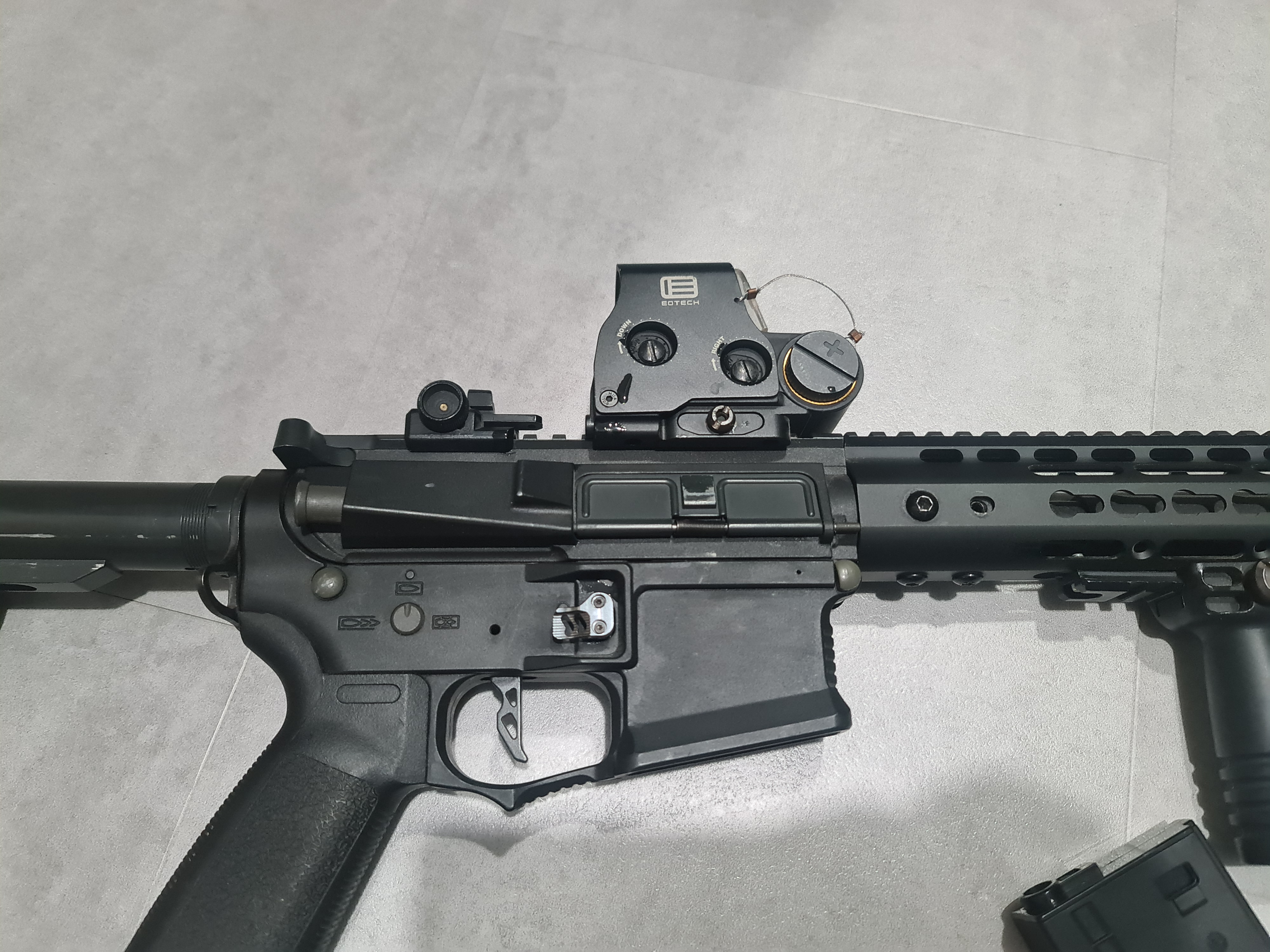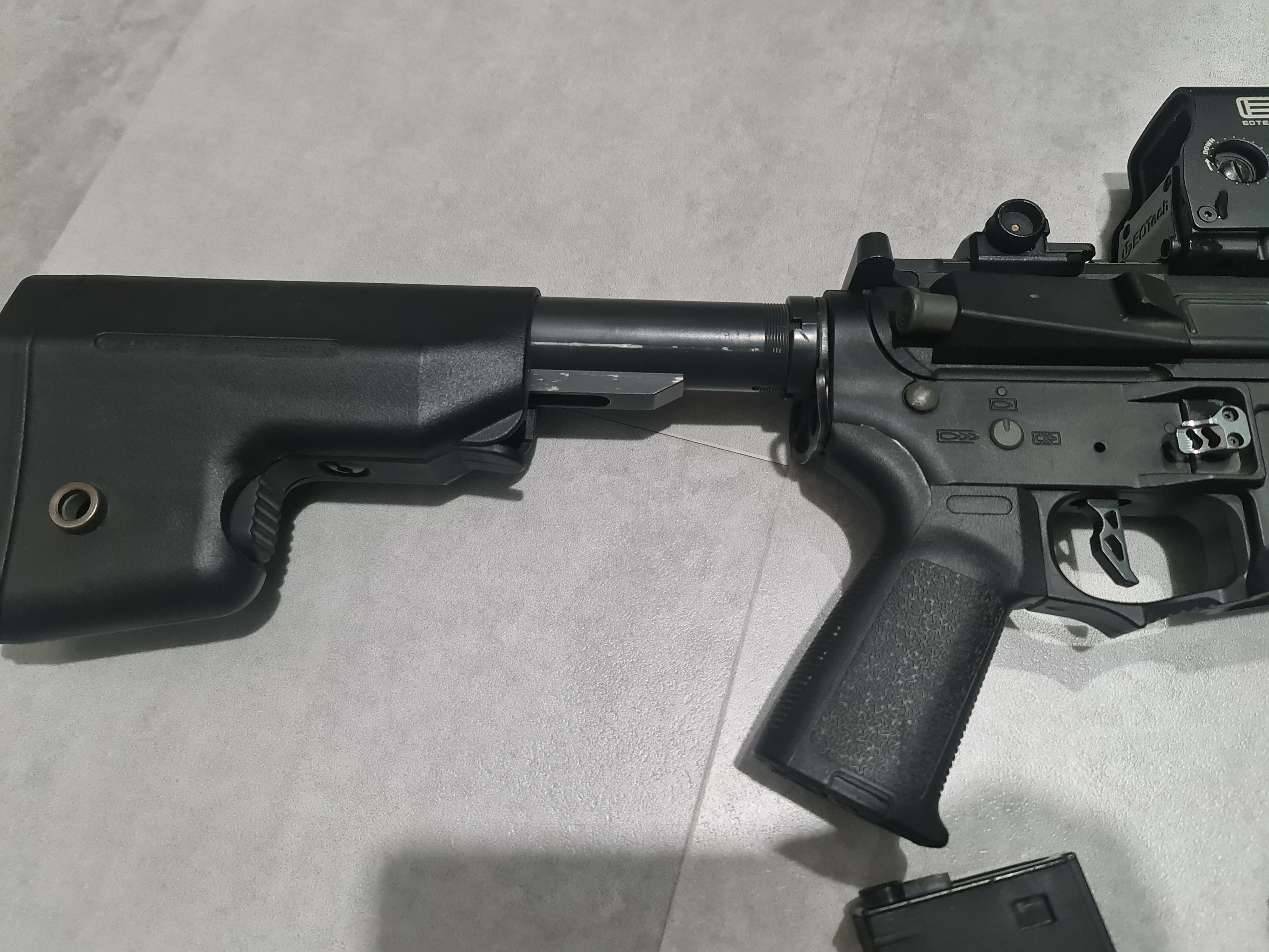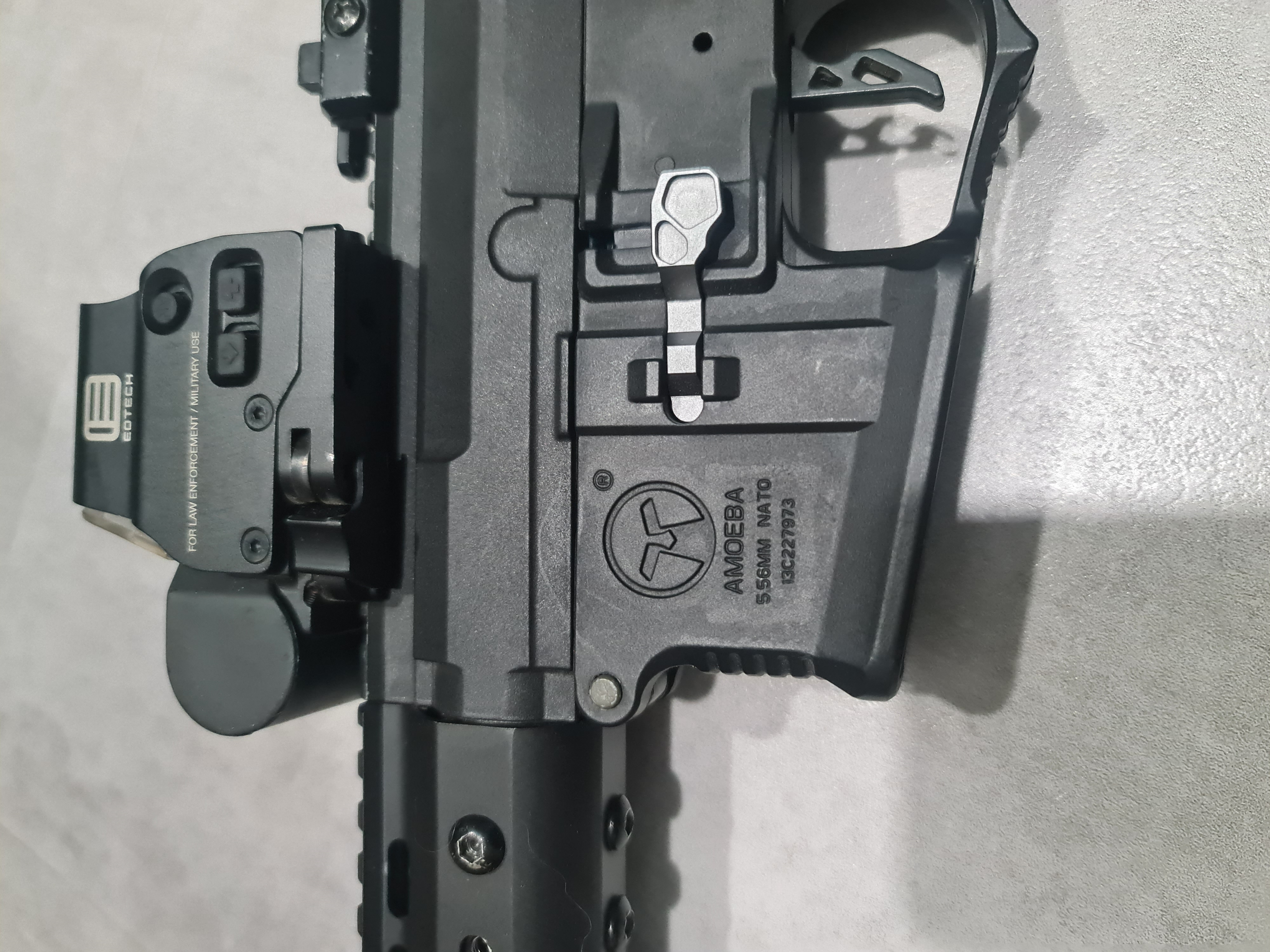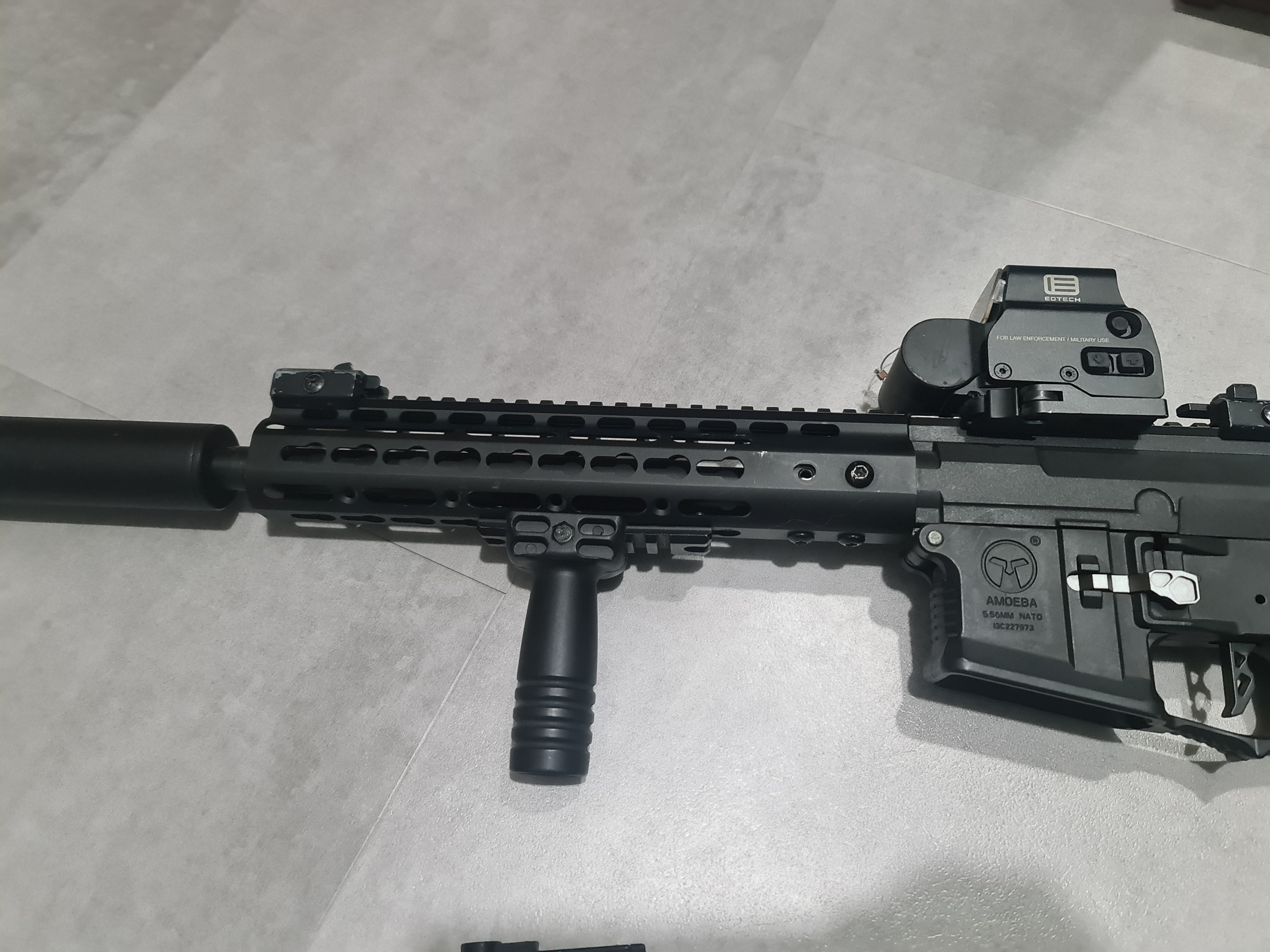 Dzień dobry, Sprzedam replikę po przeróbkach, której bazą była Amoeba. Replika ma wstawiony front key-mod, replikę kolimatora eotech, replikę tłumika ognia. Generuje ok. 400fps, ma stabilny i całkiem dobry zasięg. Z minusów to otwiera się klapka od regulacji gb podczas strzelania. W zestawie są 3 magazynki, z czego jeden warty uwagi to Amoeba PMG 140 i bateria nunchuck 2000mSh, 11.1V 15C/30C.