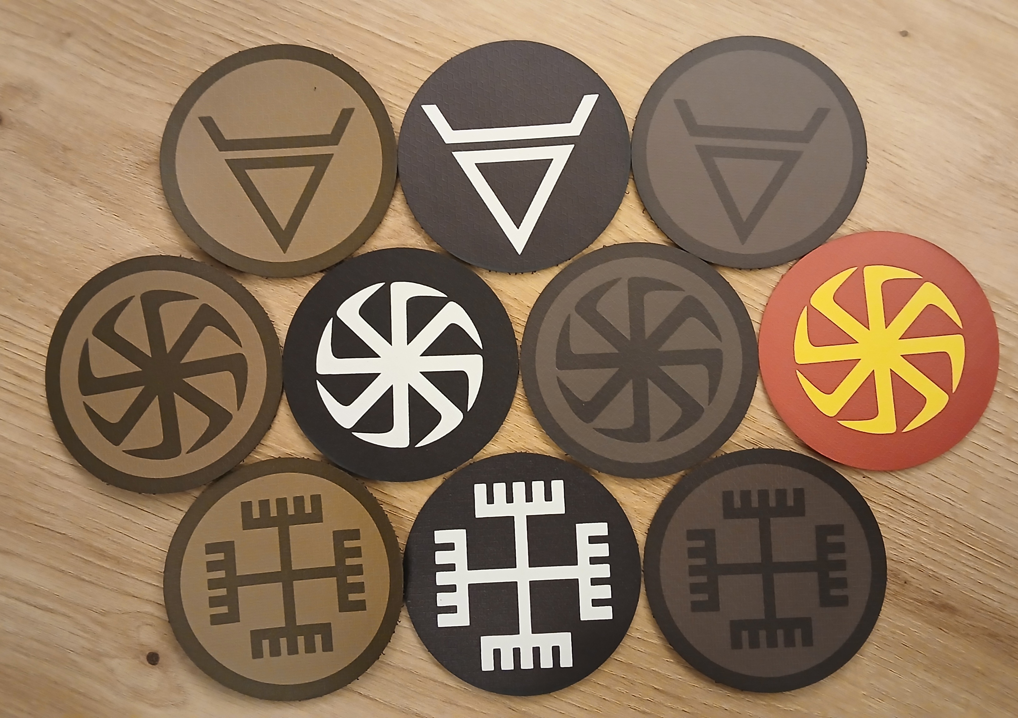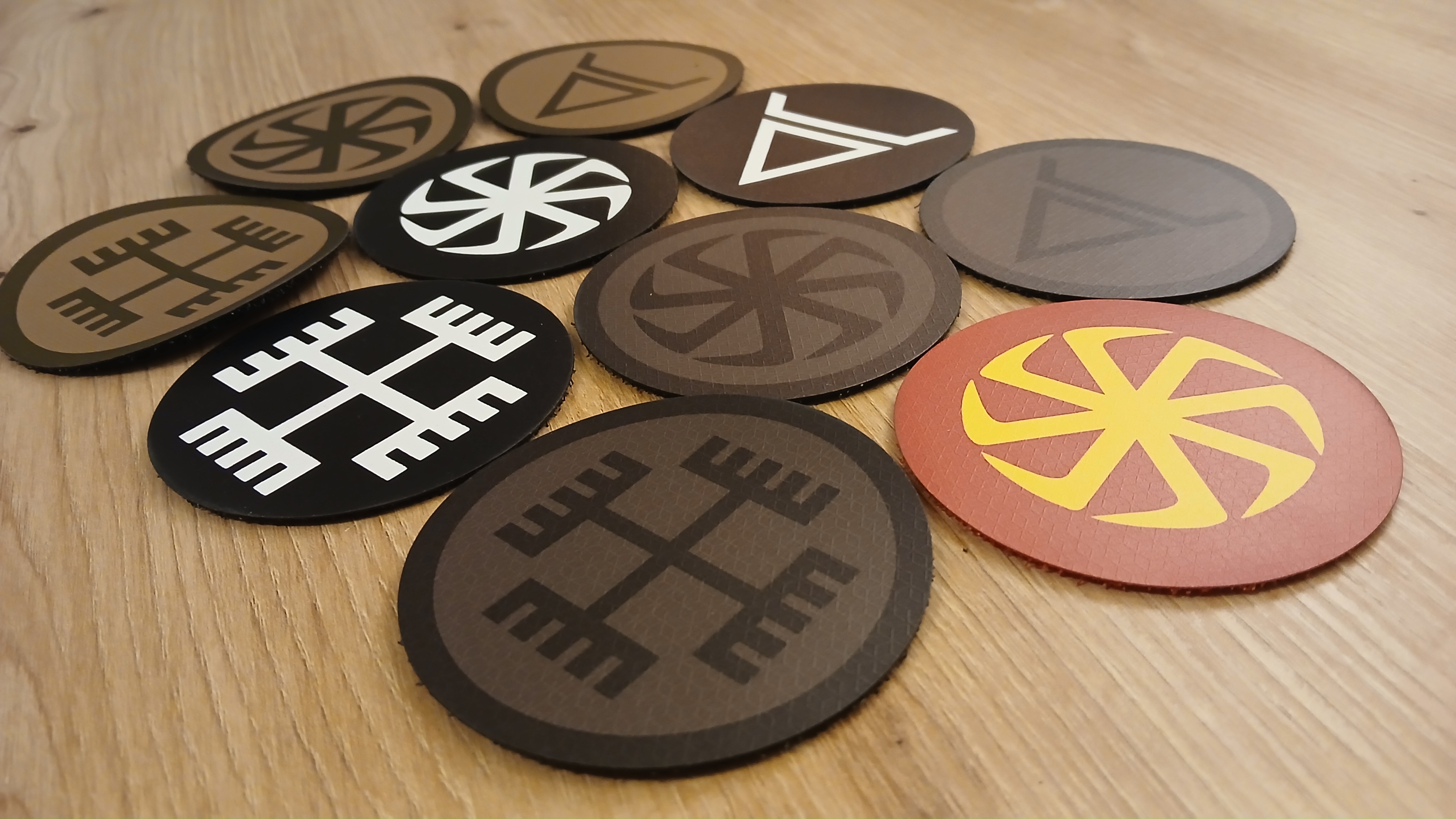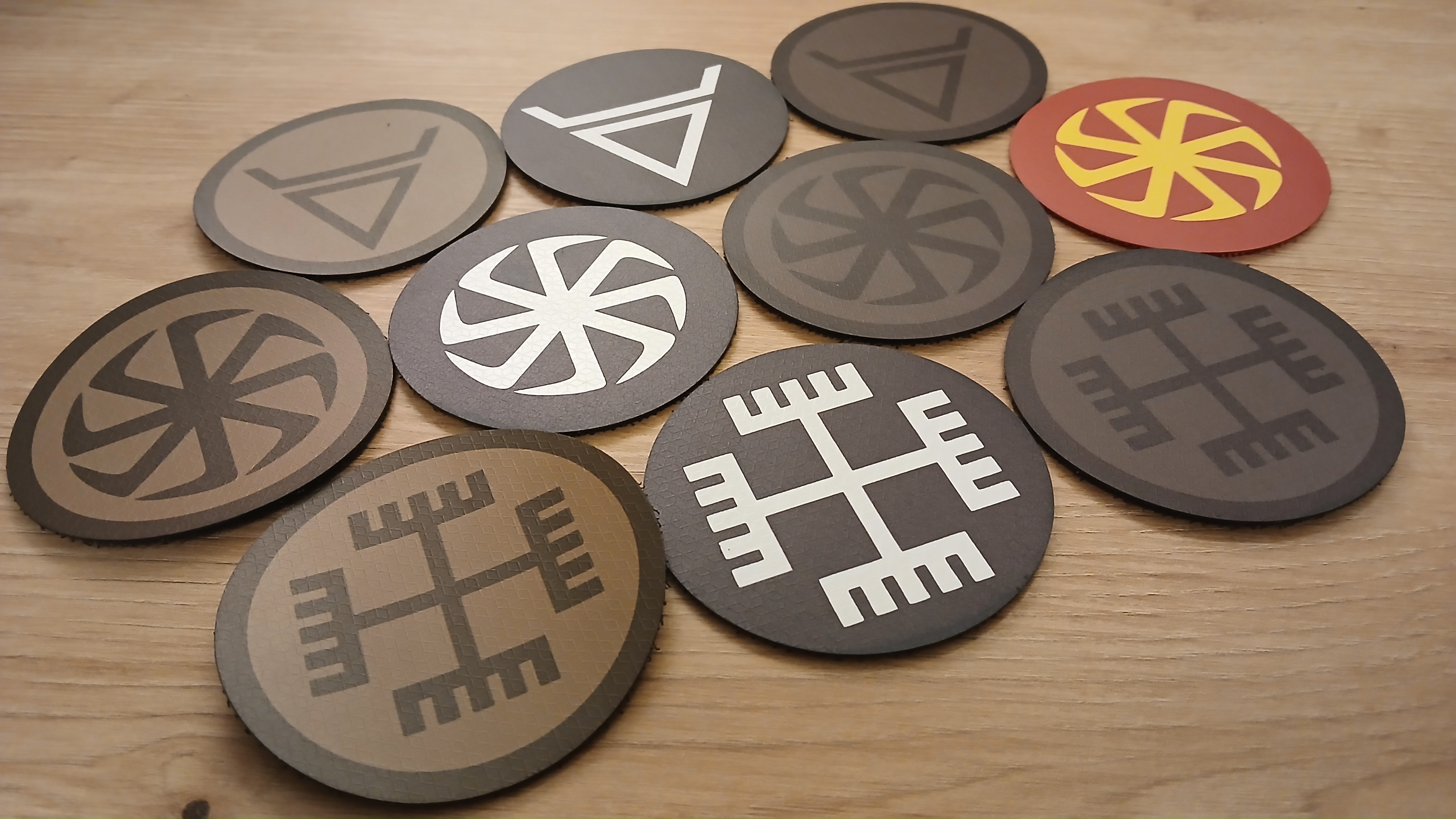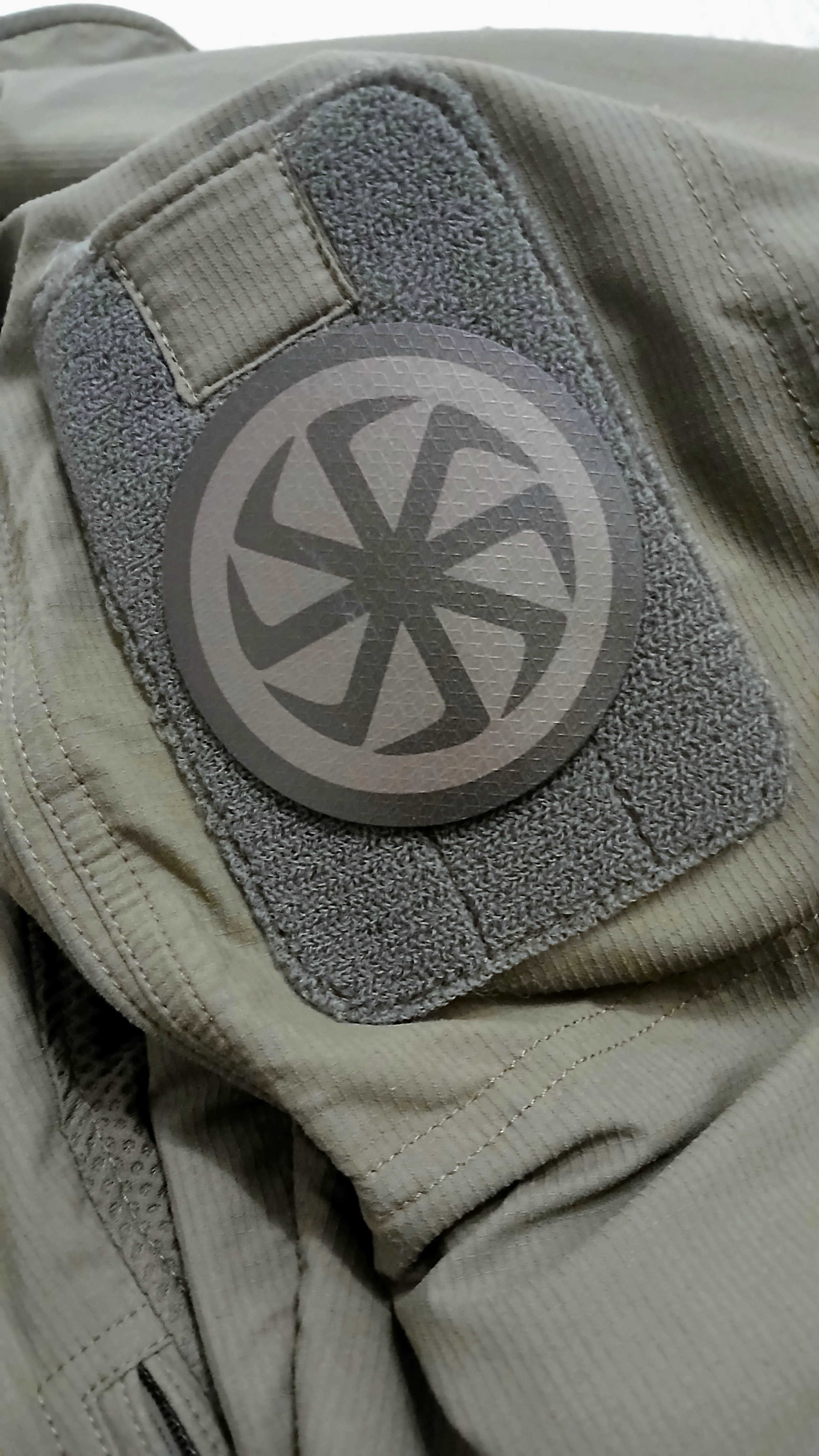 Narzepki/naszywki okrągłe (PVC, bez odblasku, rzep - haczyki z tyłu) o średnicy 8 cm z symbolami słowiańskimi, wykonane wg mojego projektu Do nabycia są poniższe wzory: Okrągła wzór nr 1 Weles kolor 1 - Coyote kolor 2 - Czarno-biała kolor 3 - Ranger Green Okrągła wzór nr 2 Swarzyca kolor 1 - Coyote kolor 2 - Czarno-biała kolor 3 - Ranger Green kolor 4 - Solar/Amarant Okrągła wzór nr 3 Ręce Boga kolor 1 - Coyote kolor 2 - Czarno-biała kolor 3 - Ranger Green Na zdjęciach przykład narzepki w Ranger Green na plecaku 5.11 w kolorze Ranger Green i kurtce UF Pro Hunter FZ Grey Brown