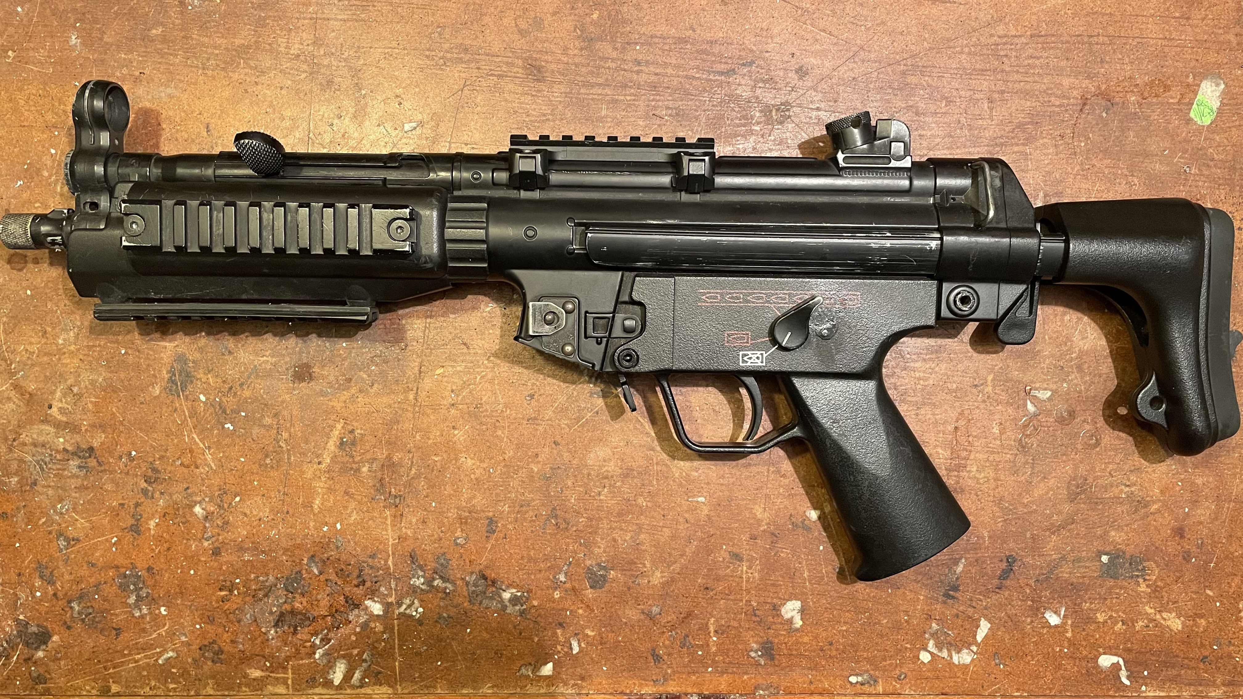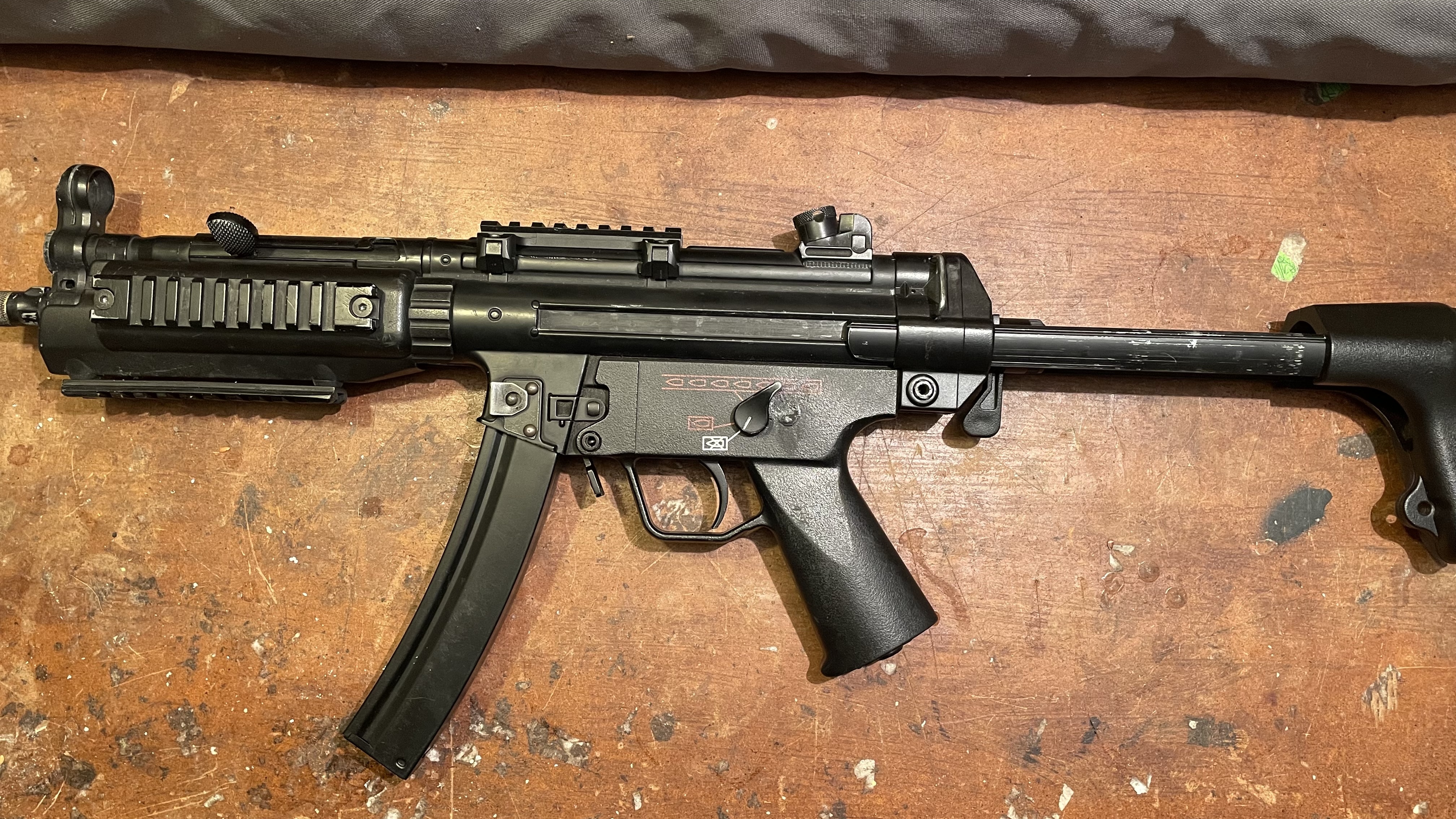 Sprzedam lub zamienię MP5 CYMA. Model CM041 Blue Edition po customizacji: - Kolba z regulowaną długością CYMA (w stocku składana na bok) - Zainstalowany Mosfet V2 CYMA (w stocku brak) - Skrócony travel spustu pod szybkie strzały na semi W środku zmienione przez ekipowego serwisanta: - Gumka zielona G&G - Aluminiowa dysza CNC Retro Arms - Uszczelniony tłok - Wtyczka T-connect Replika zrobiona na limity mazowieckie, niemal równo 349 FPS. Zasięg skuteczny 50 metrów na kulkach 0.28g mierzony taśmą. Fajnie działa w CQB i w lesie. Mechanizm szybkiej wymiany sprężyny i wzmocniony szkielet pozwalają na tuning mocowy samą zmianą sprężyny. Gotowa na LiPo 11.1v. Nad selektorem ognia zrobiona plamka z kleju typu kropelka żeby tryb full auto wchodził z wyraźnym oporem. W zestawie montaż pod optykę i magazynek. Sprzedam lub zamienię na coś innego niż MP5.