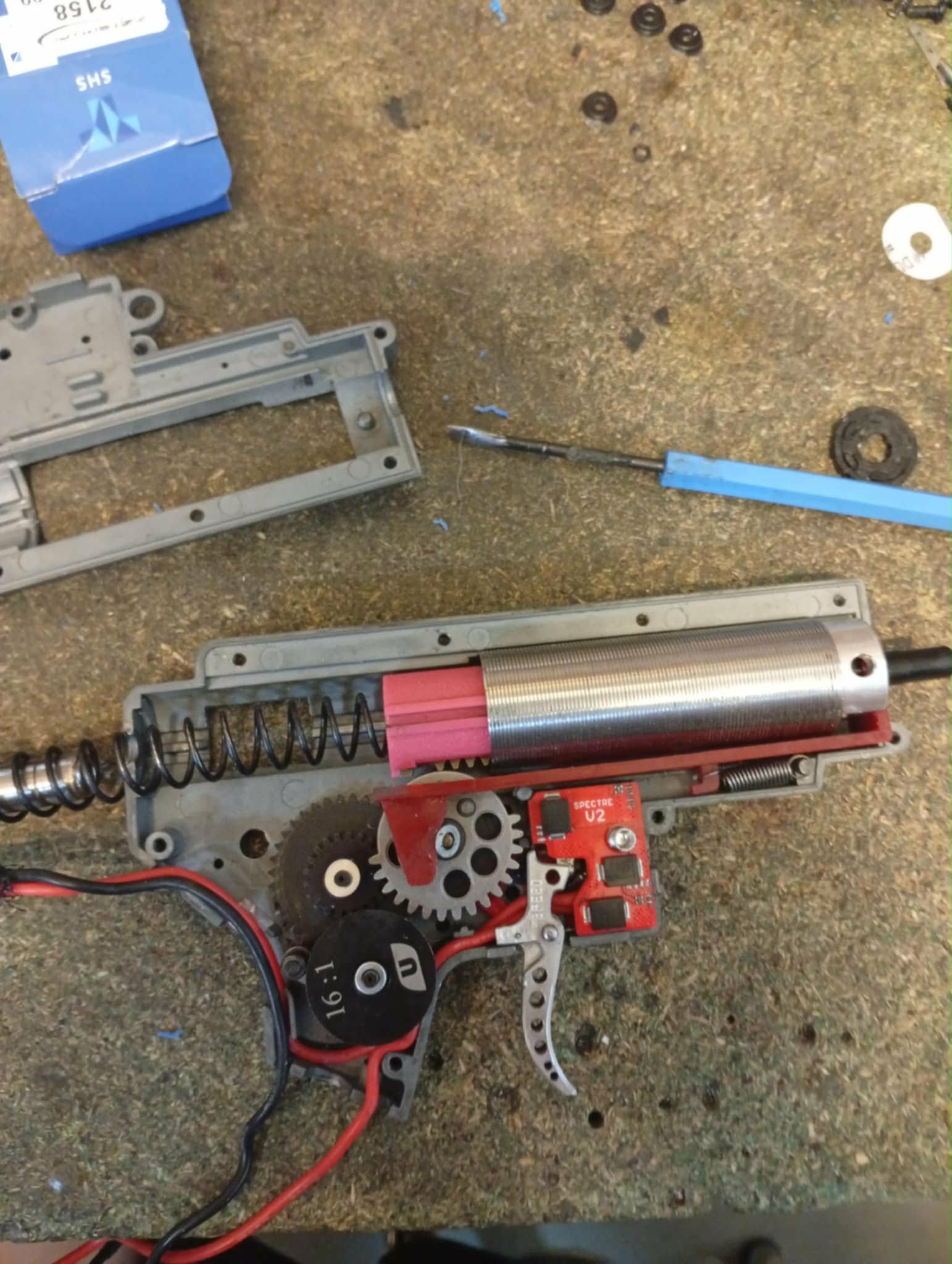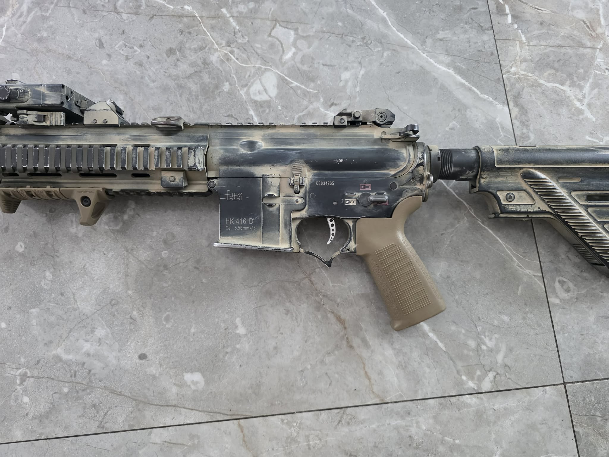 Sprzedam HK416 wersja D wymiana na jakieś GBBR też jak najbardziej możliwa! W środku: - Szkielet GB niestety nie pamiętam jaki. - Mosfet Spectra V2 w pełnie programowalna za pomocą spustu. - Sprężyna Ultimate - Zębatki Ultimate - Tłok też niestety nie pamiętam (różowy coś na prawdę dobrego) - Głwica tłoka Falcon Twin Turbo - Cylinder i głowica cylindra Ultimate - Silnik Czerwony Element - Lufa Prometheus - flathop modify - Dysza i komora stok - Customy spust. Świetna reakcja na spust i bardzo dobra szybkostrzelność, robiona typowo pod szturm 1.9J zasięg 75m spokojnie. AKCESORIA takie jak tłumik/chwyt przedni/Dbal G&P/latarka/okładziny szyn RIS - nie wchodzą w skład zestawu sprzedażowego. W cenie ostrzmujesz: Replika/Pudełko/chwyt pistoletowy PTS/dwie kolby jedna od wersji D a druga od A5 Replika jest pomalowana farbą Fosco!