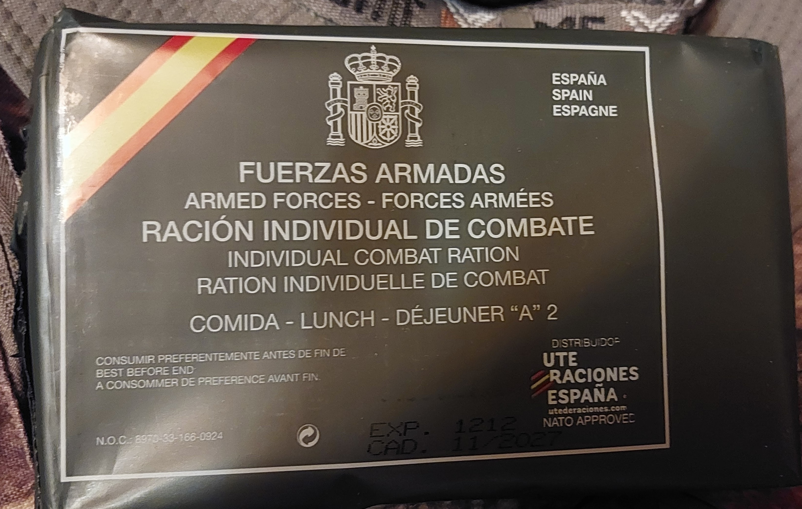 Pozbędę się rzadko dostępnej racji żywnościowej armii Hiszpańskej. Data ważności 2027/11 skład menu A2: Danie główne: Tortellini wieprzowe w sosie pomidorowym (ok. 420 g). Danie dodatkowe: Kalmary w sosie własnym (115 g). Przystawka: Rosół z kurczaka z makaronem (13 g). Deser: dżem pigwowy (50 g).