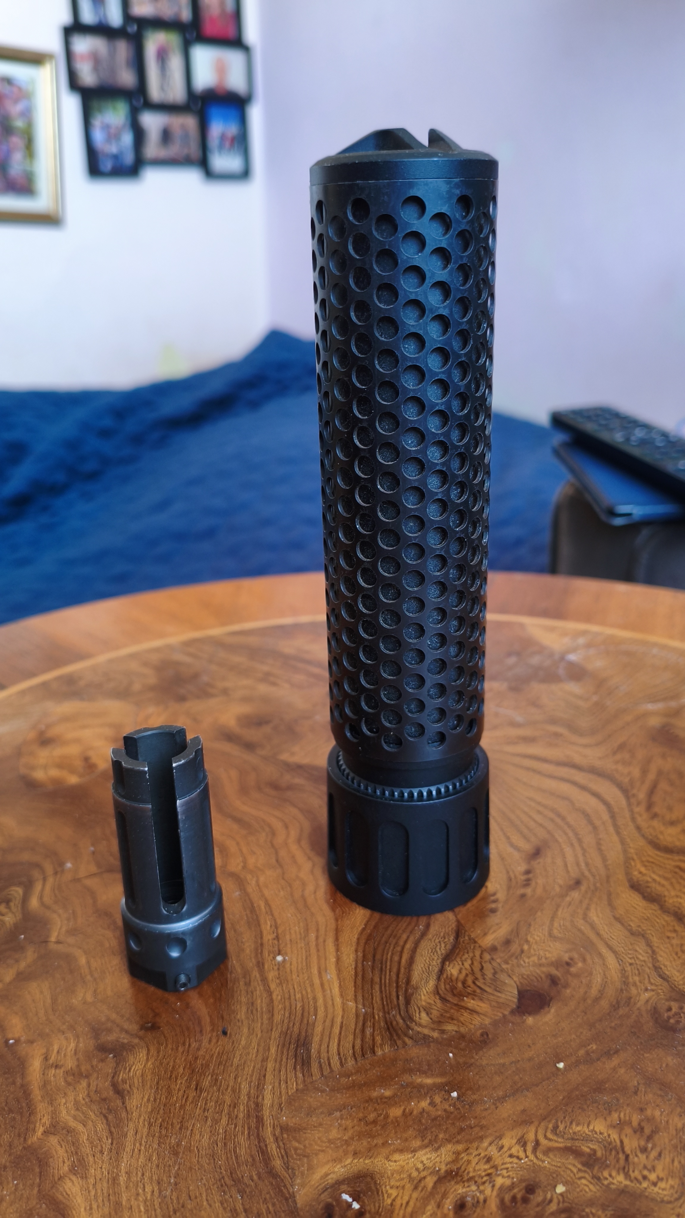 Jak w tytule na sprzedaż Replika tłumika QDC/CQB wraz z urządzeniem wylotowym, długość około 176mm. Niestety nie pamiętam producenta, wydaje mi się że 5KU lub SHS. Stan bardzo dobry z minusem za jakieś drobne otarcia. Preferowany odbiór osobisty w Warszawie okolice skrzyżowania Rozłuckiej z Kinową, dla nie zmotoryzowanych przystanek Kinowa lub Przyczółek Grochowski. Możliwa też wysyłka na koszt kupującego.
