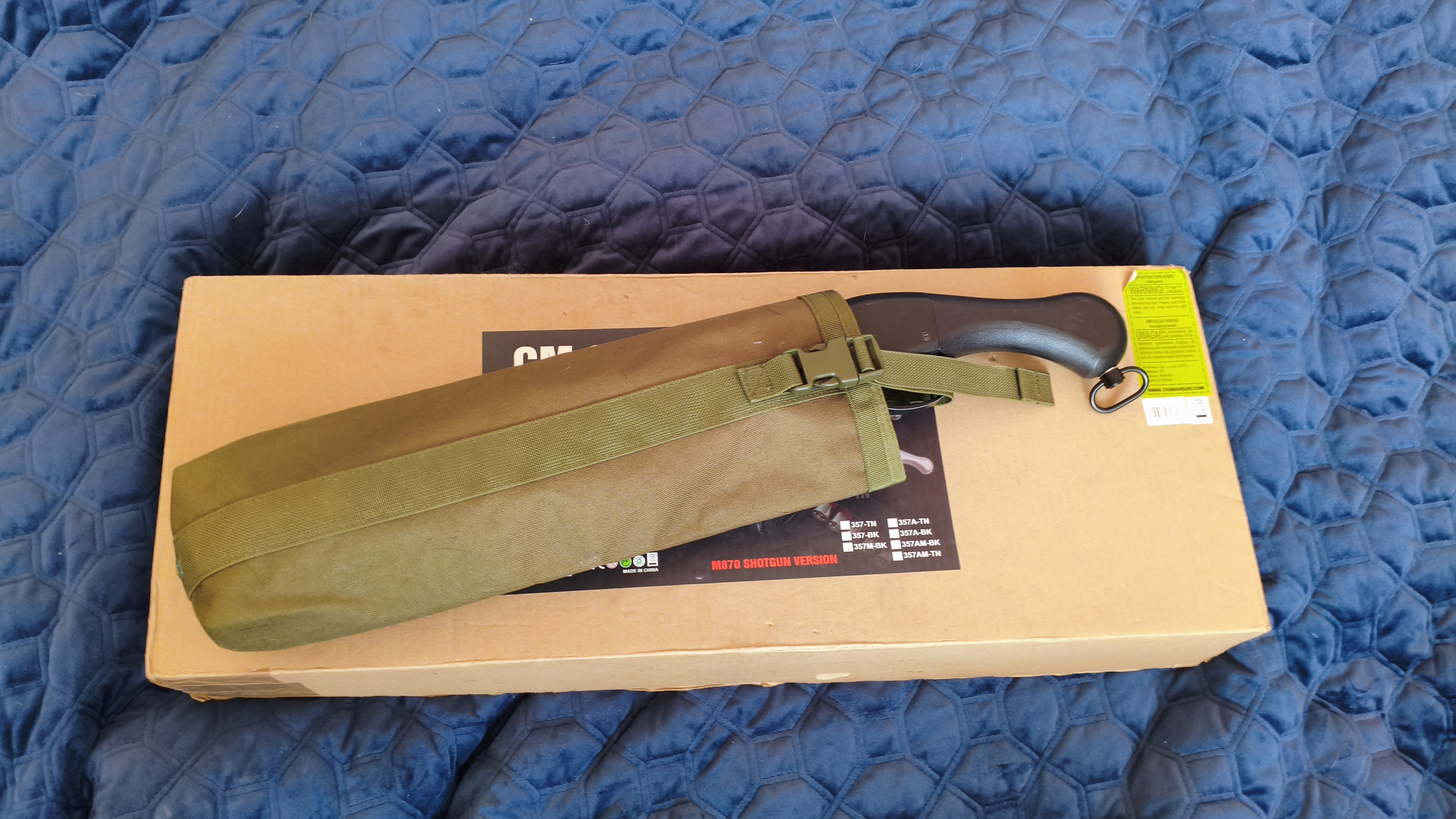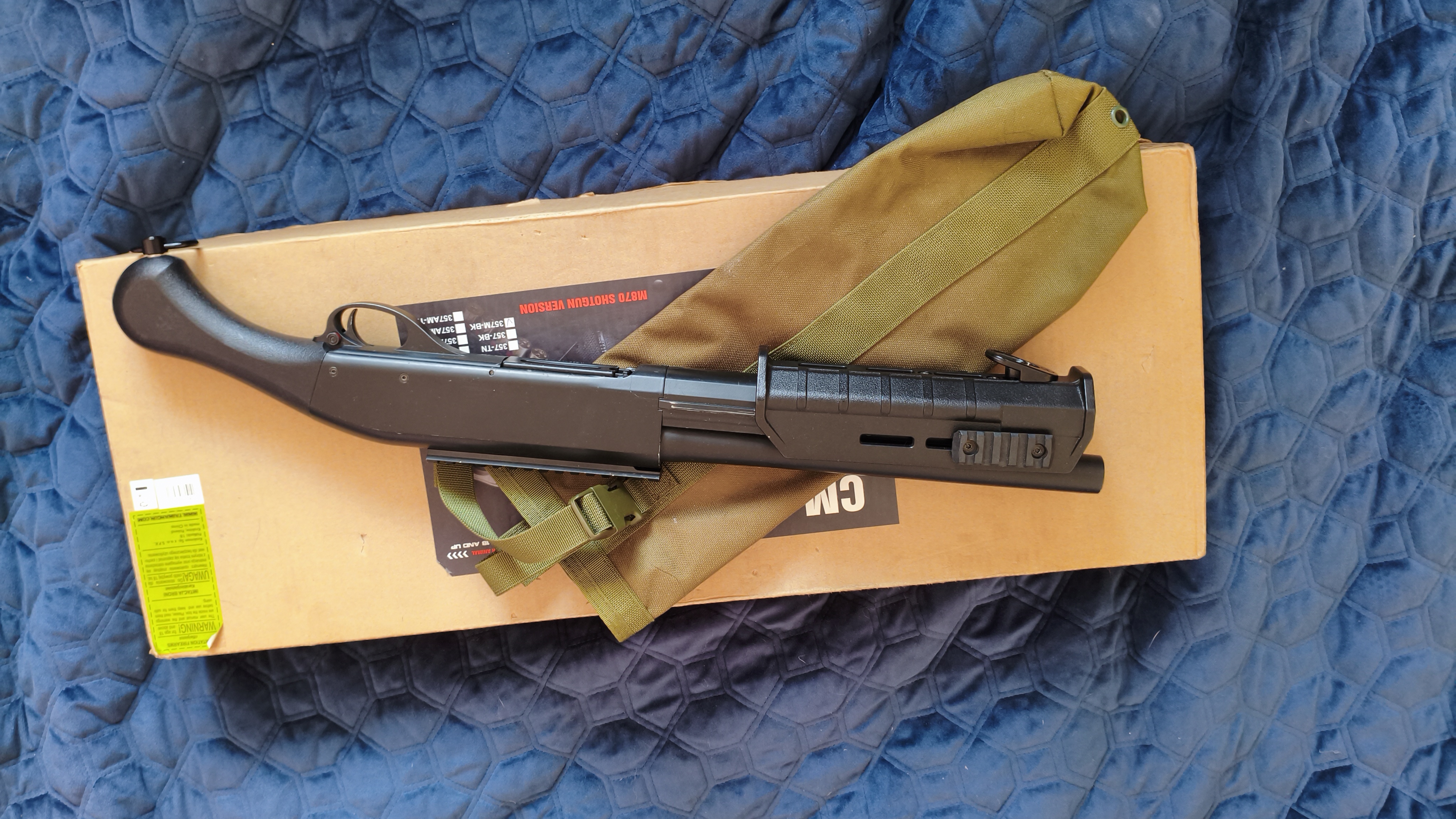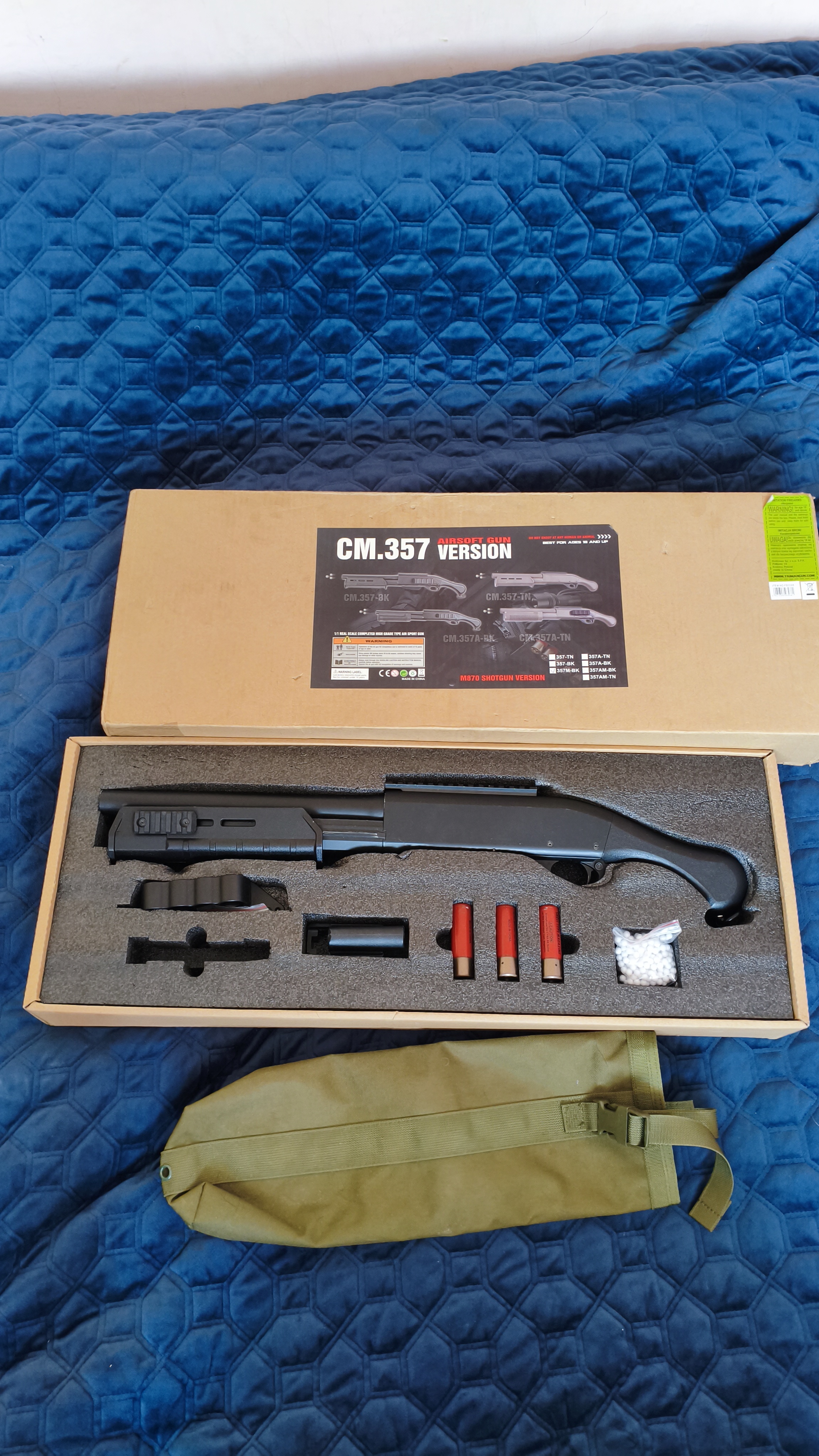 Jak w tytule na sprzedaż sprężynowy shotgun CM.357M-BK plus kołczan z TG, dołożone boczne szyny ris i przednie ucho do zawieszenia z logo Magpula. Stan bardzo dobry z małymi minusami w postaci delikatnego obicia lufy, oraz śladu po kulce na atrapie wyrzutnika łusek i może jakichś drobnych obić. W zestawie shotgun CM.357M-BK, 3 shellsy będące magami na 30bb czyli 10 strzałów każdy, adapter na magi Ar15, dokręcany do body uchwyt na 4 shellsy, pudełko. Preferowany odbiór osobisty w Warszawie okolice skrzyżowania Rozłuckiej z Kinową, dla nie zmotoryzowanych przystanek Kinowa lub Przyczółek Grochowsk. Możliwa też wysyłka na koszt kupującego.