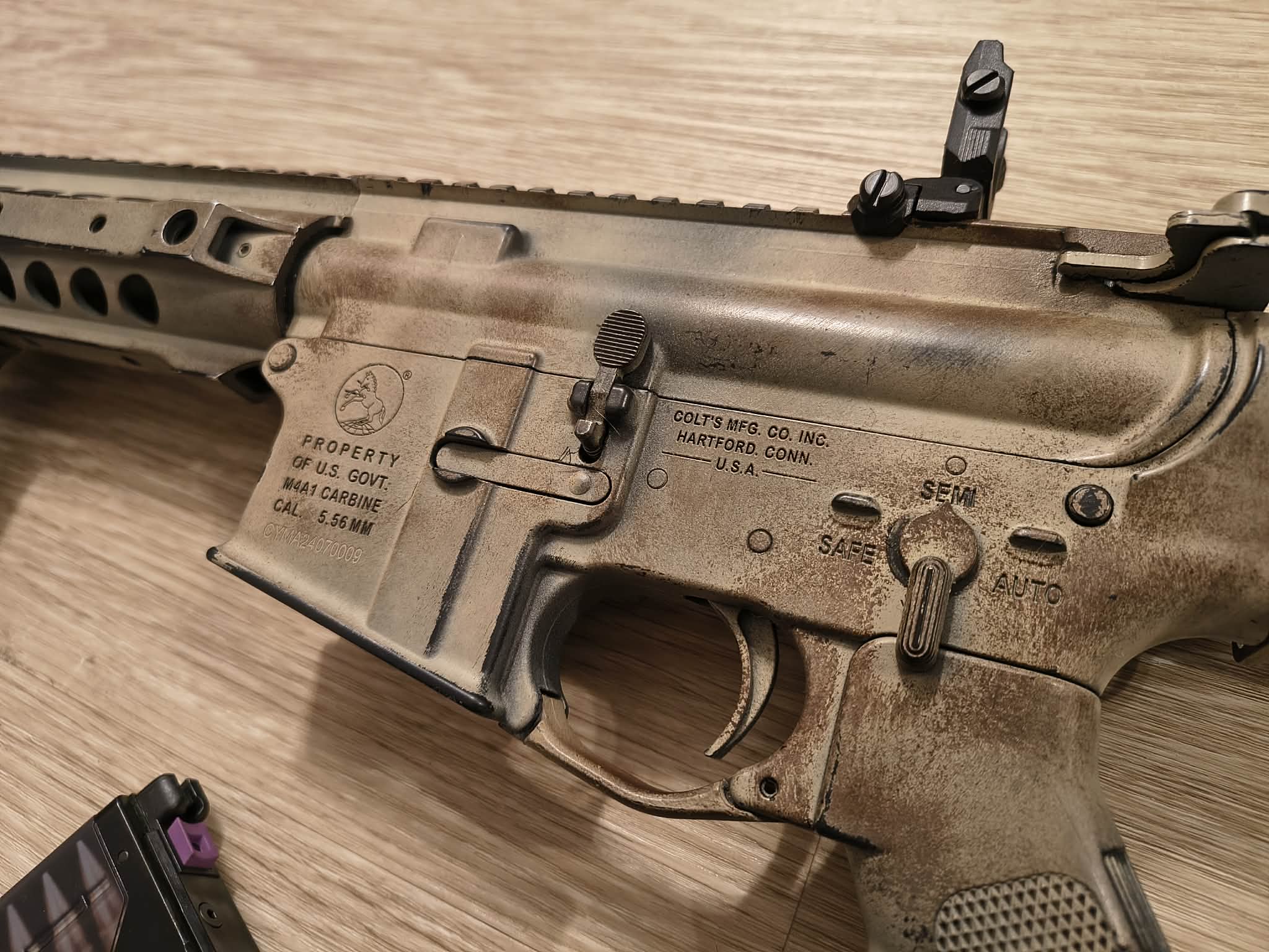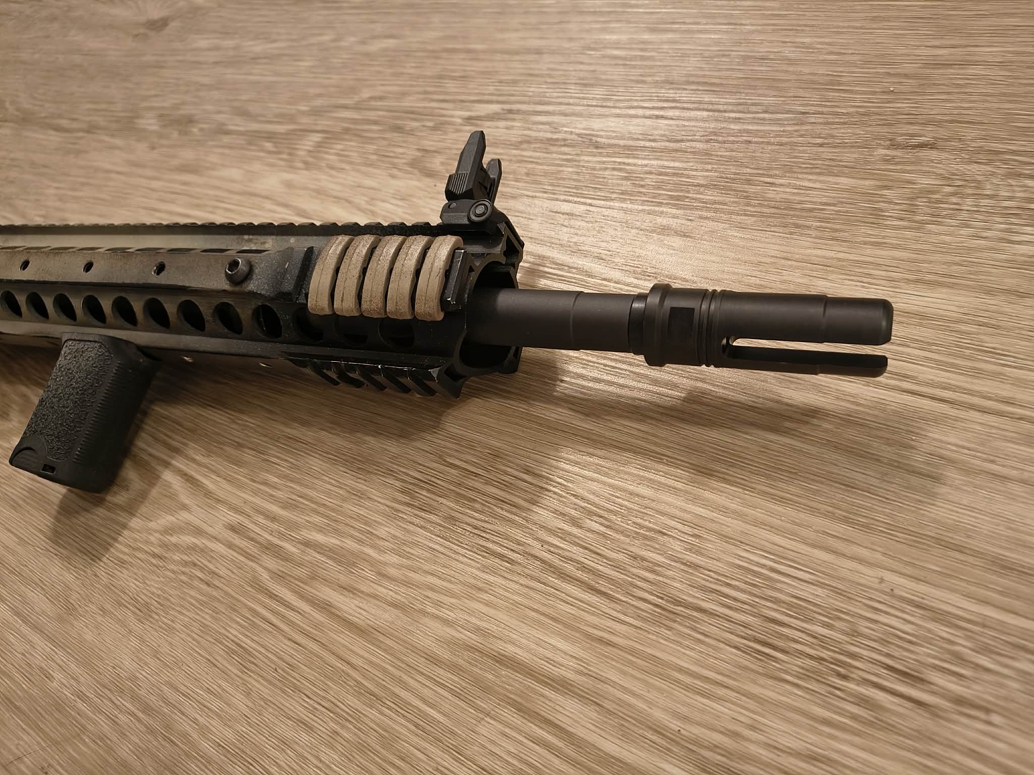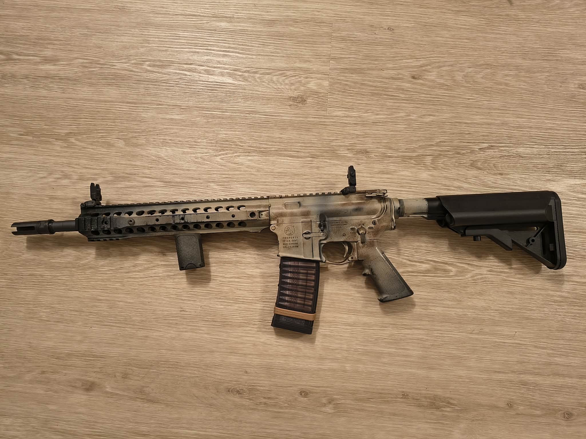 Mało używana replika (ok 2-3K kulek) AR15 od firmy CGS (Gazowe repliki CYMY przy współpracy T8) Replika jest w pełni sprana, w bardzo dobrym stanie widocznym na zdjęciu. Elementy zewnętrzne nawet nie mają wytartej farby. :) Generuje ok 390-410fps/ 0.2g. Ma zmienioną przednią osłonę lufy na replikę KACowskiego SR16. do lufy 14,5'', kolbę, kabłąk spustu i przyrządy celownicze na flip-up Replika należąca do serii CGS od CYMY, czyli rodziny replik napędzanych greengazem, tak naprawdę jedynej sensownej opcji dla tych co lubią repliki na gaz, ale nie koniecznie chcą wydawać miliony na HPA z wężem. Dzięki zastosowaniu seryjnych sylikonowych uszczelek to po przesmarowaniu zaworów olejem sylikonowym można spokojnie grać do temperatury w okolicach 0 co było przeze mnie testowane już kilka razy w praktyce. Naprawdę bardzo fajna zabawka, sprzedaję ponieważ kupiłem drugiego CGS-a tylko pod CQB.