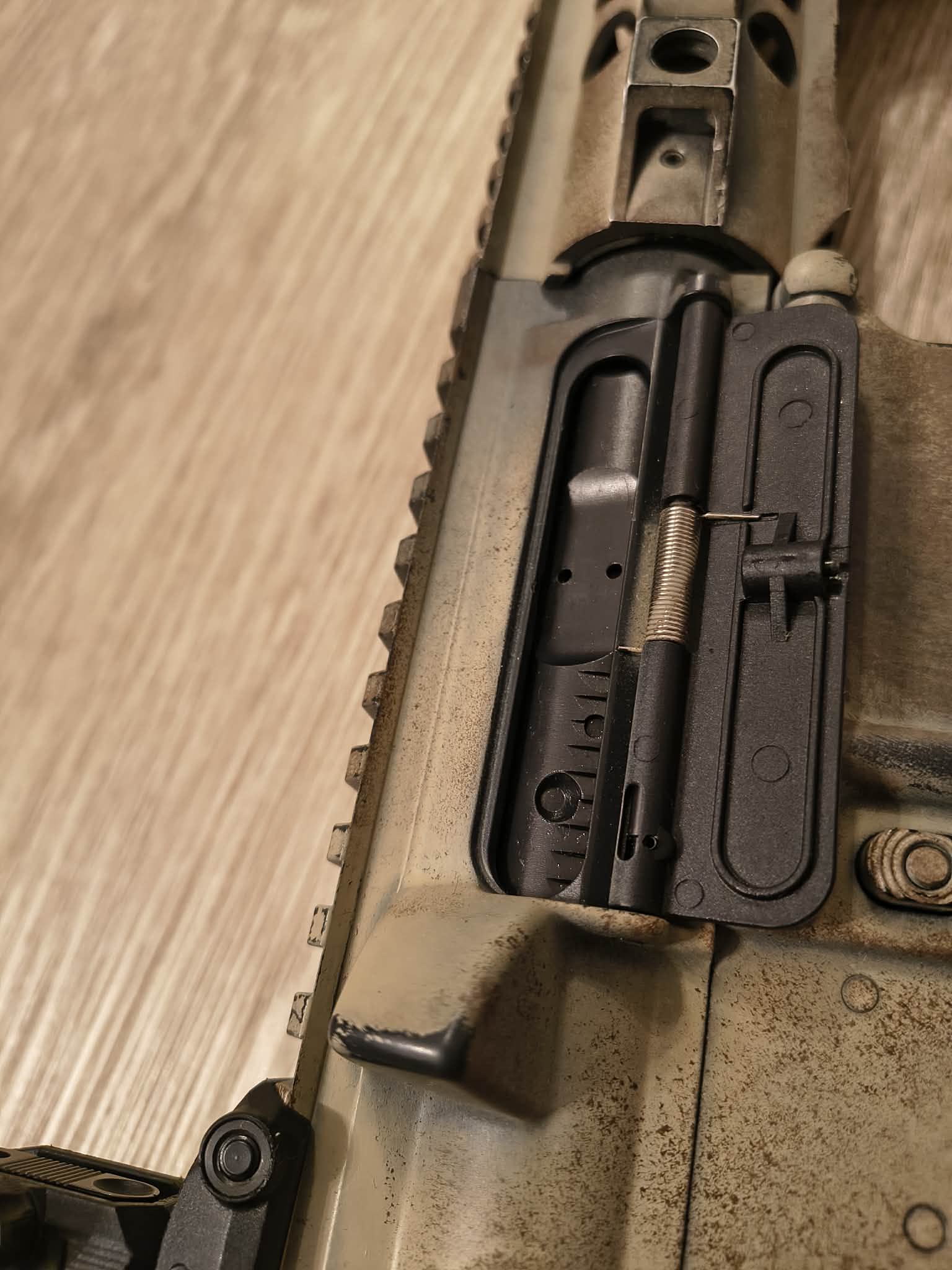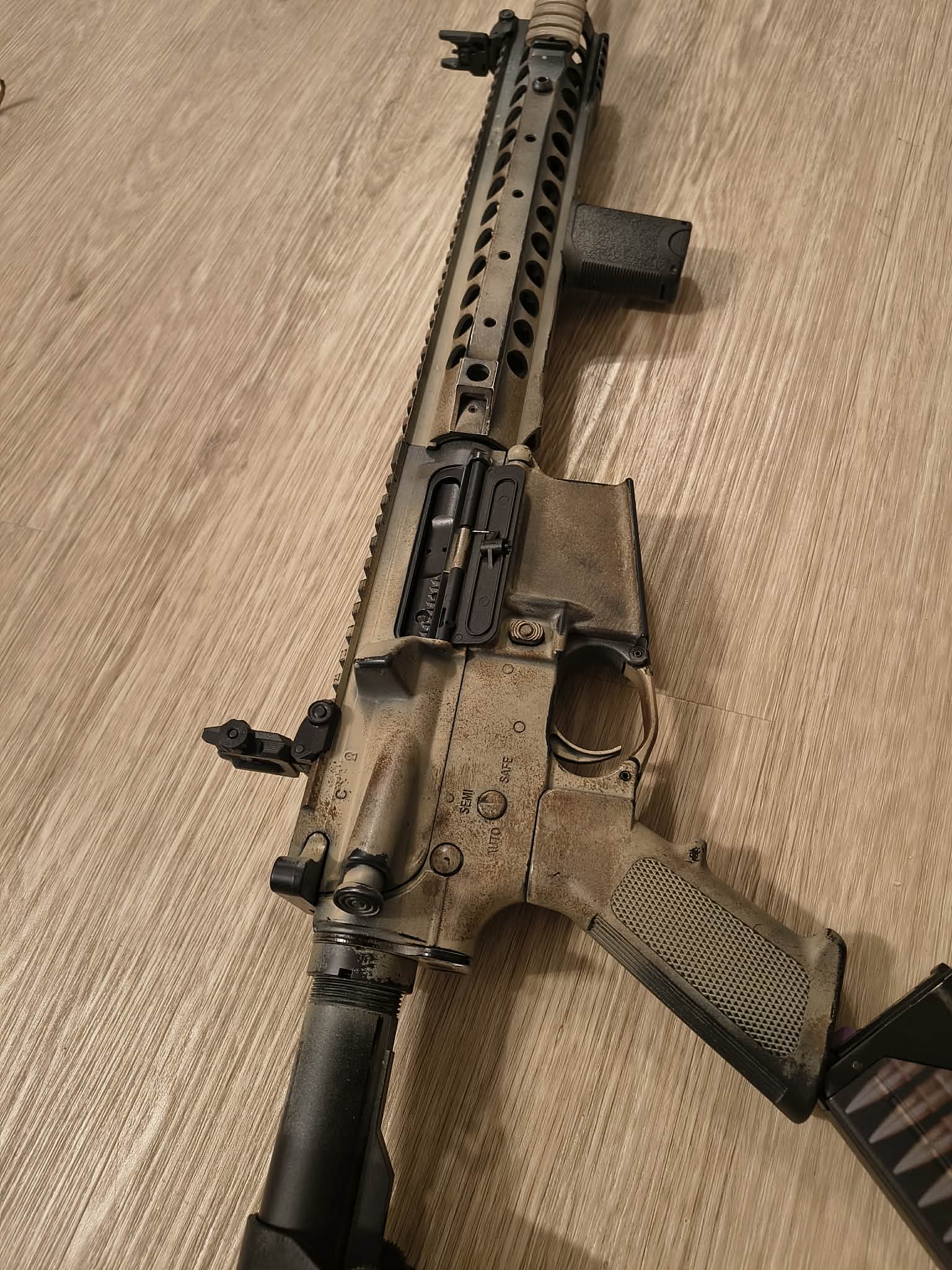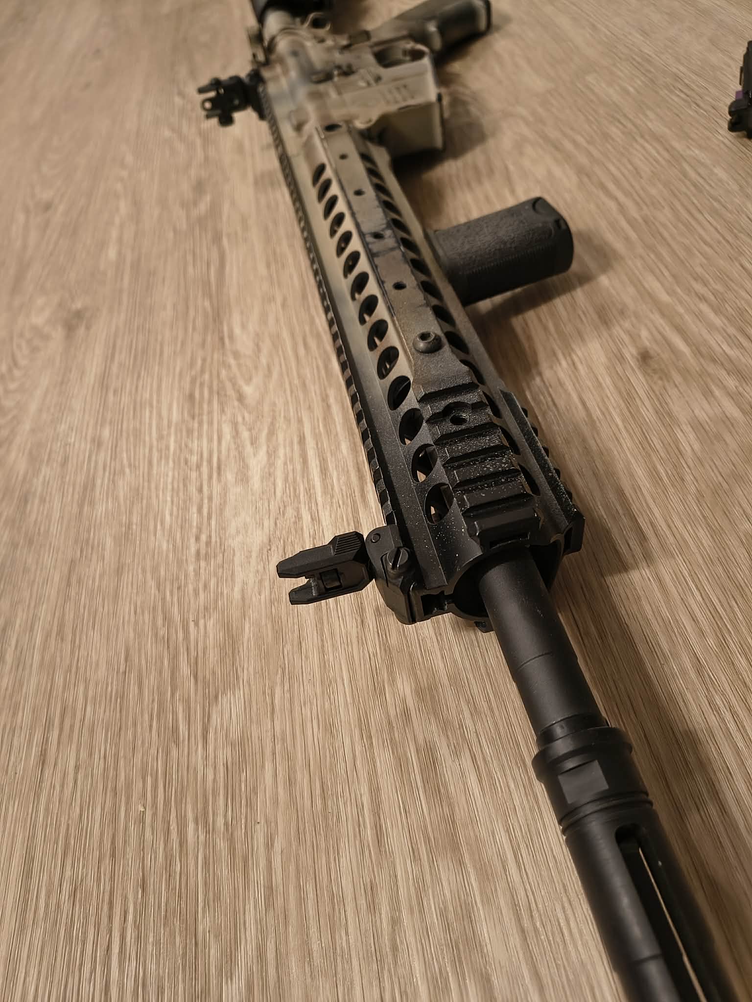 Mało używana replika (ok 2-3K kulek) AR15 od firmy CGS (Gazowe repliki CYMY przy współpracy T8) Replika jest w pełni sprana, w bardzo dobrym stanie widocznym na zdjęciu. Elementy zewnętrzne nawet nie mają wytartej farby. :) Generuje ok 390-410fps/ 0.2g. Ma zmienioną przednią osłonę lufy na replikę KACowskiego SR16. do lufy 14,5'', kolbę, kabłąk spustu i przyrządy celownicze na flip-up Replika należąca do serii CGS od CYMY, czyli rodziny replik napędzanych greengazem, tak naprawdę jedynej sensownej opcji dla tych co lubią repliki na gaz, ale nie koniecznie chcą wydawać miliony na HPA z wężem. Dzięki zastosowaniu seryjnych sylikonowych uszczelek to po przesmarowaniu zaworów olejem sylikonowym można spokojnie grać do temperatury w okolicach 0 co było przeze mnie testowane już kilka razy w praktyce. Naprawdę bardzo fajna zabawka, sprzedaję ponieważ kupiłem drugiego CGS-a tylko pod CQB.