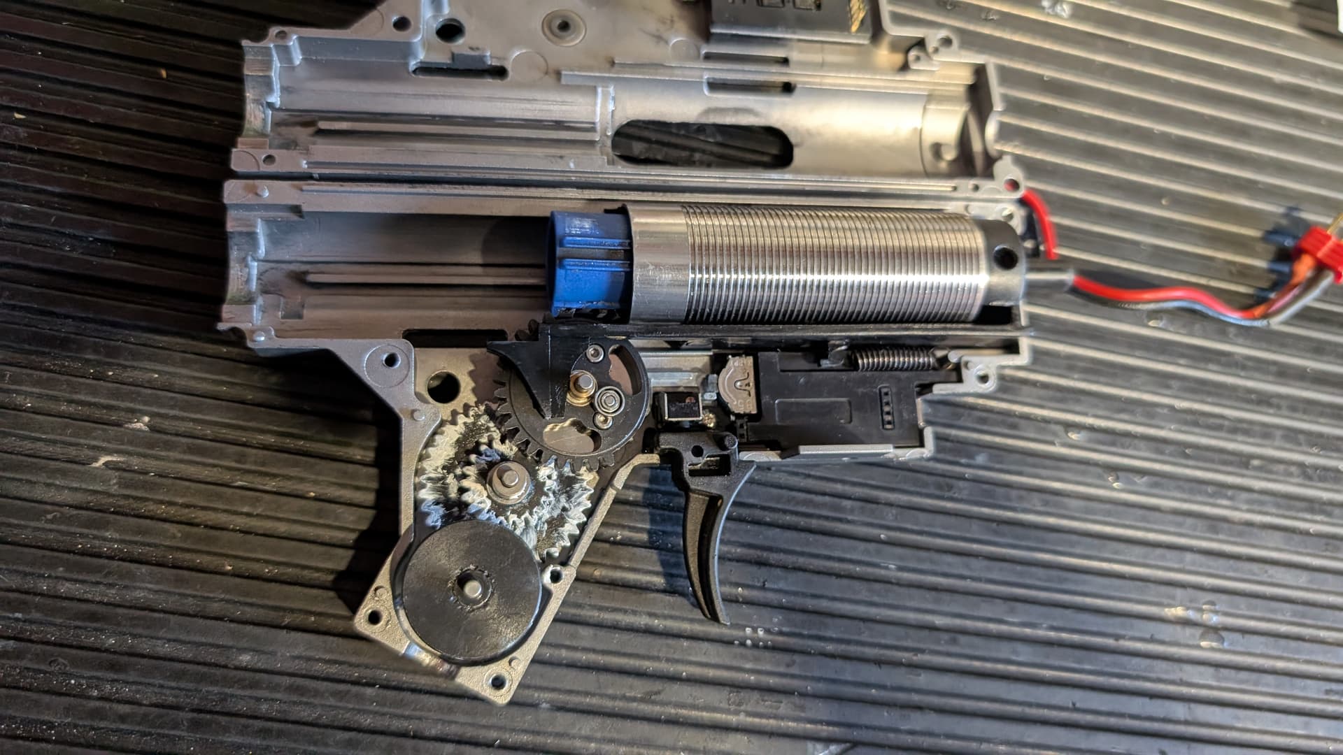 EVO to chyba jedna z przyjemniejszych konstrukcji pistoletów maszynowych dostępna obecnie na rynku. Kto miał okazje pomacać, ten wie jak przemyślana jest tutaj ergonomia i wykonanie. Replika posiada dedykowany układ sterownia z 4 pozycjami selektora (safe, semi, seria 3s., auto) i opcją wykrywania pustego maga. Szybka wymiana sprężyny w replice nie wymaga narzędzi, wystarczą dwa palce :wink: Technicznie: - Sorbopad na głowicy cylindra - Zmieniony tłok na SHS - Cylinder zmieniony na SHS - Zębatki 18:1 SA - gumka żółty Maple Leaf - 1.85J @ 0.25g - po przeglądzie Minusy: Dwie śrubki bocznego chwytu mają luz - standard tego modelu. Klejone na klej do gwintów Przy zrzucie pokrywa zamka czasami staje na kilka milimetrów przed właściwą pozycją