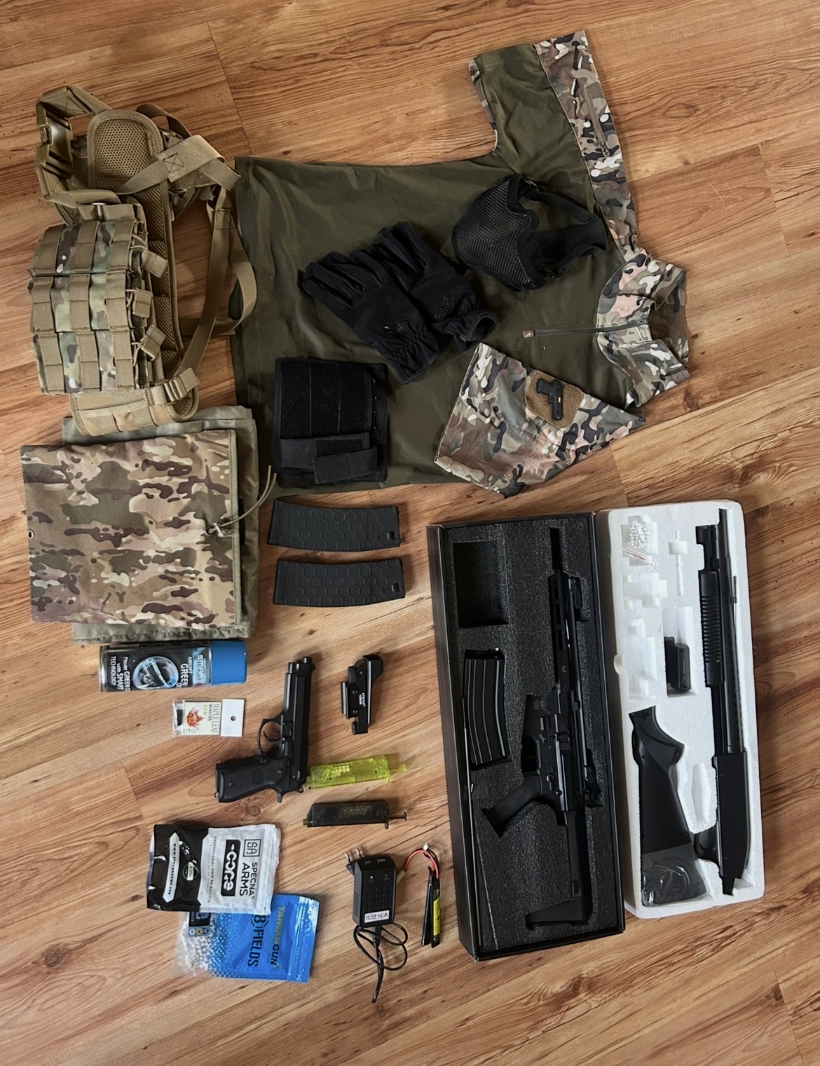 Sprzedam swój zestaw do ASG który nigdy nie ujrzał strzelanki z prawdziwego zdarzenia. Wszytko świeżutkie, jedynie przetestowane. Na pytania chętnie odpowiem - M904G DOUBLE EAGLE + LiPo 1450mAh z ładowarką - AGM003 LONG (2 magi) - BERETTA M9 NA GREEN GAS - Dwa dodatkowe magazynki do M’ki - Kolimator NoName - T-shirt Turtleneck Multicam - Pas taktyczny z kaburą, torbą zrzutową i trzema magazynkami Multicam - Rękawiczki AC Quick Release Czarne - Maska Czarna Stalker - Gumka Hop Up Maple Leaf (nowa) - Torba na broń, trochę kulek i dwie nabijarki