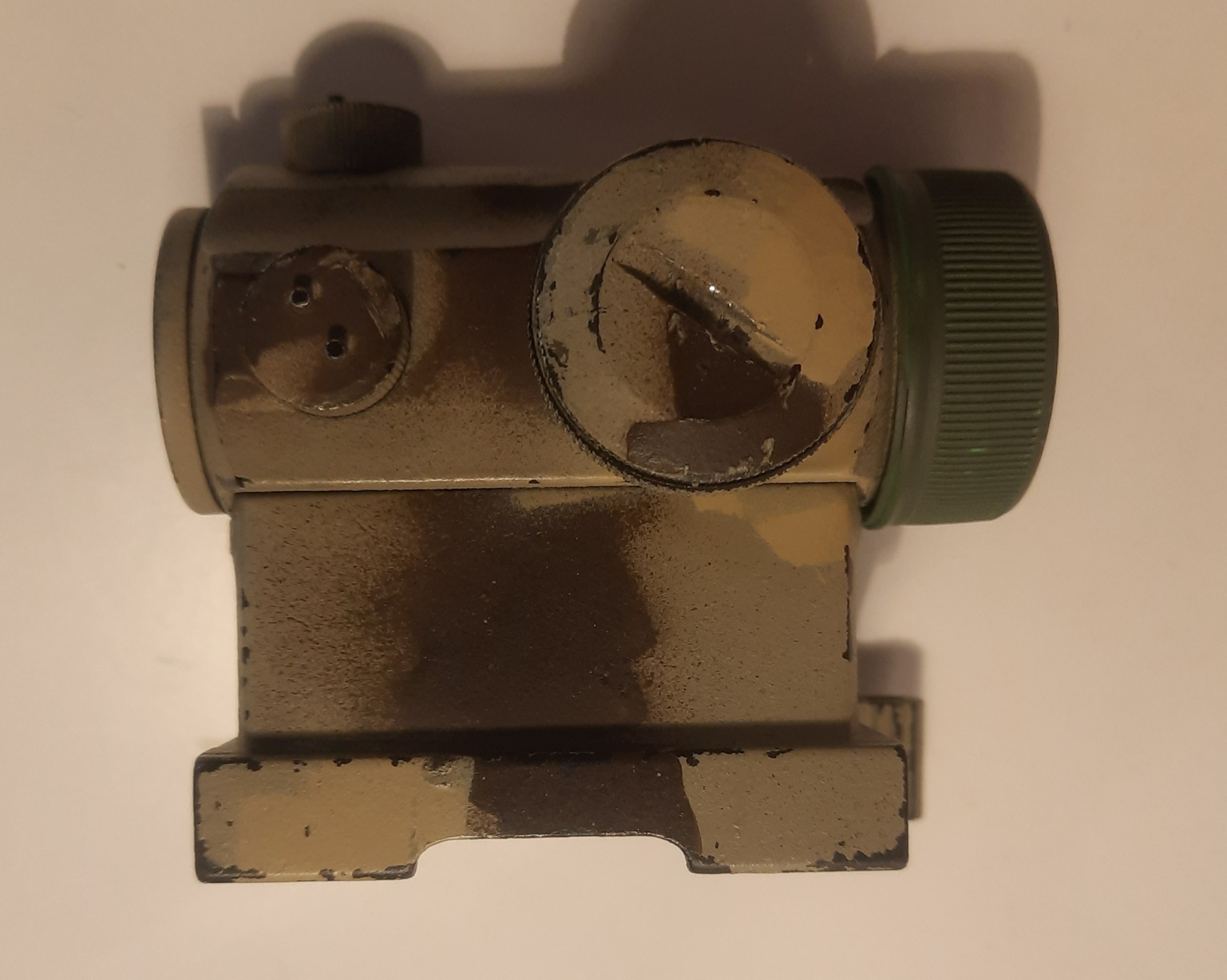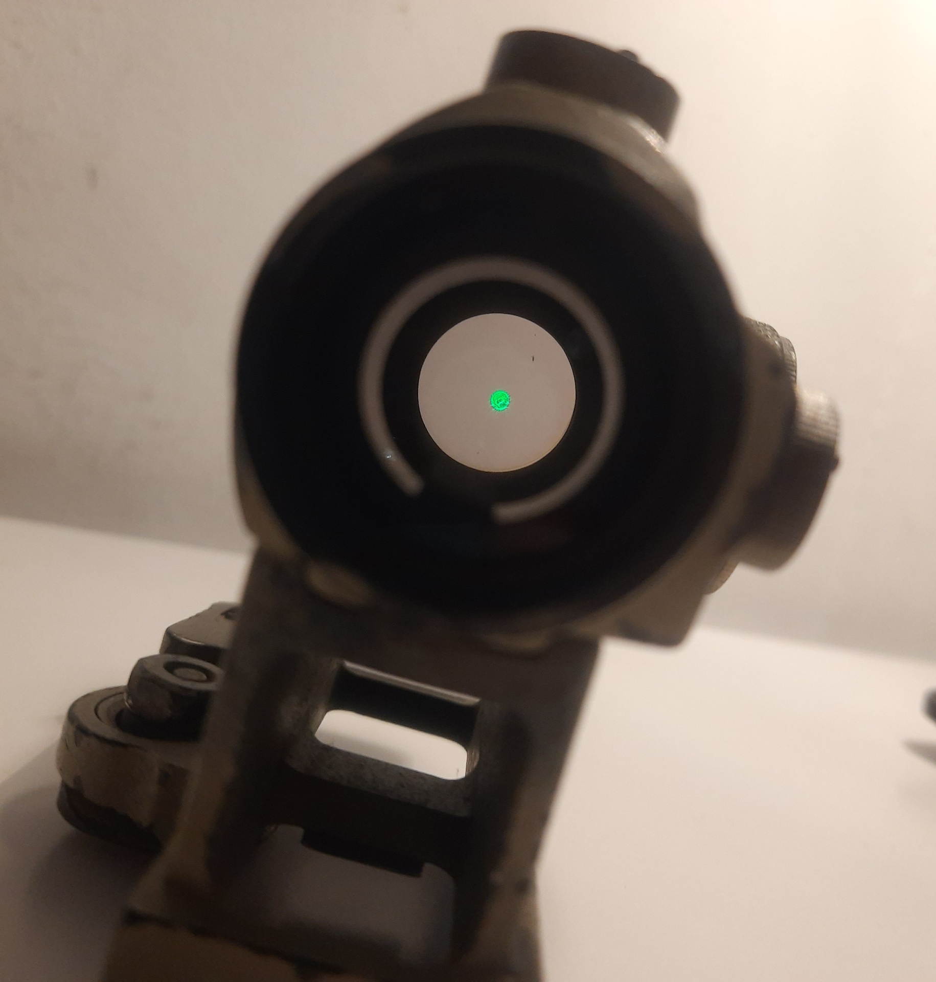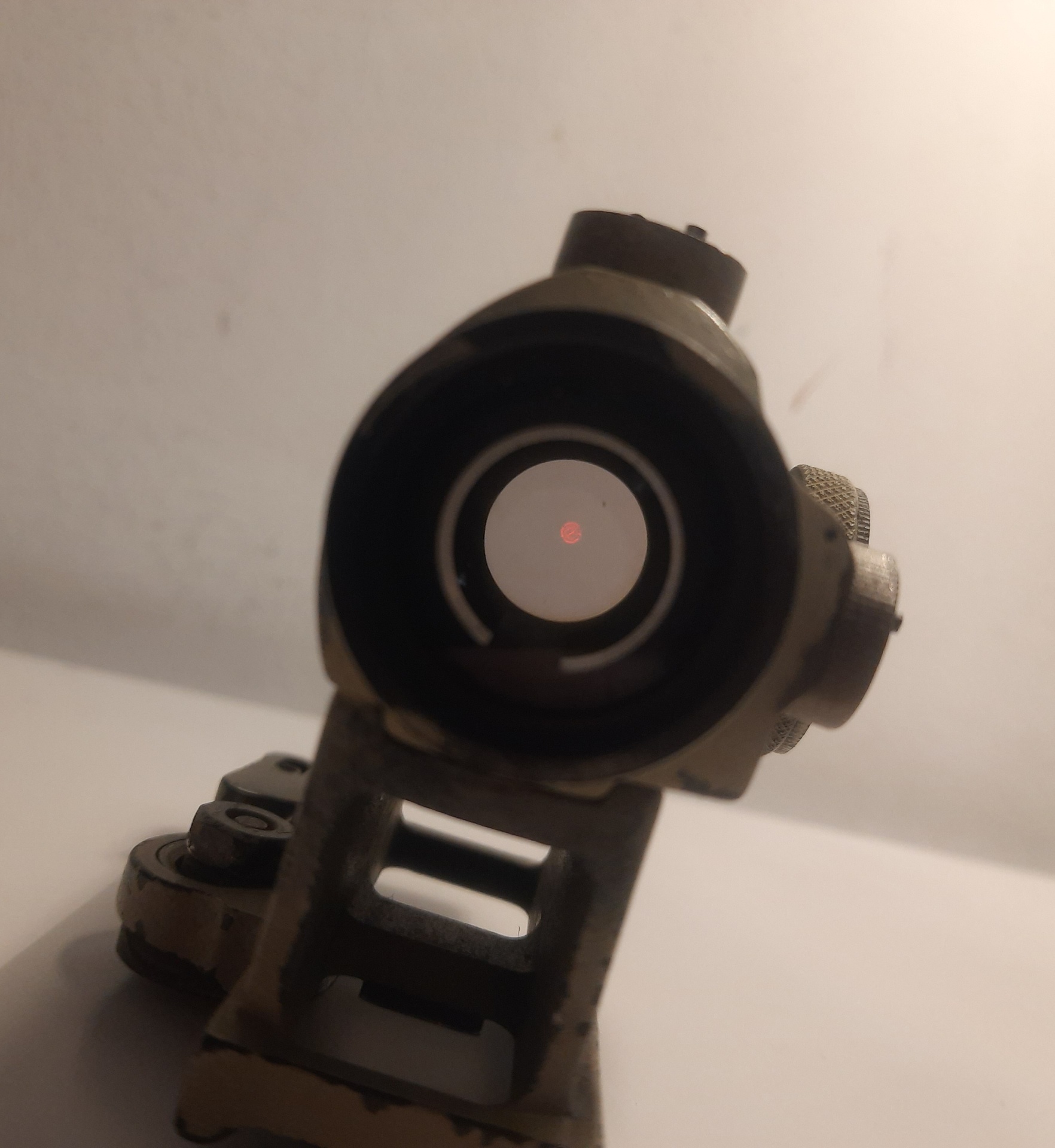 Kolimator t1, sprawny, regulacja działa prawidłowo, 5 stopni jasności na dwóch kolorach kropki, dorobiona osłonka z nakrętki od butelki