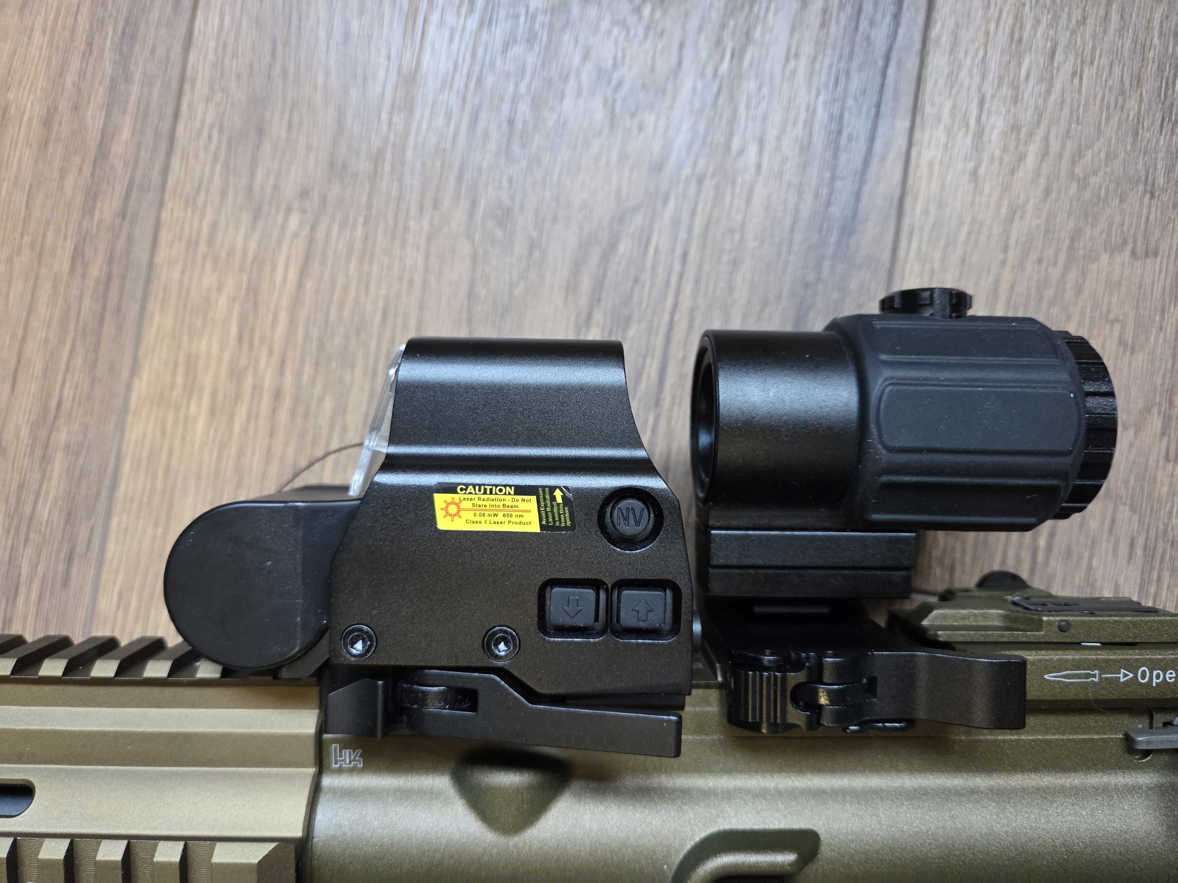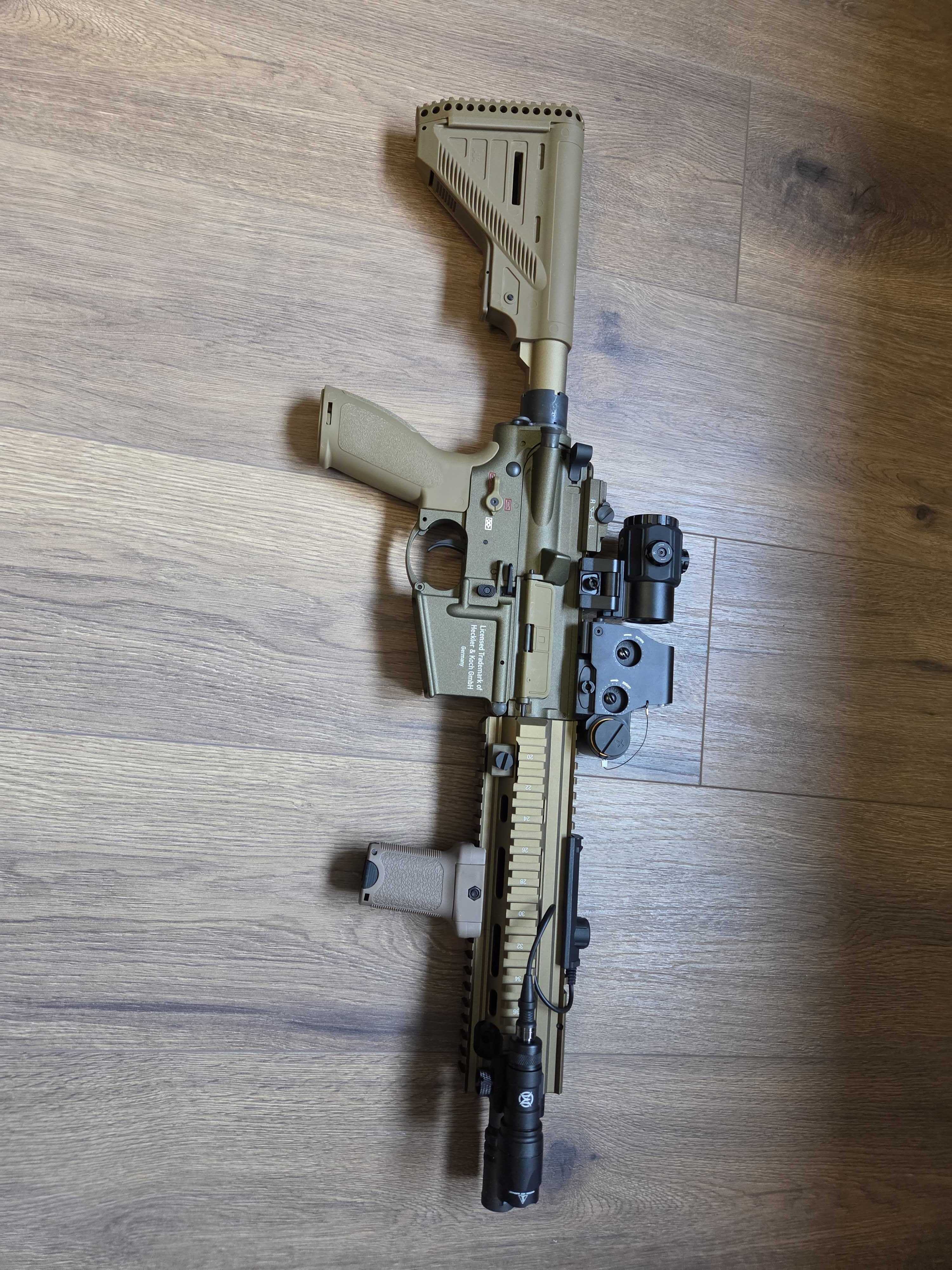 Sprzedaje nową replikę Umarex./VFC HK416 TAN zakupioną w Listopadzie zeszłego roku w sklepie Azteko.pl Replika została przestrzelana jakieś 80 kulek. Generuje 300 FPS / 1J. Sprzedaje bo niestety nie mam czasu na zabawę a nie chce, żeby replika się kurzyła. W skład wchodzi: Replika Eotech + screen protector Replika 3x Magnifier Uchwyt przedni Big Dragon Tan Latarka z uchwytem żelowym Bateria Li-po Ładowarka do baterii. 5 magazynków SA Midcap 1 magazynek highcap Zapięcie jednopunktowe Oryginalne opakowanie Sprzedaje wszystko jako pakiet. Preferuje odbiór osobisty w Warszawie, z możliwością przejrzenia repliki.