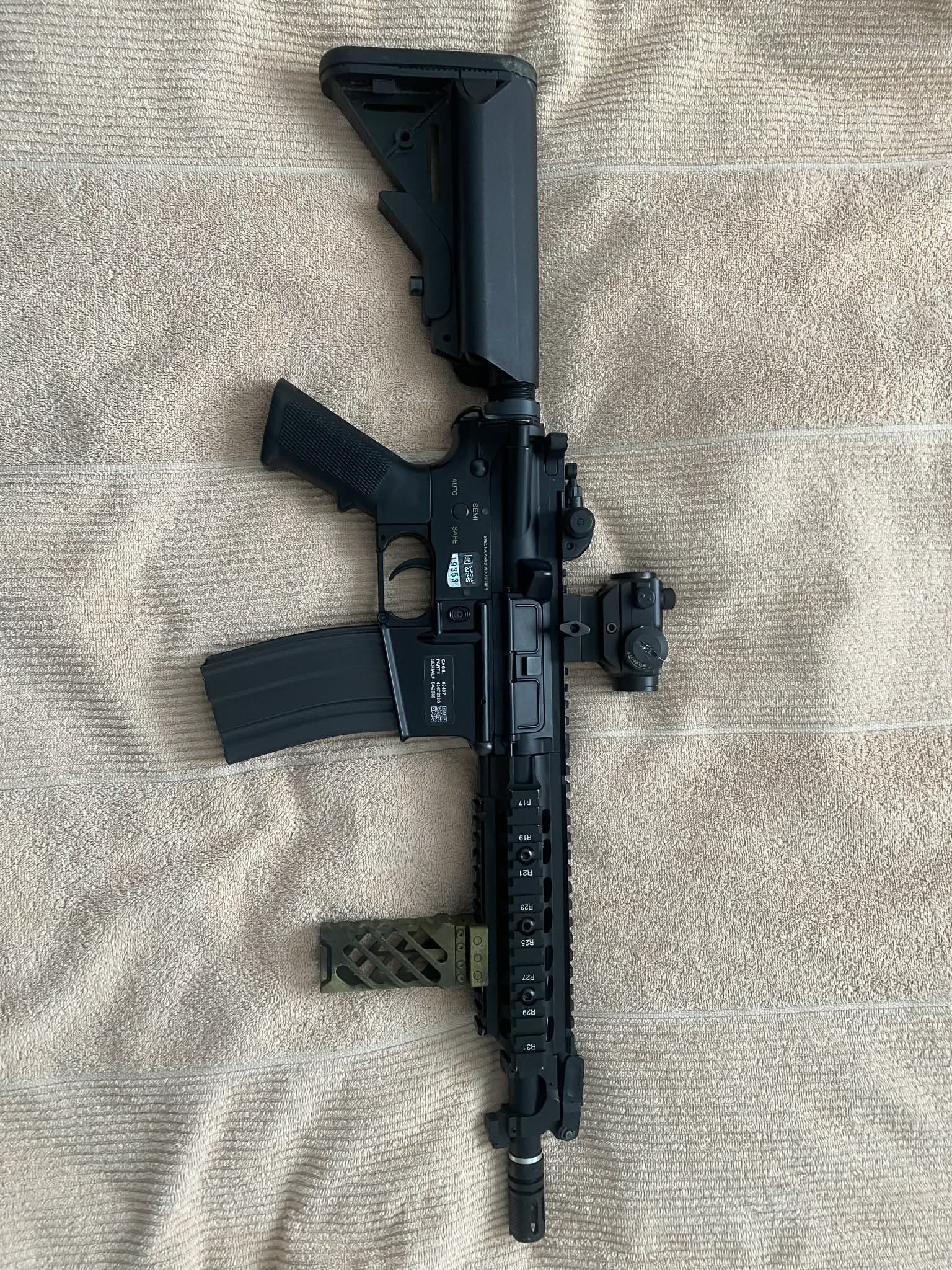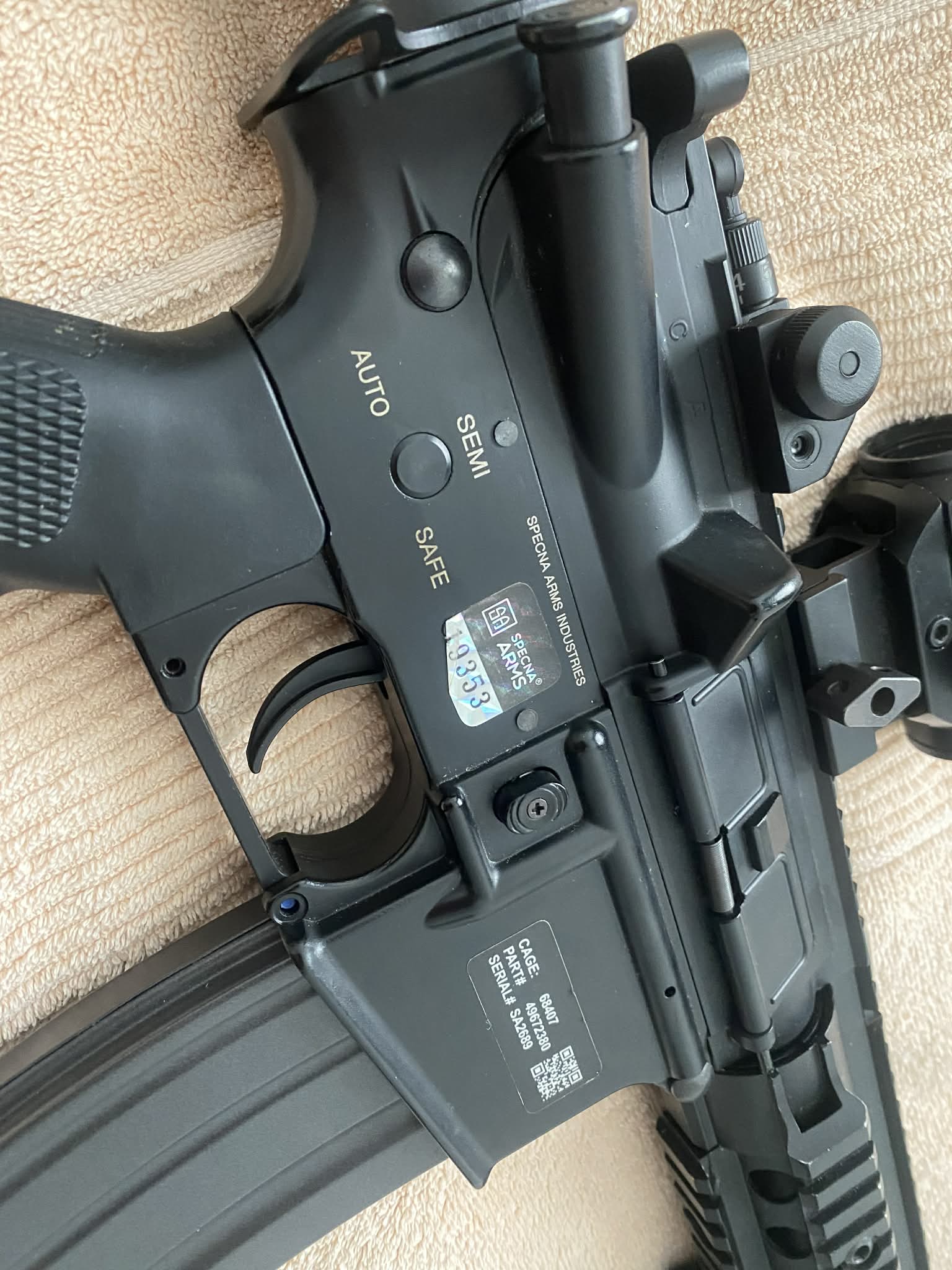Sprzedam karabin szturmowy ASG Specna Arms SA-B04 ONE™ - czarna. Praktycznie nieużywany, minimalna wada przy lufie (widoczna na zdjęciu) Sprzedaje wraz z celownikiem kolimatorowym (trzeba wymienić baterie), uchwytem poziomym, szybkoładowarką, baterią oraz ładowarką LiPo GFC Energy.