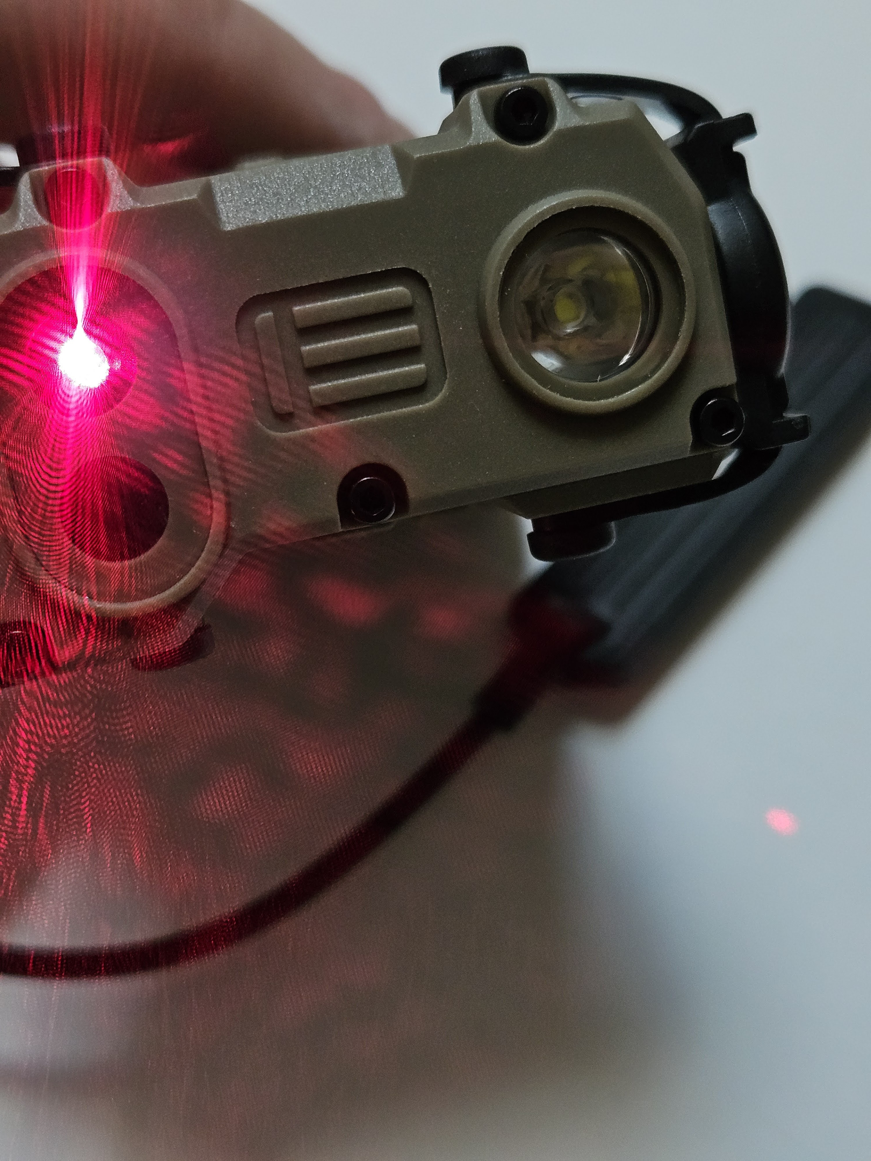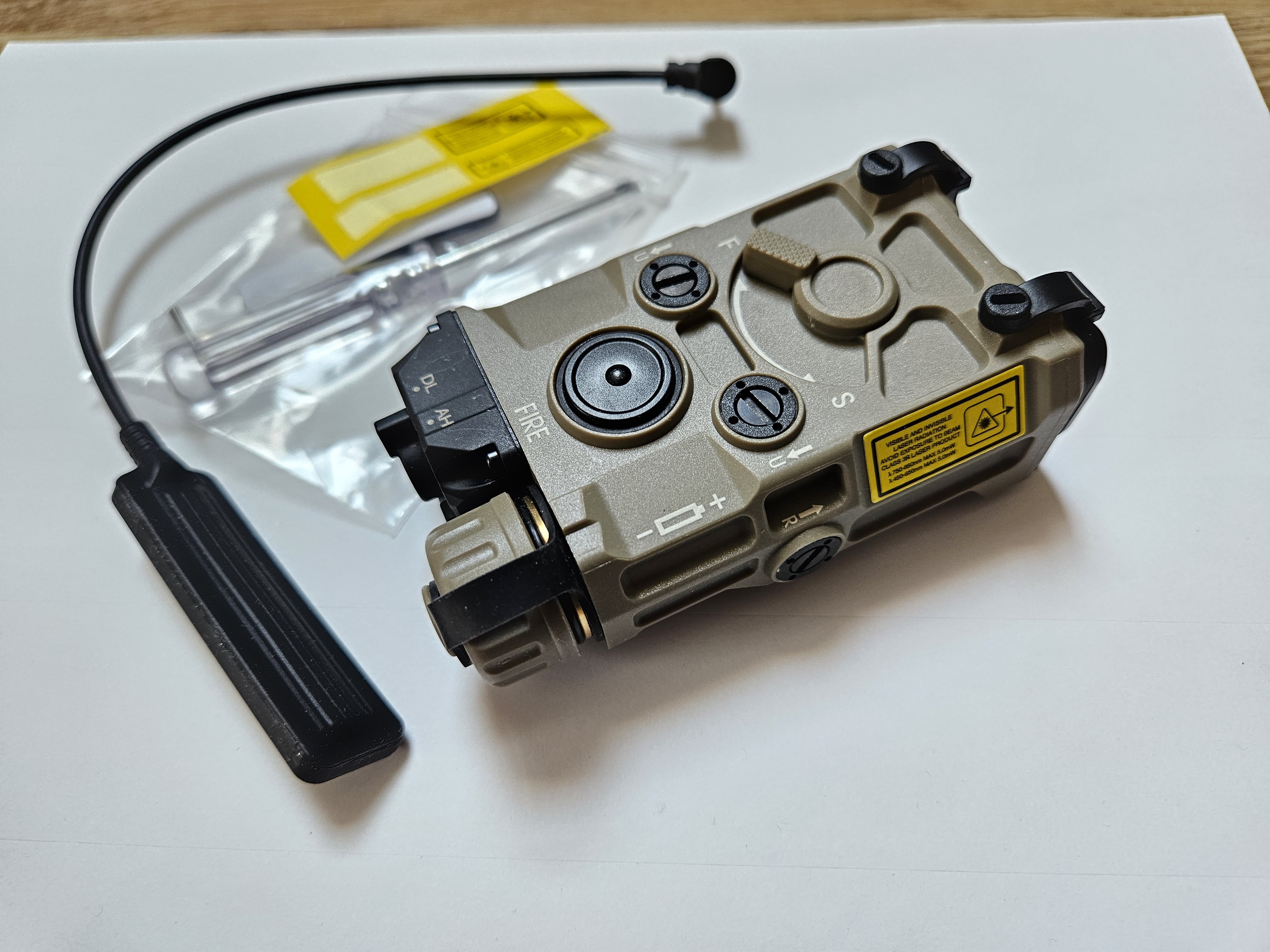Mam na sprzedaż replikę modułu OGl w kolorze Flat Dark Earth z oznaczeniami Eotecha. Moduł jest w pełni sprawny posiada czerwony laser z regulacja punktu świecenia prawo/lewo, góra/dół oraz latarkę w funkcja świecenia strobo. Funkcje możemy aktywować pojedynczo lub wspólnie, za pomocą przycisku na module lub poprzez dołączony przycisk żelowy na wtyczce jack 2,5mm. Całość jest wykonana z mocnego dobrej jakości kompozytu, niestety tylne pokrętło jest jedynie atrapą tryb świecenia wybieramy głównym przyciskiem.