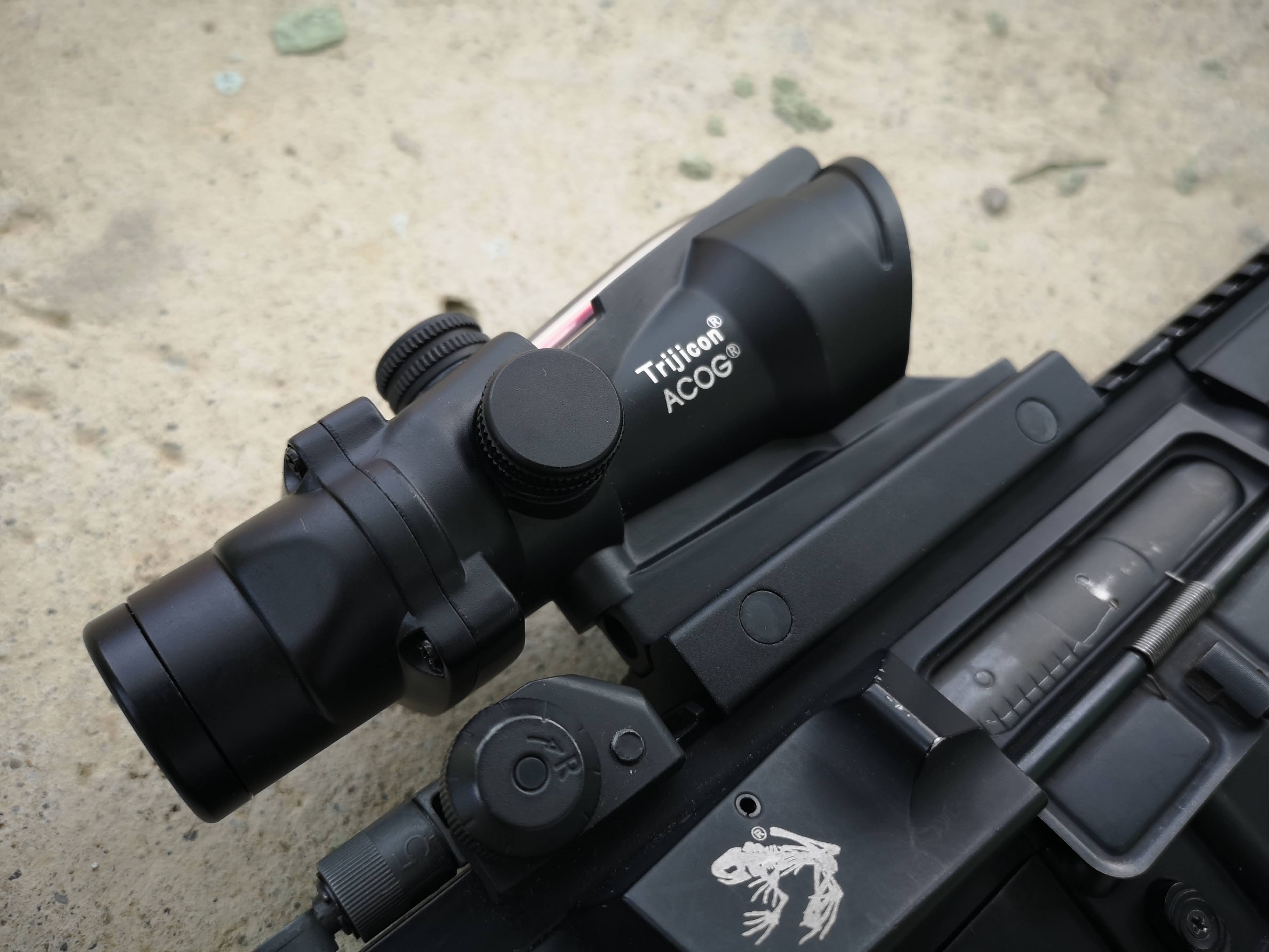 Sprzedam lunetę ACOG o stałym przybliżeniu 4x w wersji z działającym światłowodem który podświetla środek siatki na czerwono punkt w postaci "^" tzw chevron i nie wymaga zasilania z baterii ponieważ światłowód zbiera światło z otoczenia. Znacznie ułatwia i przyśpiesza to celowanie w ciemnym lesie gdzie czarna, siatka zlewa się z drzewami sprawdzone :). Luneta jest praktycznie jak nowa bez żadnych uszkodzeń, regulacja położenia krzyża działa nic nie jest uszkodzone. Na uwagę zasługuje komplet oznaczeń jak na palnych odpowiednikach.