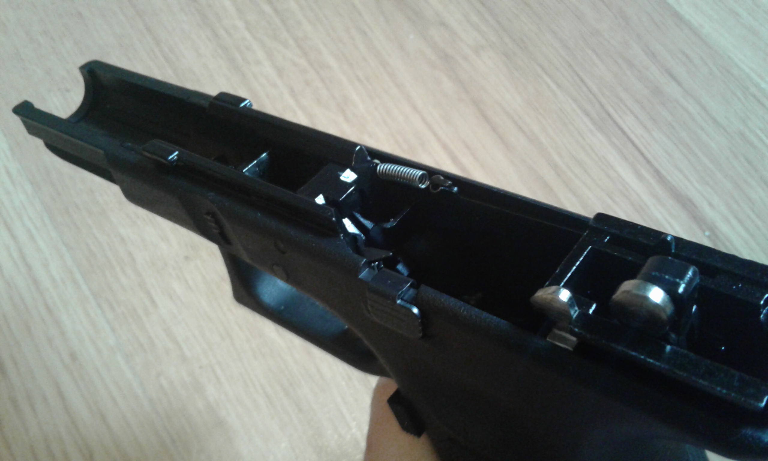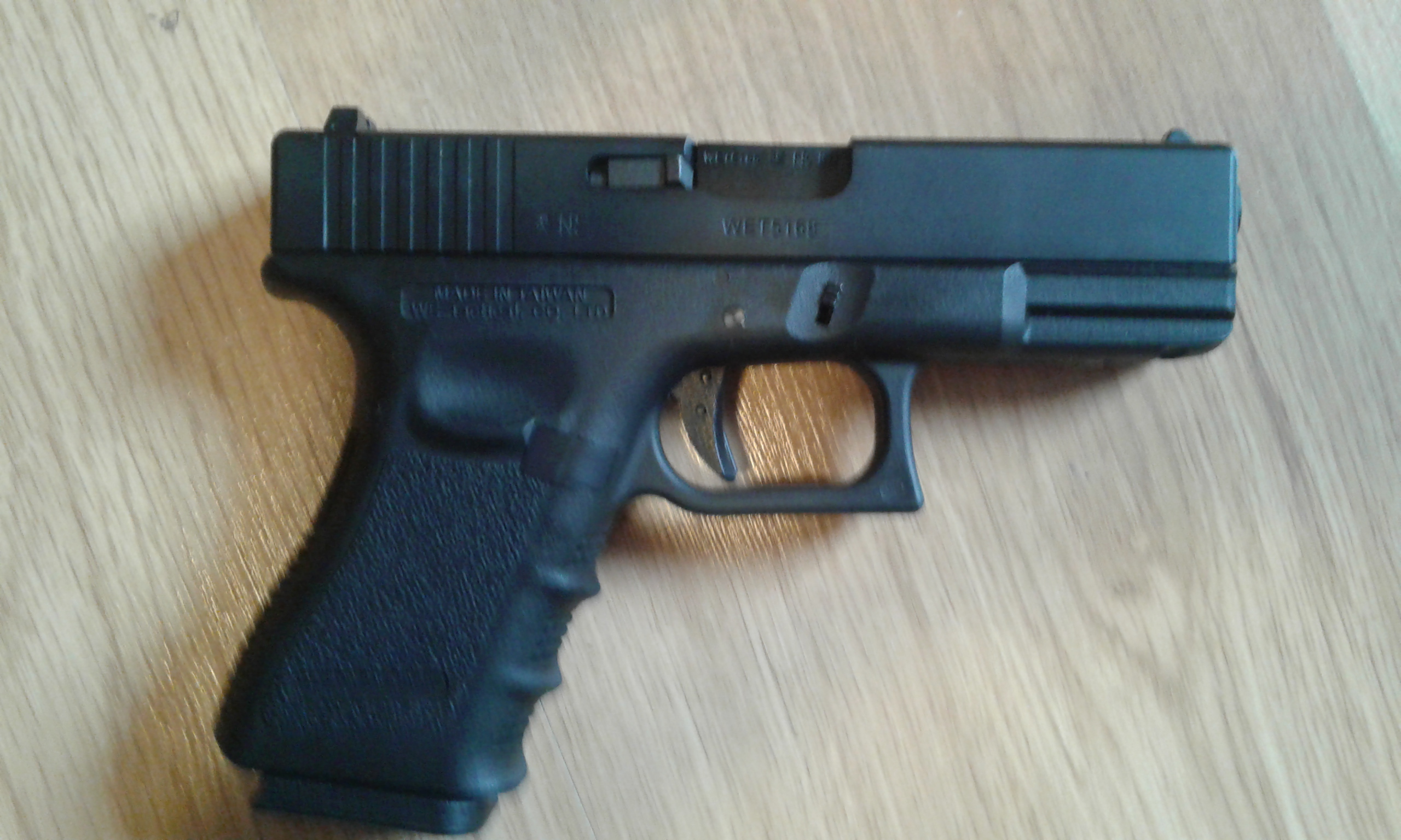 Sprzedam replikę ASG pistolet Glock 19 gen.3. Produkcja WE. Replika jest nowa, jedynie przetestowana – wystrzeliłem dosłownie jeden magazynek. Strzela celnie i osiowo. Replika w Polsce jest obecnie w zasadzie nieosiągalna – ten egzemplarz kupiłem w sklepie stacjonarnym na Słowacji. Wyboru dokonałem spośród kilku sztuk wybierając ten najlepiej spasowany. Sprzedaję w fabrycznym ukompletowaniu. Informacja dla miłośników poprawiania replik - komora HopUp w G19 od WE jest taka sama jak w G17.
