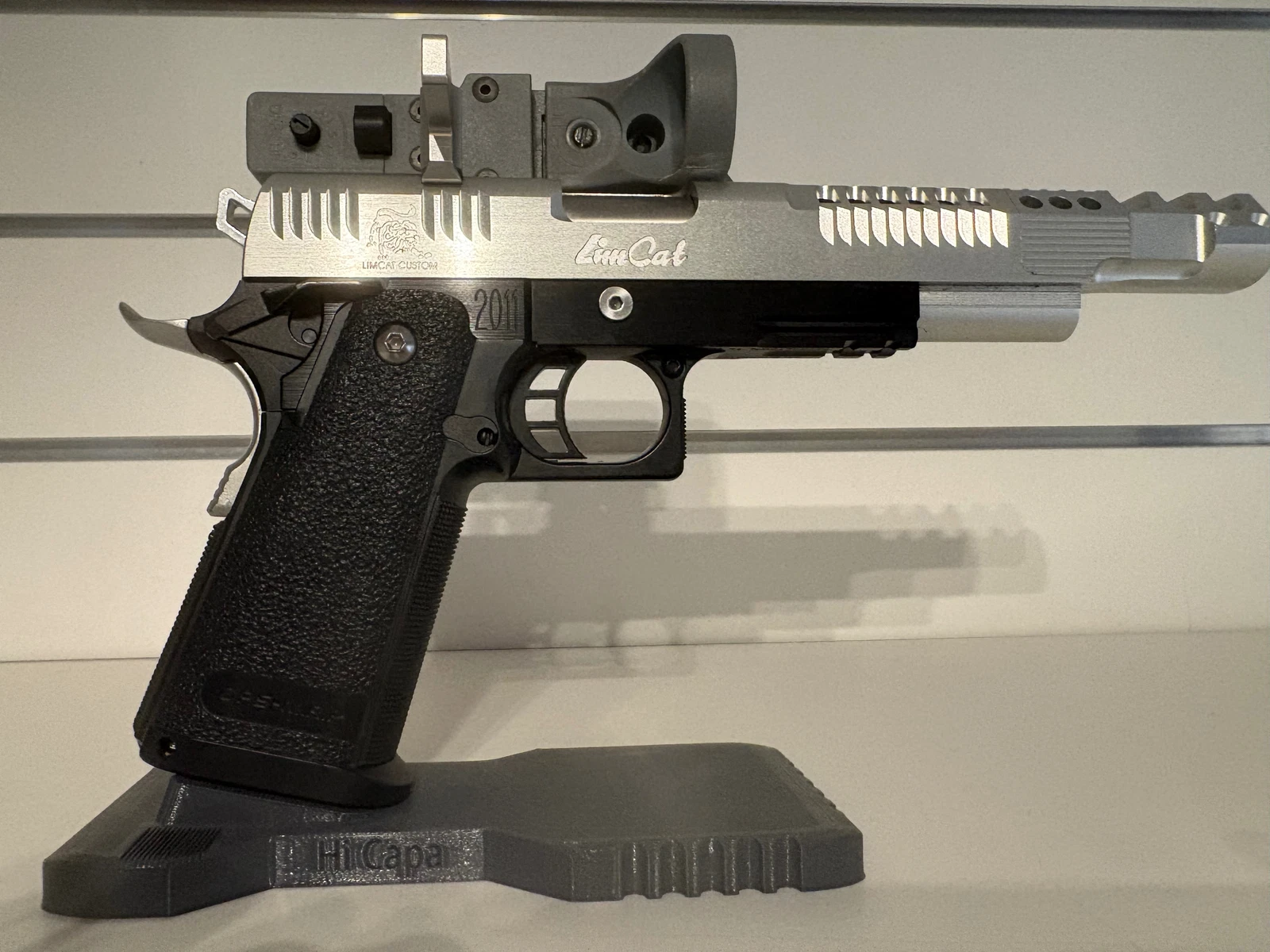 Zamek Limcat Dragoncat z zewnętrzną rękojeścią Comp , mocowaniem A-Depot 90, ramą Airsoft Masterpiece 2011 z zaawansowaną skrzynią na młotek, standardowym spustem i chwytem, 7-calową lufą wewnętrzną PDI, kolbą blowback, kolbą z zabezpieczeniem chwytu, kolbą z zabezpieczeniem kciuka.