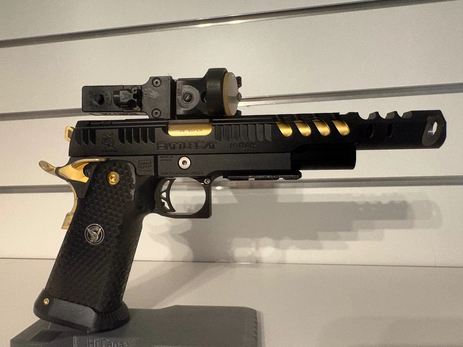 Zamek Airsoft Masterpiece Battle Cat H-bar z szyną zewnętrzną 5.1 z komponentami z rynku wtórnego, seryjny TM Fame, aluminiowy chwyt Elite. Mocowanie Adepot 90, Cmore, części wewnętrzne Masterpiece, Cowcow, PDI i innych marek, bezpieczniki AM Gold, o ile się nie mylę. Używany, ale w bardzo dobrym stanie.