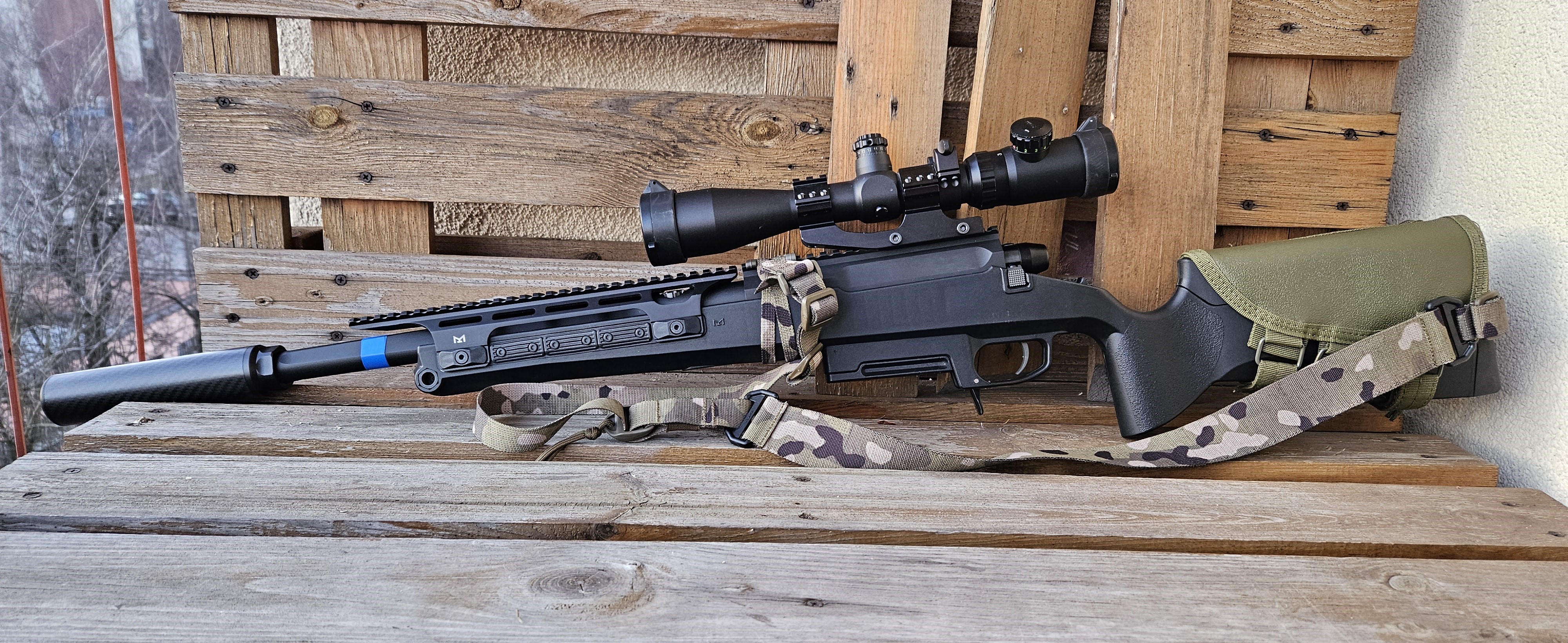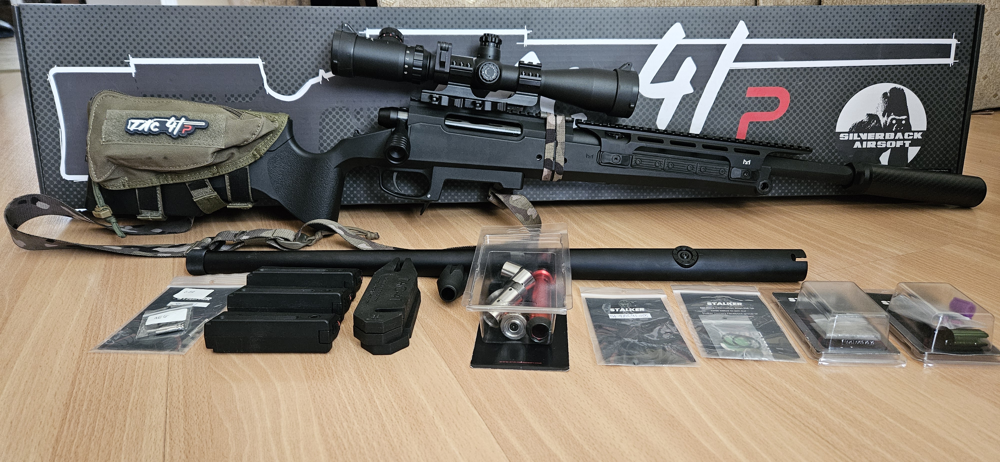 TAC-41P od Silverback Replika kupiona na Skirmshopie. Z czasem wleciał pełny zestaw od Stalkera: tłok, lufa, komora, stalowy bb holder. Wrzucona jest trójkątna lufa zewnętrzna 330mm co z carbonowym tłumikiem 175mm mieści lufę 420mm i w połączeniu z hamulcem na tłoku zyskujemy realne wytłumienie bez wydłużania repliki względem stocka. Lufa wewnętrzna ma przerobione okno tak, żeby współpracowała z szerokim dociskiem gumki Modify XRange. Lufa była przerabiana przez Dextera. Obecna konfiguracja: - tłok Stalker Scorpion z hamulcem GBB - lufa Stalker Morpheus 420mm z przerobionym oknem pod gumkę Modify XRange. - gumka Modify Xrange pomarańczowa - Komora Stalker Kraken TDC - sprężyna Rapax 3j+ - prowadnica sprężyny Stalker Całość generuje 3.2-3.3j na kulkach 0.48g. Jest to jedna z wielu replik jakie posiadam, więc w skali roku używana była sporadycznie, a po każdej grze czyszczona i smarowana. Zadbałem o równą i osiową pracę głowicy cylindra względem komory poprzez nowe pierścienie teflonowe, które zostały w odpowiednich miejscach wypodkładkowane tak, aby całość mechanizmu chodziła gładko i powtarzalnie atakowała gumkę. Sprzedaję kompletny zestaw z możliwością przebudowania repliki wedle uznania. Z repliką w zestawie są: - 3 magazynki pojemności 48 kulek każdy - luneta visionking 3-9x42 z osłonką i montażem Vector Optics - zawieszenie z możliwością szybkiej regulacji - ładownica na kolbę mieszcząca 1 magazynek - aluminiowy front - podkładki dystansowe do kolby - dłuższy hamulec na tłok + 2 dodatkowe dedykowane do komory AEG - pozostałe elementy zestawu tłoka Scorpion: ciężarki, oringi, druga głowica - dodatkowy zestaw do tłoka i komory ze śrubkami, oringami i zderzakiem tłoka Do tego dorzucam stockowe części: tłok, komora i lufa AEG 510mm, lufa zewnętrzna 510mm, prowadnica sprężyny oraz resztę kulek 0.48g jakie mi zostały. Kupujesz więc gotową do gry replikę z możliwością przebudowania jej pod swoje upodobania, w tym pod standard AEG jeśli taki wolisz.
