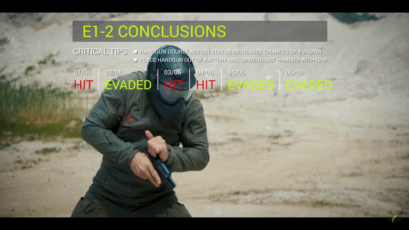 Test ten poddaje w wątpliwość wiele “sposobów” na odebranie broni przeciwnikowi. Ukazuje, że nigdy nie można być pewnym rezultatu takiego zabiegu. Zwłaszcza wtedy, gdy broń jest w pełni gotowa do strzału, a napastnik zostanie zaskoczony i natychmiastowo pociągnie za spust. Jeśli nie jest to sytuacja w której nie mamy wyboru, a oddanie napastnikowi portfela sprawę załatwi, to ryzyko może okazać się zbyt wielkie aby go podjąć.
