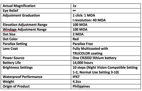 Kropka celownika posiada rozmiary 2 MOA, z jej przeskokami o 1 MOA w trakcie jej regulowania. Posiada też 10 stopniową regulację jasności, gdzie pierwszy poziom jest na tyle ciemny, aby kolimator mógł współpracować z urządzeniami noktowizyjnymi.