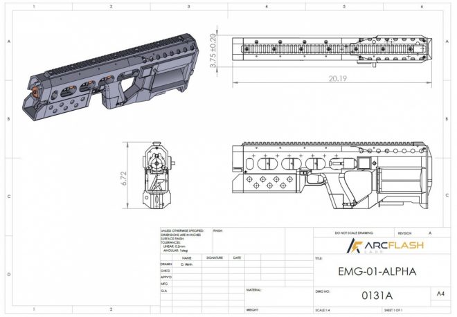 Jako amunicję wykorzystywać ma stalowe rdzenie o wymiarach 0.25×0.75 cala o wadze 4,6 g. Rozpędzać ma je do prędkości 45 metrów na sekundę, co owocować będzie energią kinetyczną na poziomie 4.65J. Lufa ma mieć długość 10 cali, a wymiary całości wynoszą 20.5” x 6.8” x 3.9” przy wadze 2.5kg.
