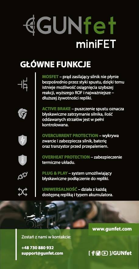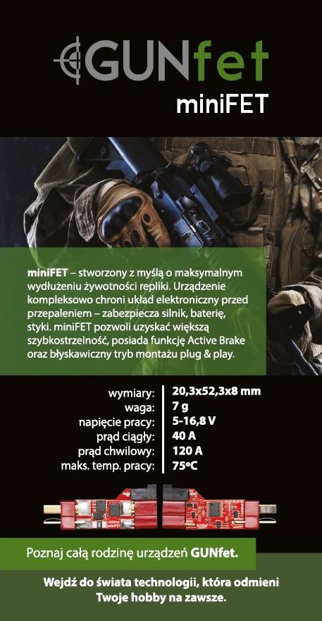 Nowy układ od firmy GUNfet charakteryzować się ma małymi wymiarami (20,3 x 52,3 x 8 mm) i niską wagą (7 gram), przy jednoczesnym dodaniu do niego najprzydatniejszych funkcji. Dzięki montażowi typu plug&play, ma on być łatwy w instalacji. Będzie w pełni kompatybilny praktycznie z każdą repliką i dowolnym akumulatorem z przedziału 5-16,8 V, jedynym wymogiem jest posiadanie złącz t-connect i odpowiedniej ilości miejsca na całość. Umożliwia pracę z prądem stałym o natężeniu 40 A, a chwilowym 120 A. Układ jest w stanie wytrzymać temperaturę do 75 stopni C.