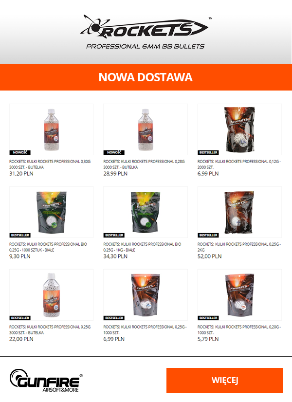 Kolejna dostawa obejmuje kulki Rockets Professional. Odnaleźć można wśród nich wersję BIO, oraz różne wielkości opakowań od małych (1000 sztuk) po 25 kilogramowe worki.
