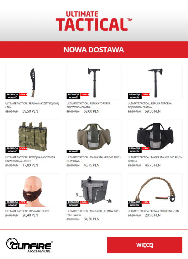 Do magazynu dotarło ponad 400 produktów od Ultimate Tactical. Wśród nich znaleźć można kamizelki, pasy nośne, maski ochronne, ładownice, pasy, kaski X-Shield oraz wiele innych.